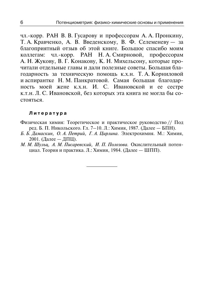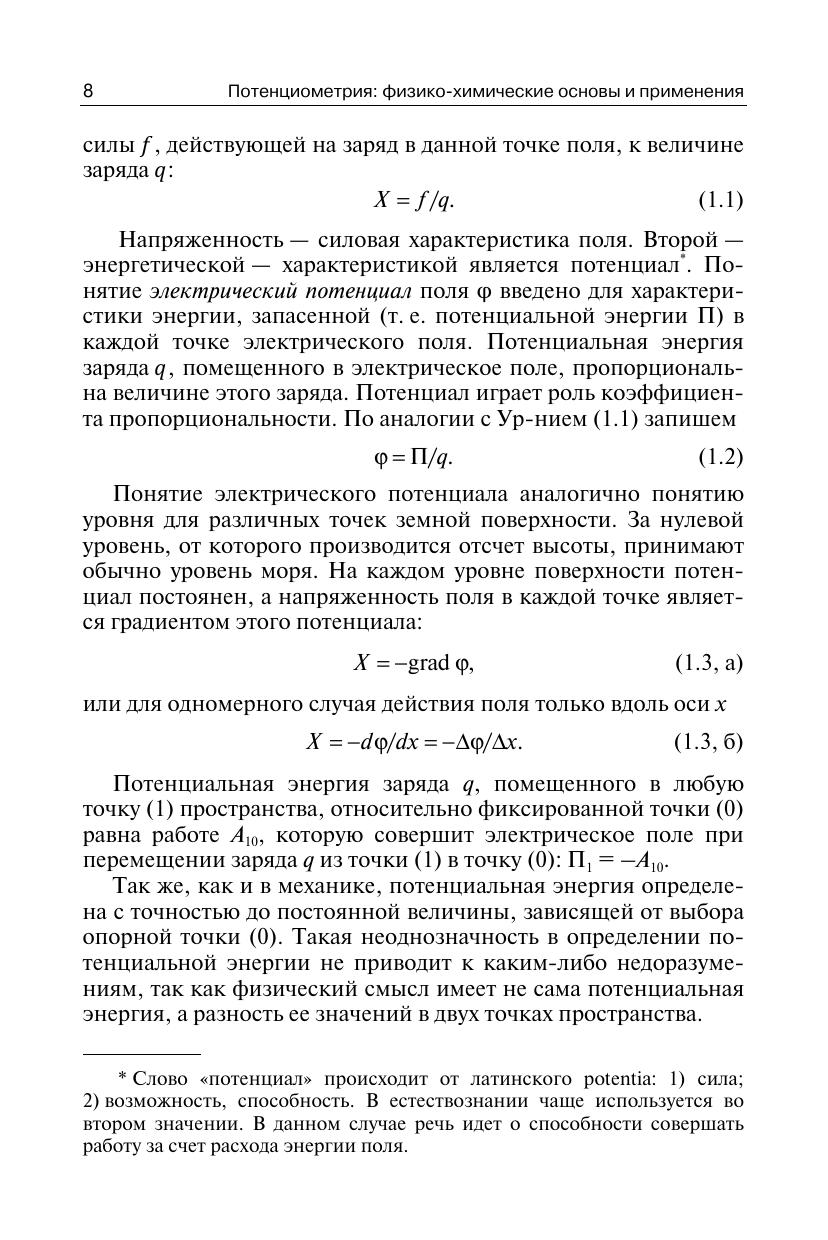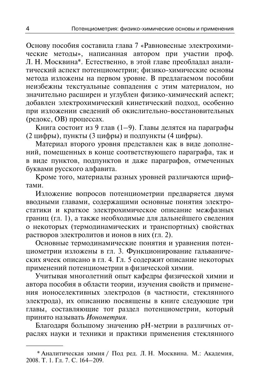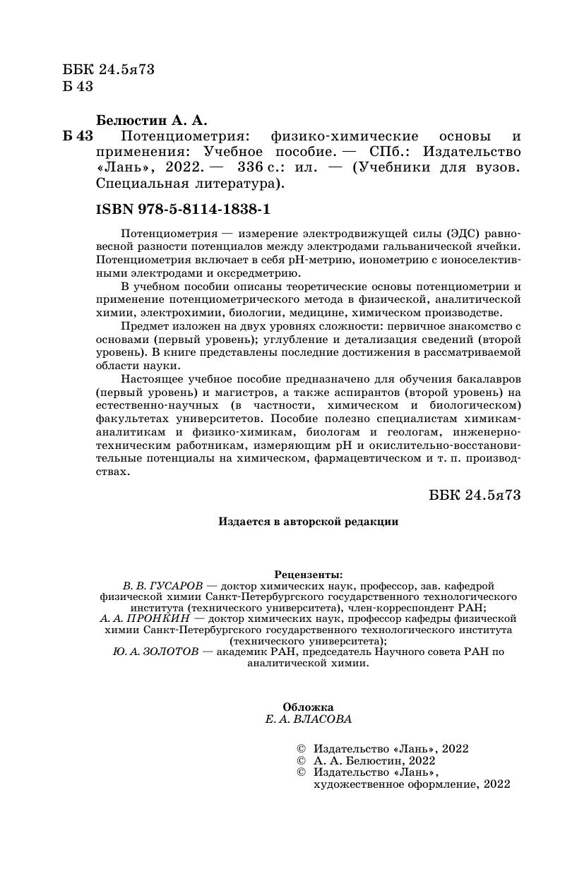 Потенциометрия – измерение электродвижущей силы (ЭДС) равновесной разности потенциалов между электродами гальванической ячейки. Потенциометрия включает в себя рН-метрию, ионометрию с ионоселективными электродами и оксредметрию. В учебном пособии описаны теоретические основы потенциометрии и применение потенциометрического метода в физической, аналитической химии, электрохимии, биологии, медицине, химическом производстве. Предмет изложен на двух уровнях сложности:первичное знакомство с основами (первый уровень), углубление и детализация сведений (второй уровень). В книге представлены последние достижения в рассматриваемой области науки. Настоящее учебное пособие предназначено для обучения бакалавров (первый уровень) и магистров, а также аспирантов (второй уровень) на естественно-научных (в частности, химическом и биологическом) факультетах университетов. Пособие полезно специалистам химикам-аналитикам и физико-химикам, биологам и геологам, инженерно-техническим работникам, измеряющим рН и окислительно-восстановительные потенциалы на химическом, фармацевтическом и т. п. производствах.