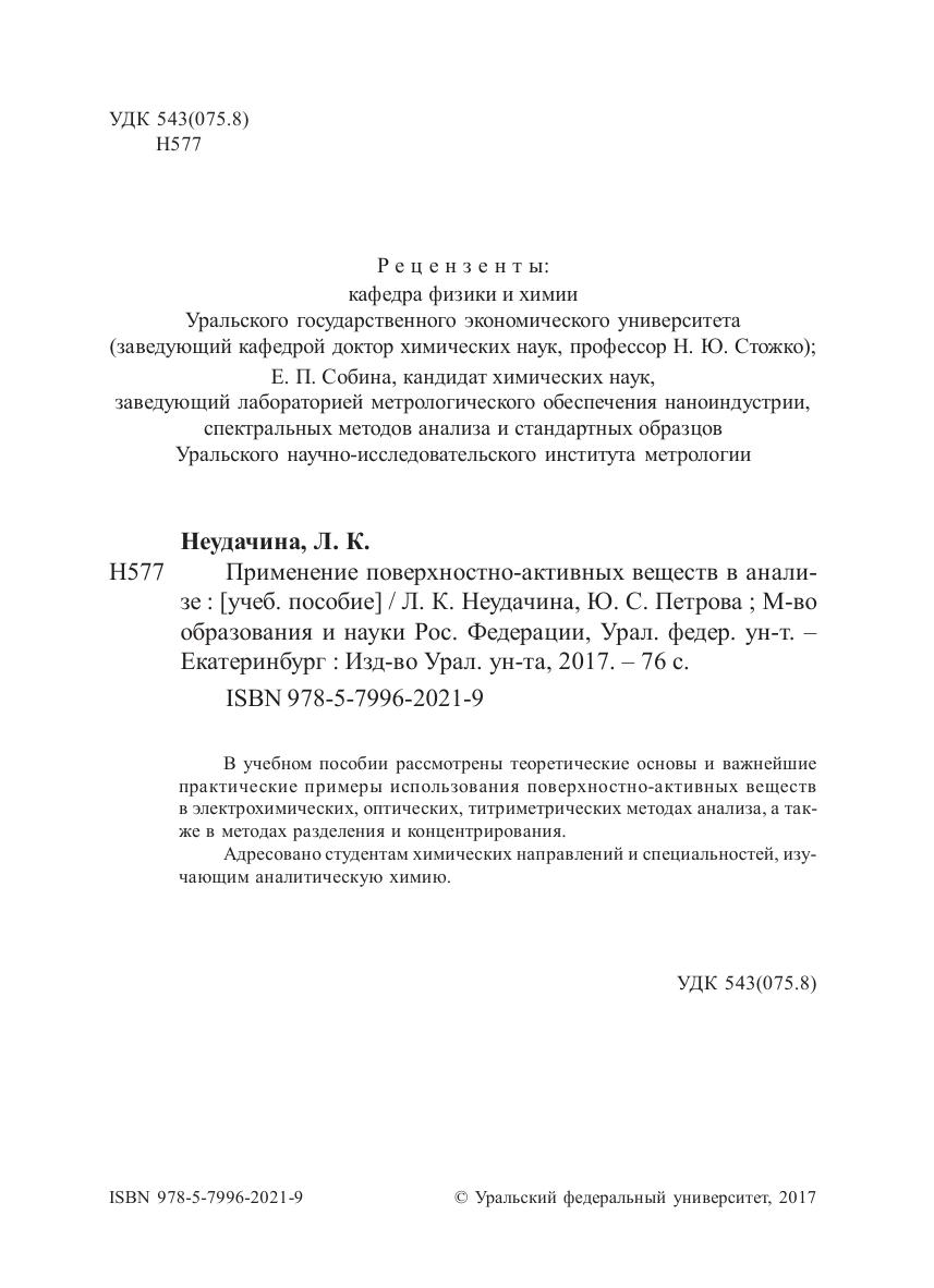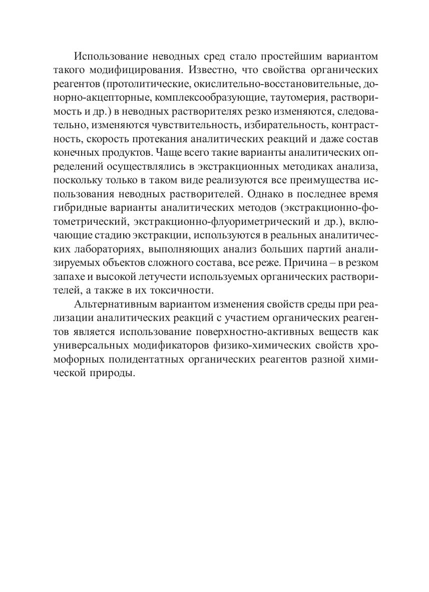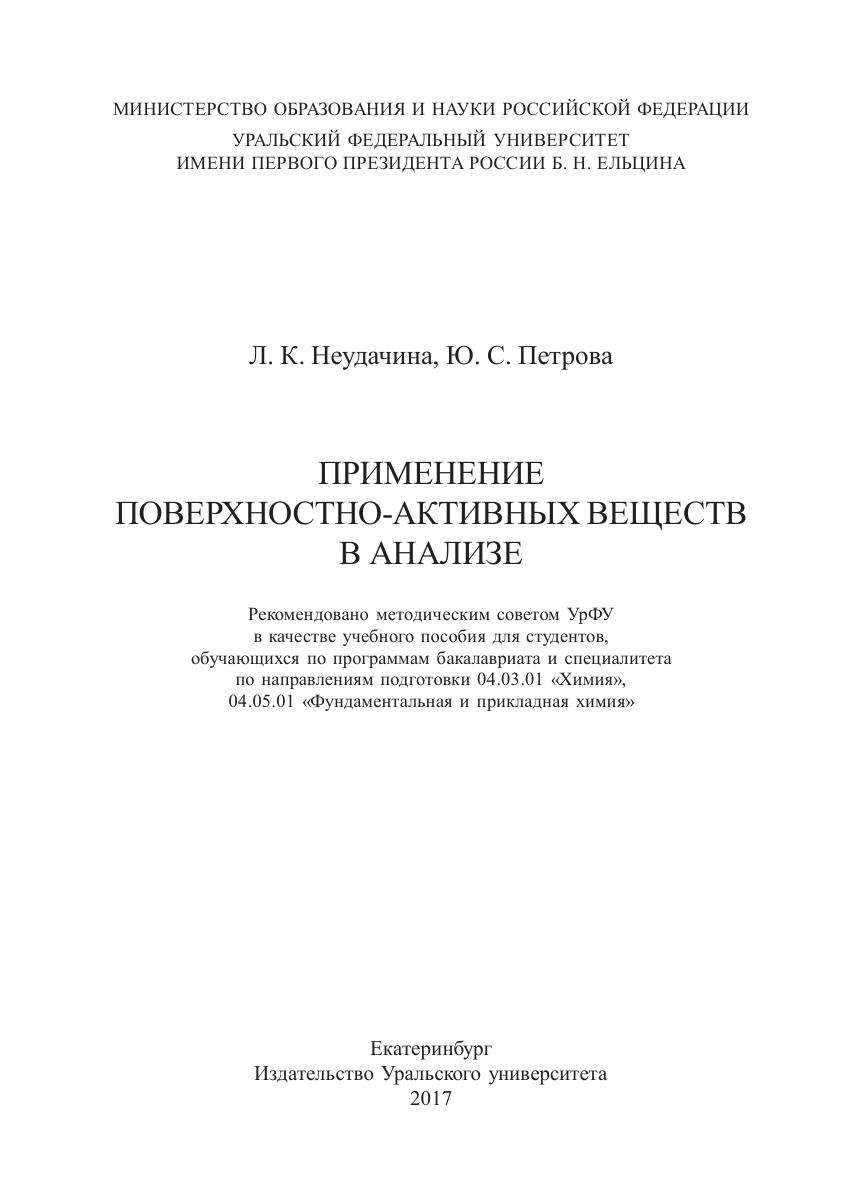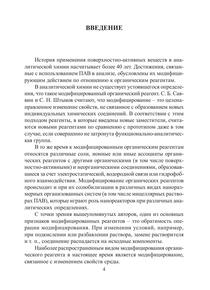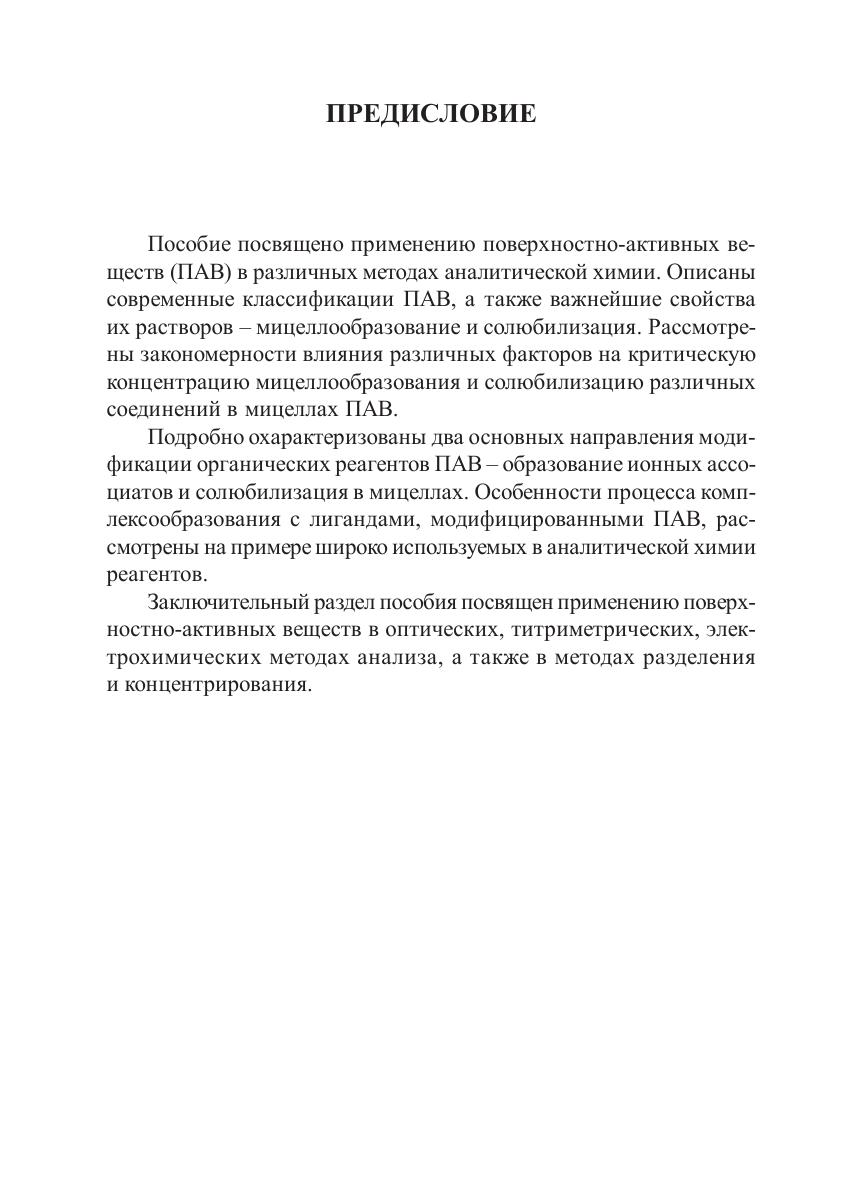 В учебном пособии рассмотрены теоретические основы и важнейшие практические примеры использования поверхностно-активных веществ в электрохимических, оптических, титриметрических методах анализа, а также в методах разделения и концентрирования. Адресовано студентам химических направлений и специальностей, изучающим аналитическую химию.
