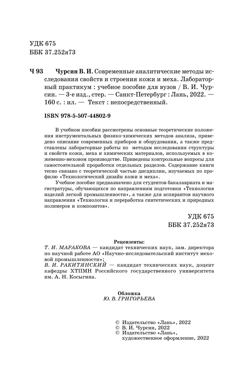 В учебном пособии рассмотрены основные теоретические положения инструментальных физико химических методов анализа, приведено описание современных приборов и оборудования, а также представлены лабораторные работы по методам исследования структуры и свойств кожи, меха и химических материалов, используемых в кожевенно меховом производстве. Приведены контрольные вопросы для самостоятельной проработки отдельных разделов. Содержание книги тесно связано с теоретической частью дисциплин, изучаемых по профилю «Технологический дизайн кожи и меха». Учебное пособие предназначено для студентов бакалавриата и магистратуры, обучающихся по направлениям подготовки «Технология изделий легкой промышленности», а также для аспирантов научного направления «Технология и переработка синтетических и природных полимеров и композитов».