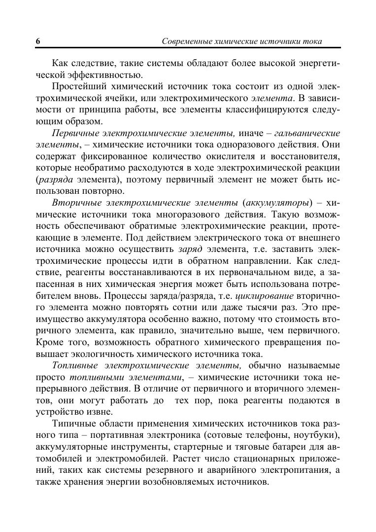 Представлены основы теории электрохимической энергоконверсии, а также описаны принципы работы, базовые конструкции и физико-химические особенности функционирования современных химических источников тока: солевых и щелочных гальванических элементов с цинковым или литиевым анодом, свинцово-кислотных, никельметаллогидридных, литий-ионных вторичных элементов и аккумуляторов для крупномасштабного хранения энергии, а также низко- и высокотемпературных топливных элементов. Книга адресована студентам, обучающимся по направлениям «Химия», «Химия, физика и механика материалов», «Фундаментальная и прикладная химия», «Химическая технология».