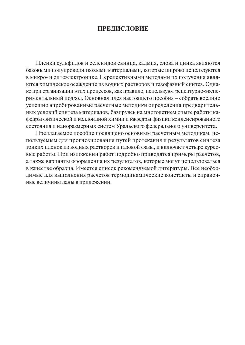 В учебном пособии изложены теоретический материал и алгоритмы выполнения курсовых работ, предлагаемых студентам по ряду профильных дисциплин, связанных с прогнозированием условий и проведением процесса осаждения полупроводниковых пленок на основе халькогенидов металлов и других сопутствующих фаз. Приведены необходимый для выполнения расчетов обширный справочный материал, рекомендации по содержанию и оформлению отчетов. Исходя из известных рабочих рецептур, подобраны различные варианты индивидуальных заданий по курсовым работам. Предназначено для студентов бакалавриата и магистрантов, обучающихся по программе «Химическая технология материалов электроники, сенсорной аналитики и неорганических веществ», будет полезно аспирантам различных специальностей и преподавателям вузов.