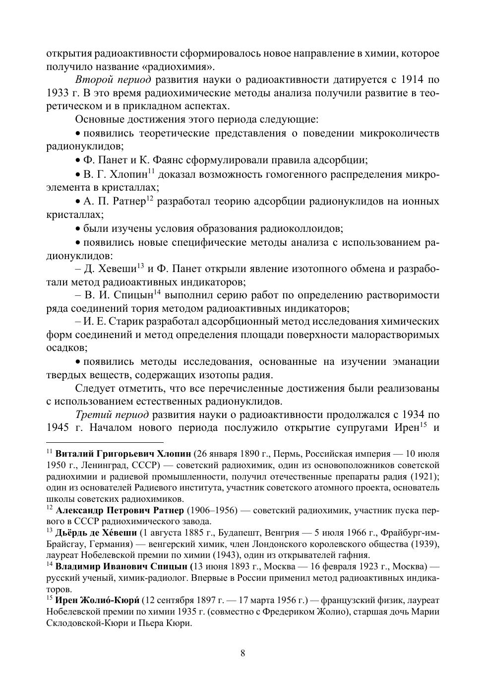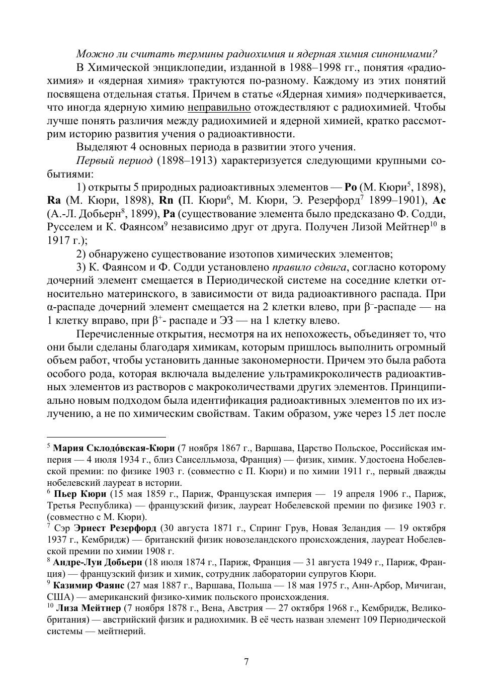 Материал, изложенный в книге, будет полезен при подготовке специалистов в различных областях ядерной отрасли. Глава I посвящена рассмотрению понятий «радиохимия» и «ядерная химия». В главе II рассмотрено строение ядерной материи (протонов, нейтронов и атомных ядер), свойств атомных ядер, а также теоретических представлений о строении ядра. Главы III–VI посвящены теоретическим и прикладным аспектам явления изотопии. В частности, подробно изложены сведения о видах изотопных эффектов, изотопном обмене и способах разделения изотопов, рассмотрены промышленные методы обогащения урана. Глава VII посвящена ядерным реакциям, протекающим в естественных условиях (в атмосфере, литосфере, на звездах) и осуществляемым искусственно с помощью ускорителей. Представлены основные сведения о ядерных реакциях, включающие способы классификации, механизмы, тепловой эффект, энергетический порог, сечение, функции возбуждения. В главе VIII рассматривается проблема устойчивости ядер и вопрос о границах Периодической системы элементов. Приводится описание методов синтеза, выделения и идентификации трансурановых, траскюриевых и сверхтяжелых элементов.Книга предназначена студентам, обучающимся по направлениям подготовки и специальностям, входящим в УГСН «Химия», «Химические технологии» и другим направлениям, где предусмотрен курс ядерной химии либо радиохимии.