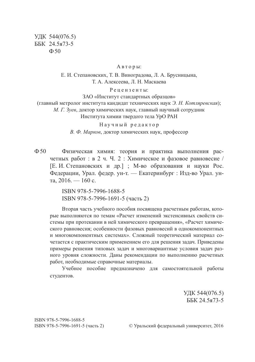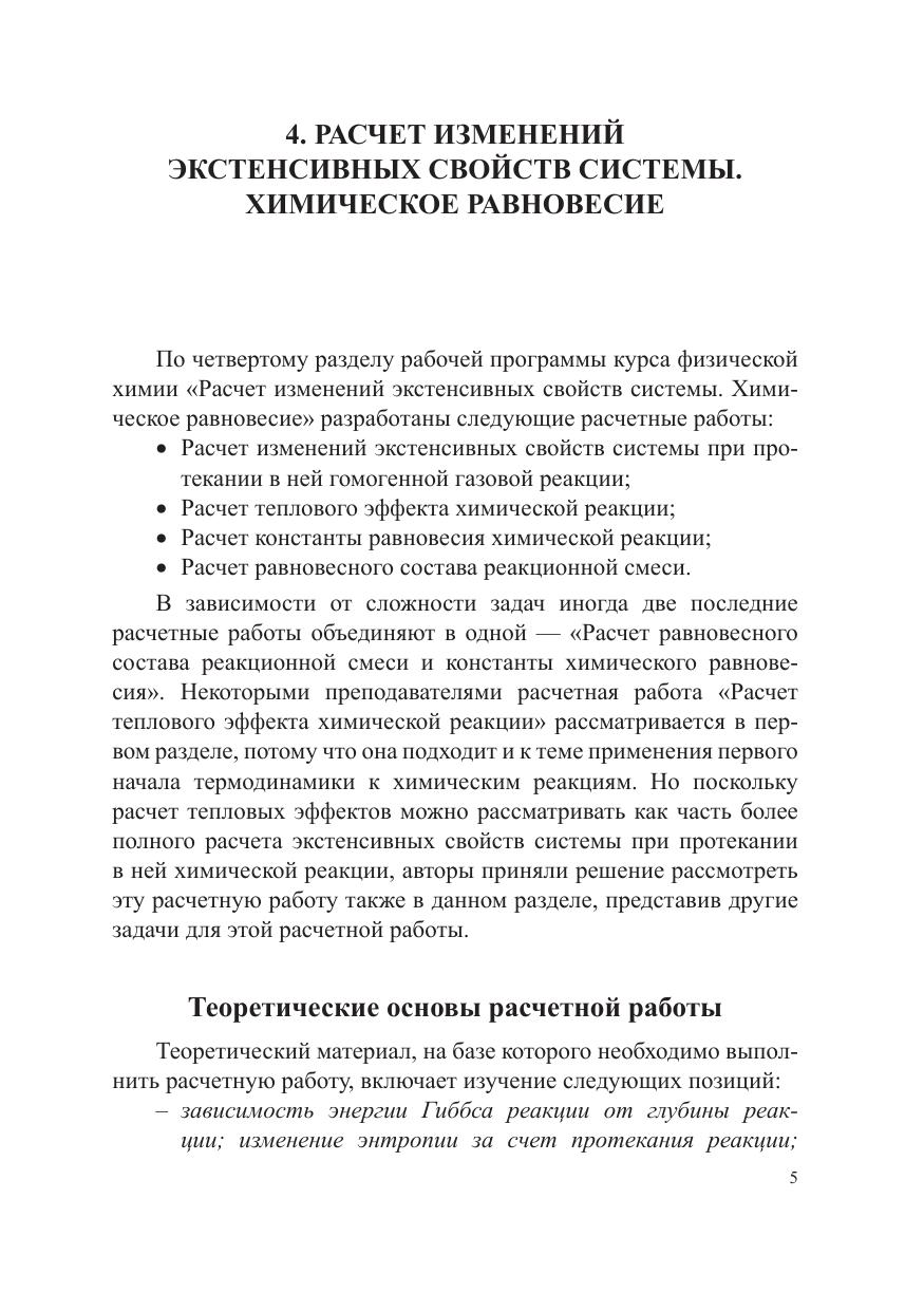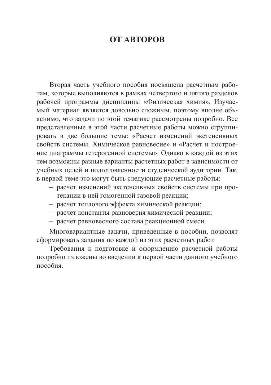 Вторая часть учебного пособия посвящена расчетным работам, которые выполняются по темам «Расчет изменений экстенсивных свойств системы при протекании в ней химического превращения», «Расчет химического равновесия; особенности фазовых равновесий в однокомпонентных и многокомпонентных системах». Сложный теоретический материал сочетается с практическим применением его для решения задач. Приведены примеры решения типовых задач и многовариантные условия задач разного уровня сложности. Даны рекомендации по выполнению расчетных работ, необходимые справочные материалы. Учебное пособие предназначено для самостоятельной работы студентов.