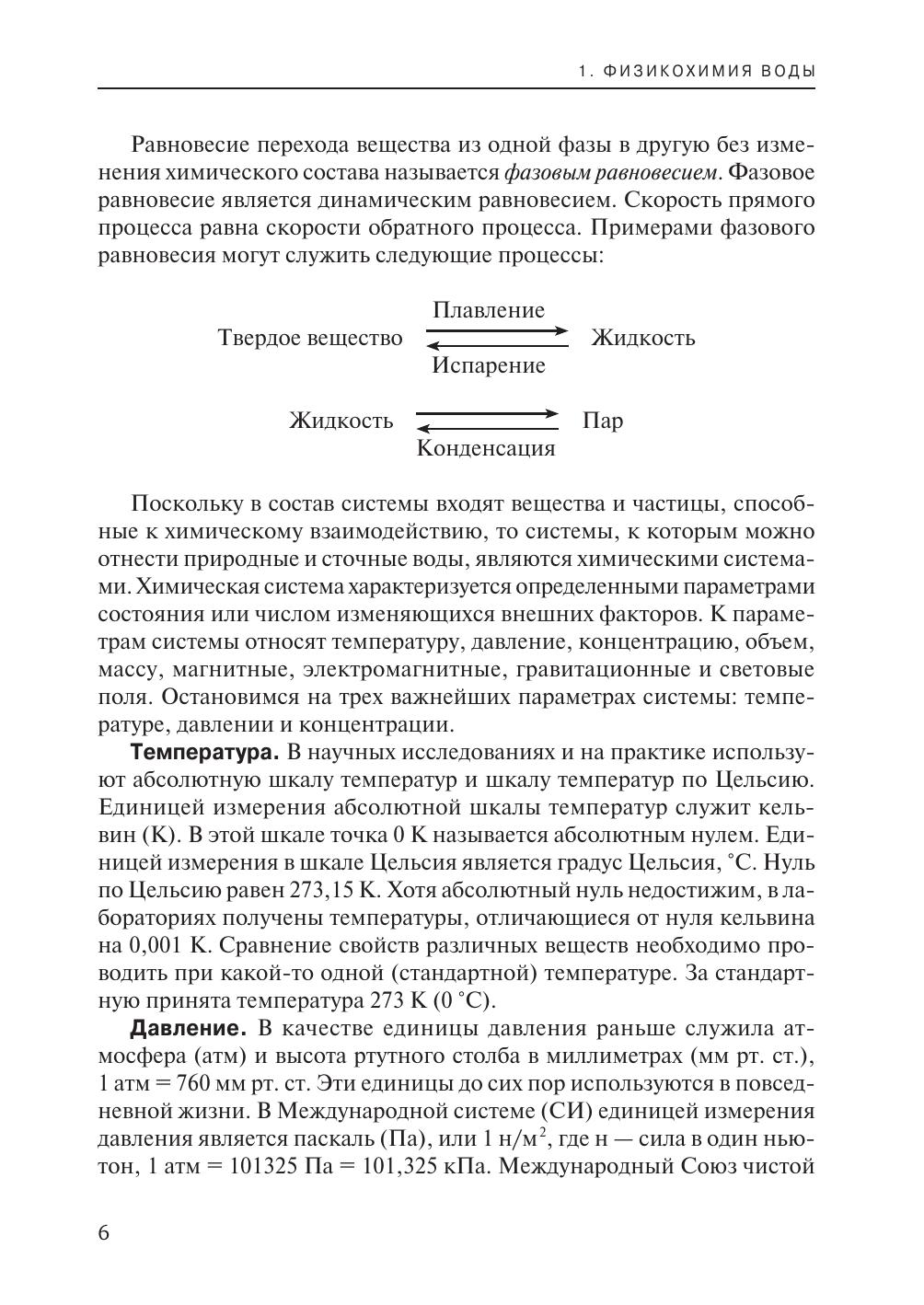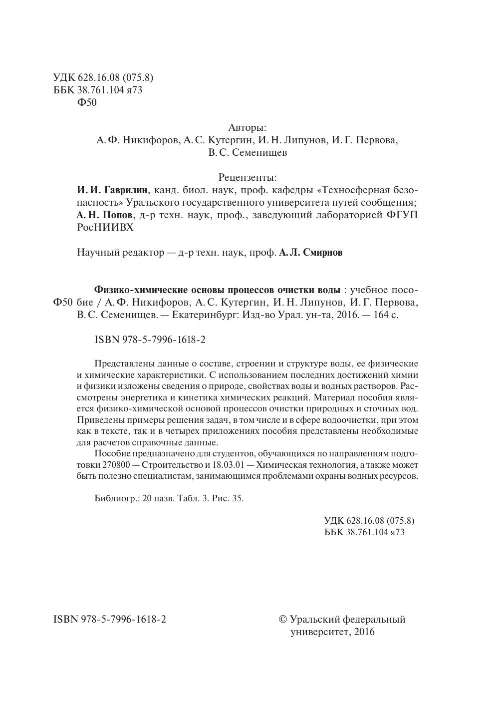 Представлены данные о составе, строении и структуре воды, ее физические и химические характеристики. С использованием последних достижений химии и физики изложены сведения о природе, свойствах воды и водных растворов. Рассмотрены энергетика и кинетика химических реакций. Материал пособия является физико-химической основой процессов очистки природных и сточных вод. Приведены примеры решения задач, в том числе и в сфере водоочистки, при этом как в тексте, так и в четырех приложениях пособия представлены необходимые для расчетов справочные данные. Пособие предназначено для студентов, обучающихся по направлениям подготовки 270800 — Строительство и 18.03.01 — Химическая технология, а также может быть полезно специалистам, занимающимся проблемами охраны водных ресурсов.