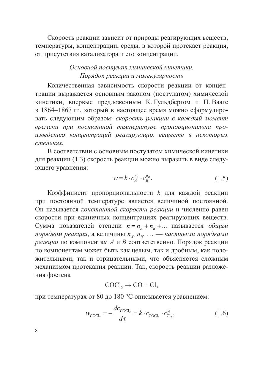 В учебном пособии даны основы формальной кинетики простых и сложных гомогенных реакций, рассмотрены особенности кинетики цепных, фотохимических, гетерогенных и каталитических реакций, изложены современные теоретические представления химической кинетики: теории активных соударений и переходного комплекса. Адресовано студентам химических факультетов университетов и химико-технологических институтов, изучающим дисциплину «Физическая химия».
