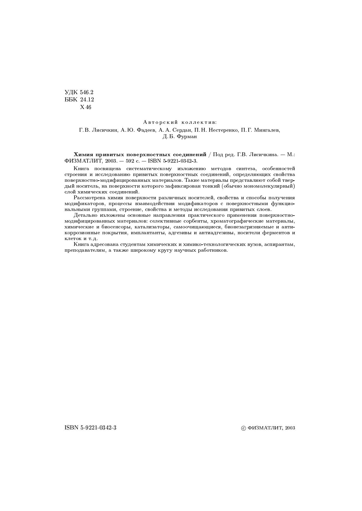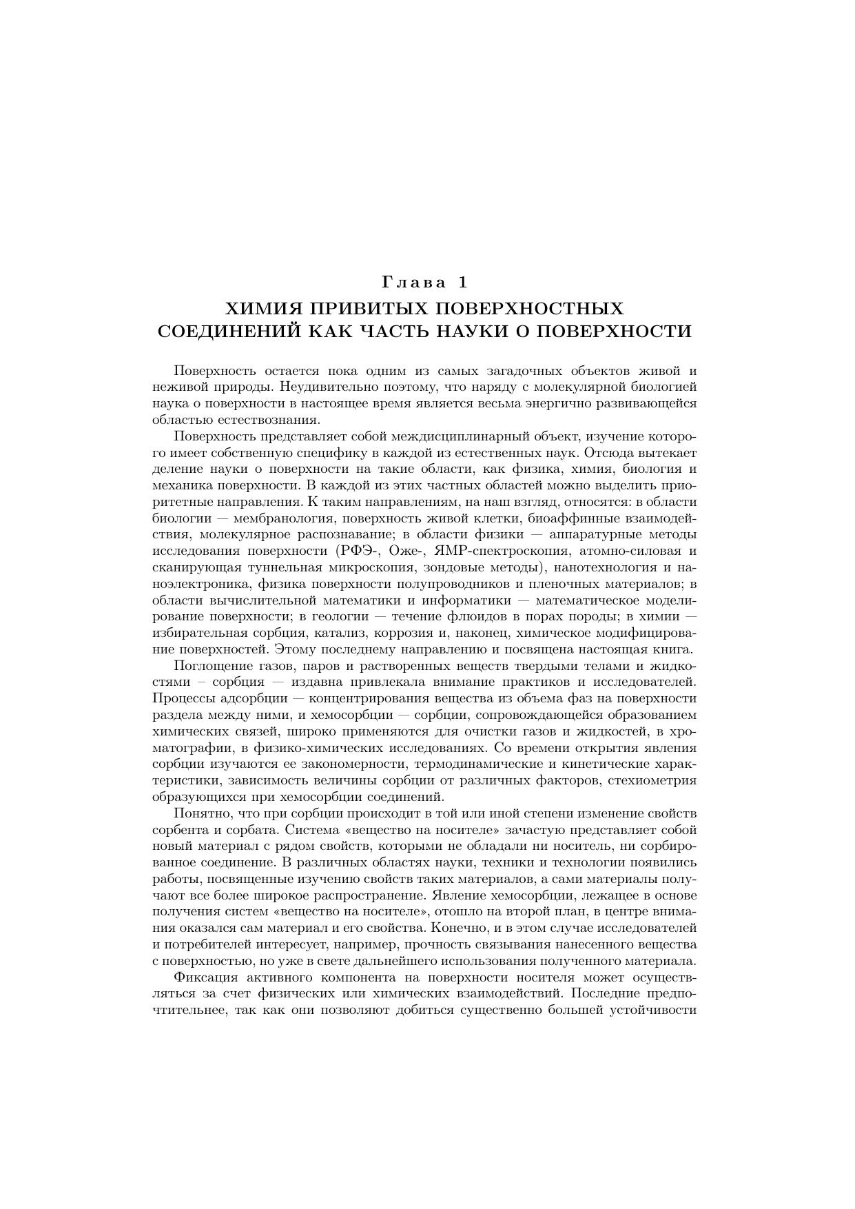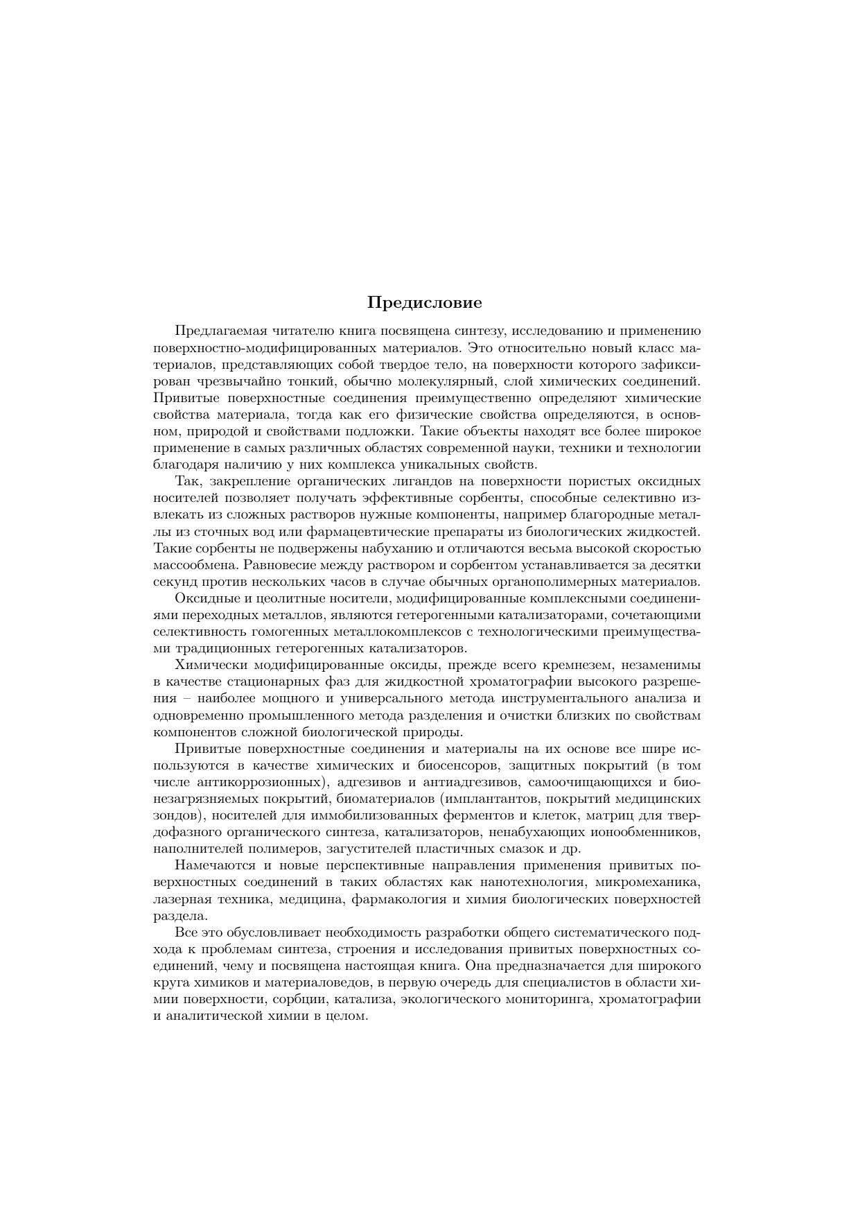 Книга посвящена систематическому изложению методов синтеза, особенностей строения и исследованию привитых поверхностных соединений, определяющих свойства поверхностно-модифицированных материалов. Такие материалы представляют собой твердый носитель, на поверхности которого зафиксирован тонкий (обычно мономолекулярный) слой химических соединений. Рассмотрена химия поверхности различных носителей, свойства и способы получения модификаторов, процессы взаимодействия модификаторов с поверхностными функциональными группами, строение, свойства и методы исследования привитых слоев. Детально изложены основные направления практического применения поверхностно-модифицированных материалов: селективные сорбенты, хроматографические материалы, химические и биосенсоры, катализаторы, самоочищающиеся, бионезагрязняемые и антикоррозионные покрытия, имплантанты, адгезивы и антиадгезивы, носители ферментов и клеток и т.д. Книга адресована студентам химических и химико-технологических вузов, аспирантам, преподавателям, а также широкому кругу научных работников.