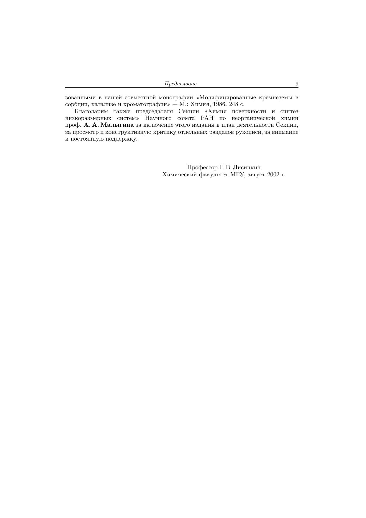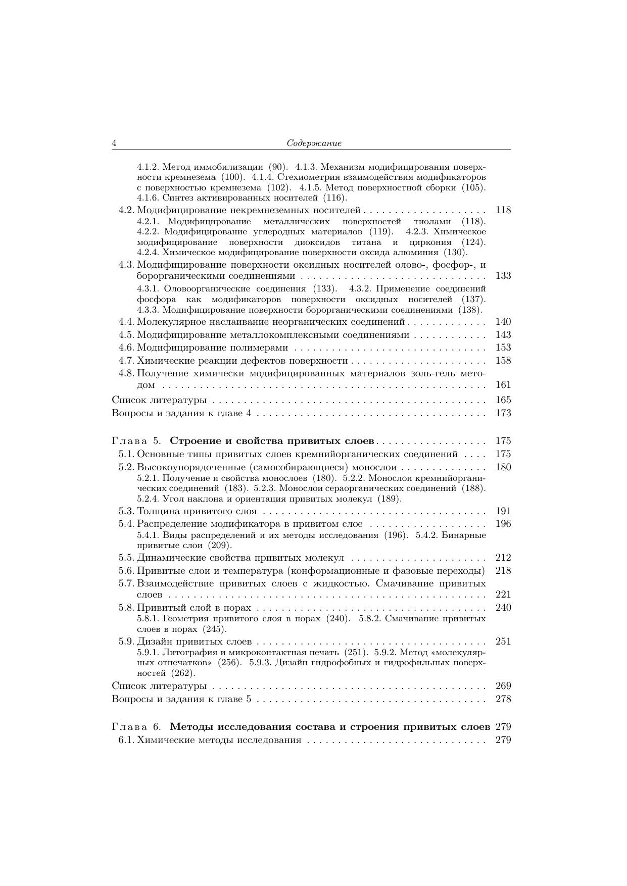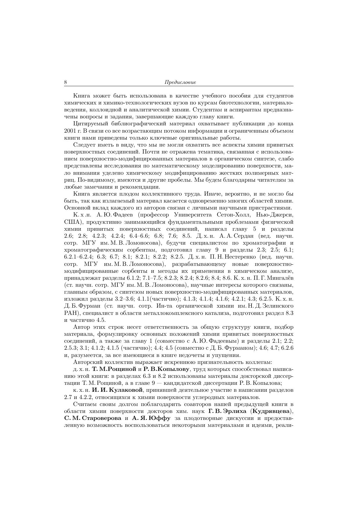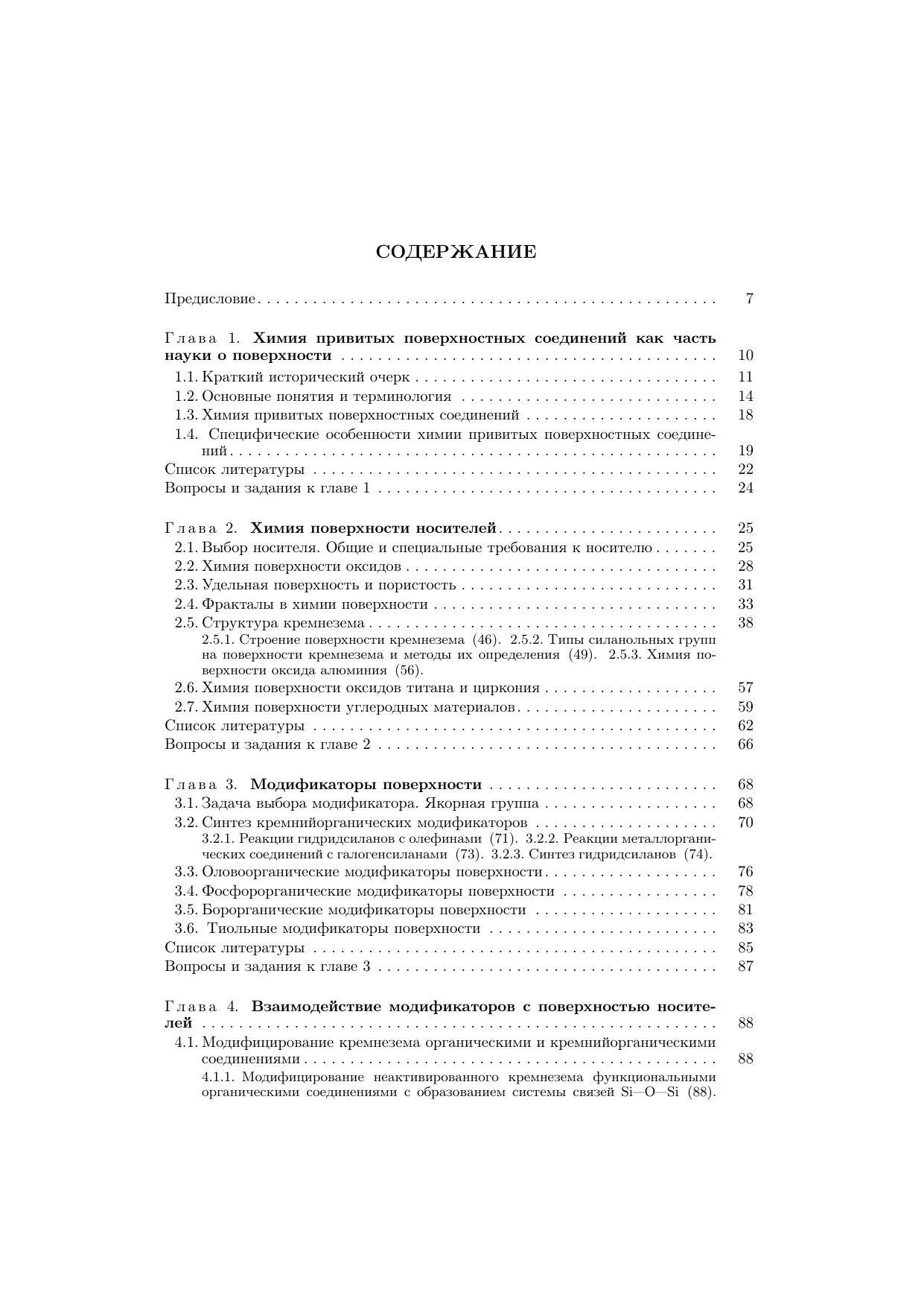 Книга посвящена систематическому изложению методов синтеза, особенностей строения и исследованию привитых поверхностных соединений, определяющих свойства поверхностно-модифицированных материалов. Такие материалы представляют собой твердый носитель, на поверхности которого зафиксирован тонкий (обычно мономолекулярный) слой химических соединений. Рассмотрена химия поверхности различных носителей, свойства и способы получения модификаторов, процессы взаимодействия модификаторов с поверхностными функциональными группами, строение, свойства и методы исследования привитых слоев. Детально изложены основные направления практического применения поверхностно-модифицированных материалов: селективные сорбенты, хроматографические материалы, химические и биосенсоры, катализаторы, самоочищающиеся, бионезагрязняемые и антикоррозионные покрытия, имплантанты, адгезивы и антиадгезивы, носители ферментов и клеток и т.д. Книга адресована студентам химических и химико-технологических вузов, аспирантам, преподавателям, а также широкому кругу научных работников.