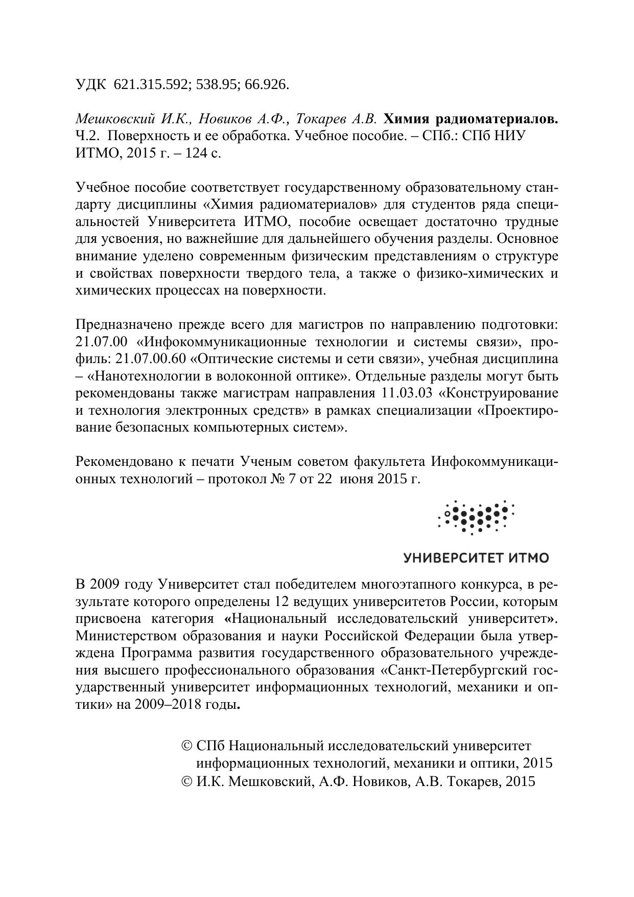 Учебное пособие соответствует государственному образовательному стандарту дисциплины «Химия радиоматериалов» для студентов ряда специальностей Университета ИТМО, пособие освещает достаточно трудные для усвоения, но важнейшие для дальнейшего обучения разделы. Основное внимание уделено современным физическим представлениям о структуре и свойствах поверхности твердого тела, а также о физико-химических и химических процессах на поверхности. Предназначено прежде всего для магистров по направлению подготовки: 21.07.00 «Инфокоммуникационные технологии и системы связи», профиль: 21.07.00.60 «Оптические системы и сети связи», учебная дисциплина – «Нанотехнологии в волоконной оптике». Отдельные разделы могут быть рекомендованы также магистрам направления 11.03.03 «Конструирование и технология электронных средств» в рамках специализации «Проектирование безопасных компьютерных систем».