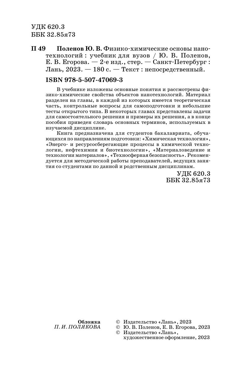 В учебнике изложены основные понятия и рассмотрены физико-химические свойства объектов нанотехнологий. Материал разделен на главы, в каждой из которых имеется теоретическая часть, контрольные вопросы для самоподготовки и небольшие тесты открытого типа. В некоторых главах представлены задачи для самостоятельного решения и примеры их решения, а в конце пособия приведен словарь основных терминов, используемых в изучаемой дисциплине. Книга предназначена для студентов бакалавриата, обучающихся по направлениям подготовки: «Химическая технология», «Энерго- и ресурсосберегающие процессы в химической технологии, нефтехимии и биотехнологии», «Материаловедение и технологии материалов», «Техносферная безопасность». Рекомендуется для методической работы преподавателей, ведущих занятия со студентами по данной и родственным дисциплинам.