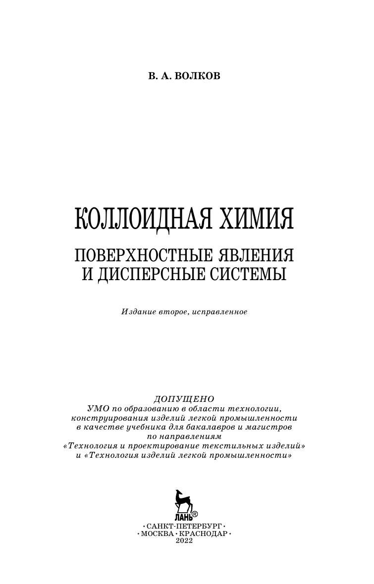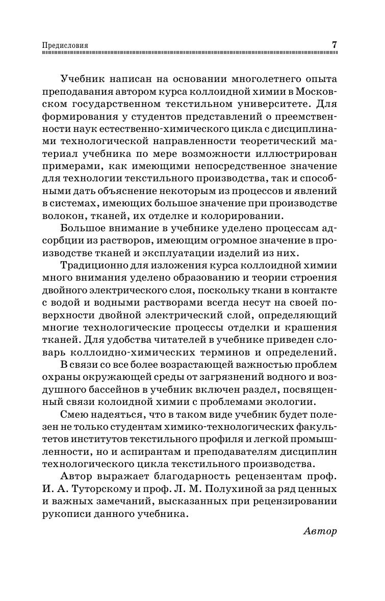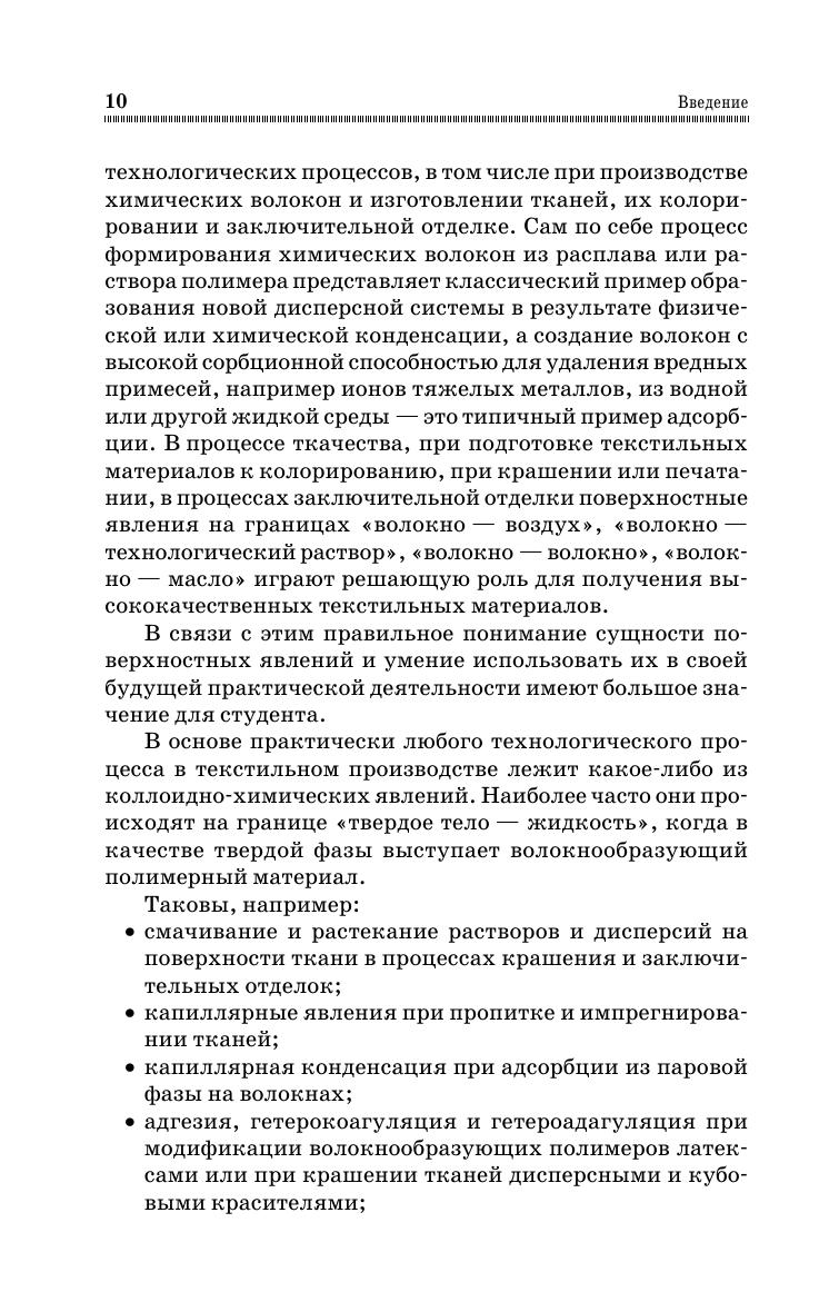 Изложены физико-химические основы поверхностных явлений и дисперсных систем. Приведены примеры проявления поверхностных явлений и применения дисперсных систем в производстве текстильных материалов и их облагораживания. Предназначен для студентов химико-технологических специальностей высших учебных заведений текстильного профиля и легкой промышленности, изучающих курс коллоидной химии.