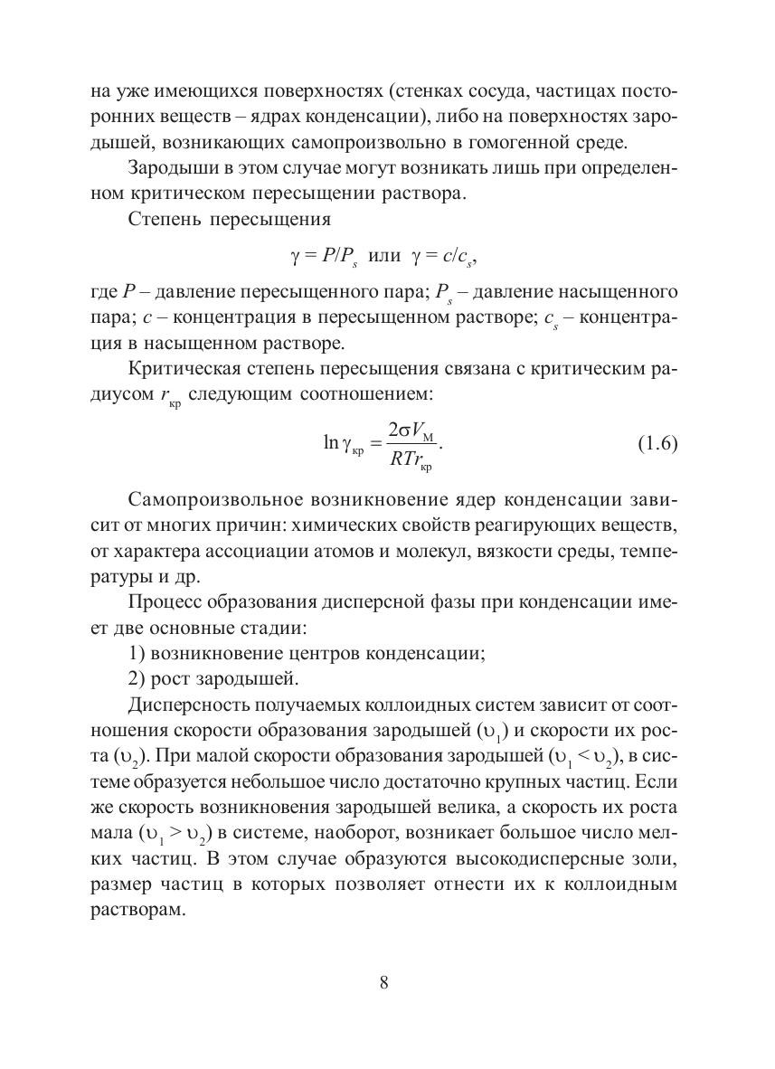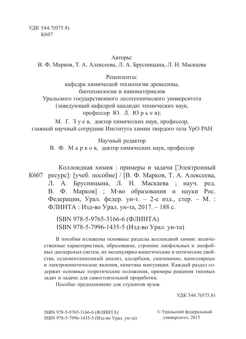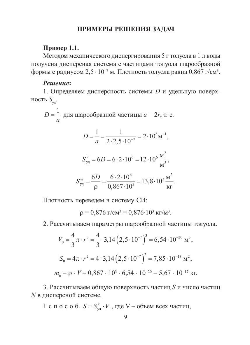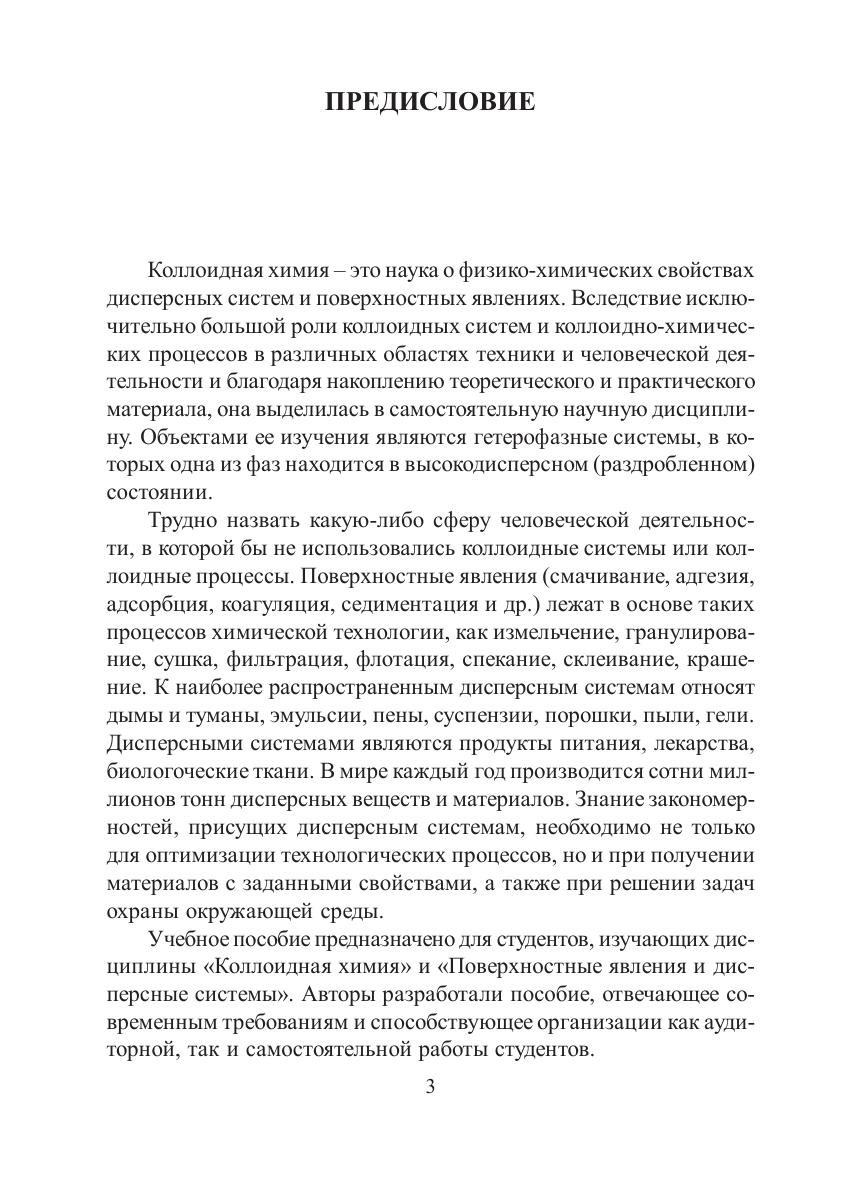 В пособии изложены основные разделы коллоидной химии: количественные характеристики, образование, строение лиофильных и лиофобных дисперсных систем, их молекулярно-кинетические и оптические свойства, седиментационный анализ, адсорбция, смачивание, капиллярные и электрокинетические явления, кинетика коагуляции. Каждый раздел содержит основные теоретические положения, примеры решения типовых задач и задачи для самостоятельной проработки. Пособие предназначено для студентов вузов.