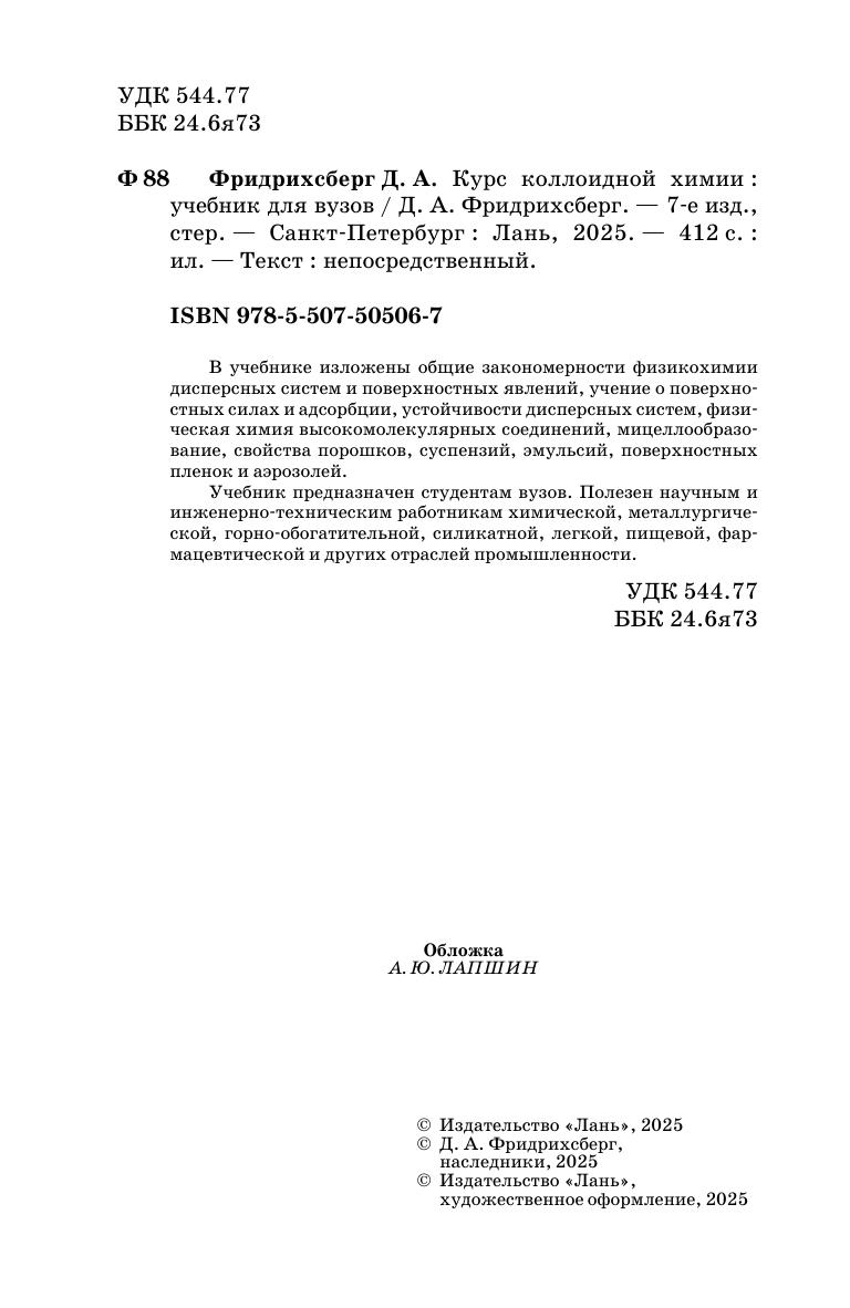 В учебнике изложены общие закономерности физикохимии дисперсных систем и поверхностных явлений, учение о поверхностных силах и адсорбции, устойчивости дисперсных систем, физическая химия высокомолекулярных соединений, мицеллообразование, свойства порошков, суспензий, эмульсий, поверхностных пленок и аэрозолей.Учебник предназначен студентам вузов. Полезен научным и инженерно-техническим работникам химической, металлургической, горно-обогатительной, силикатной, легкой, пищевой, фармацевтической и других отраслей промышленности.