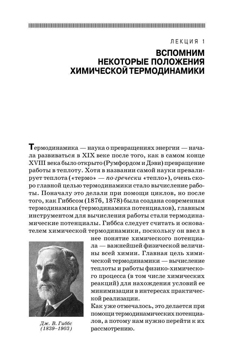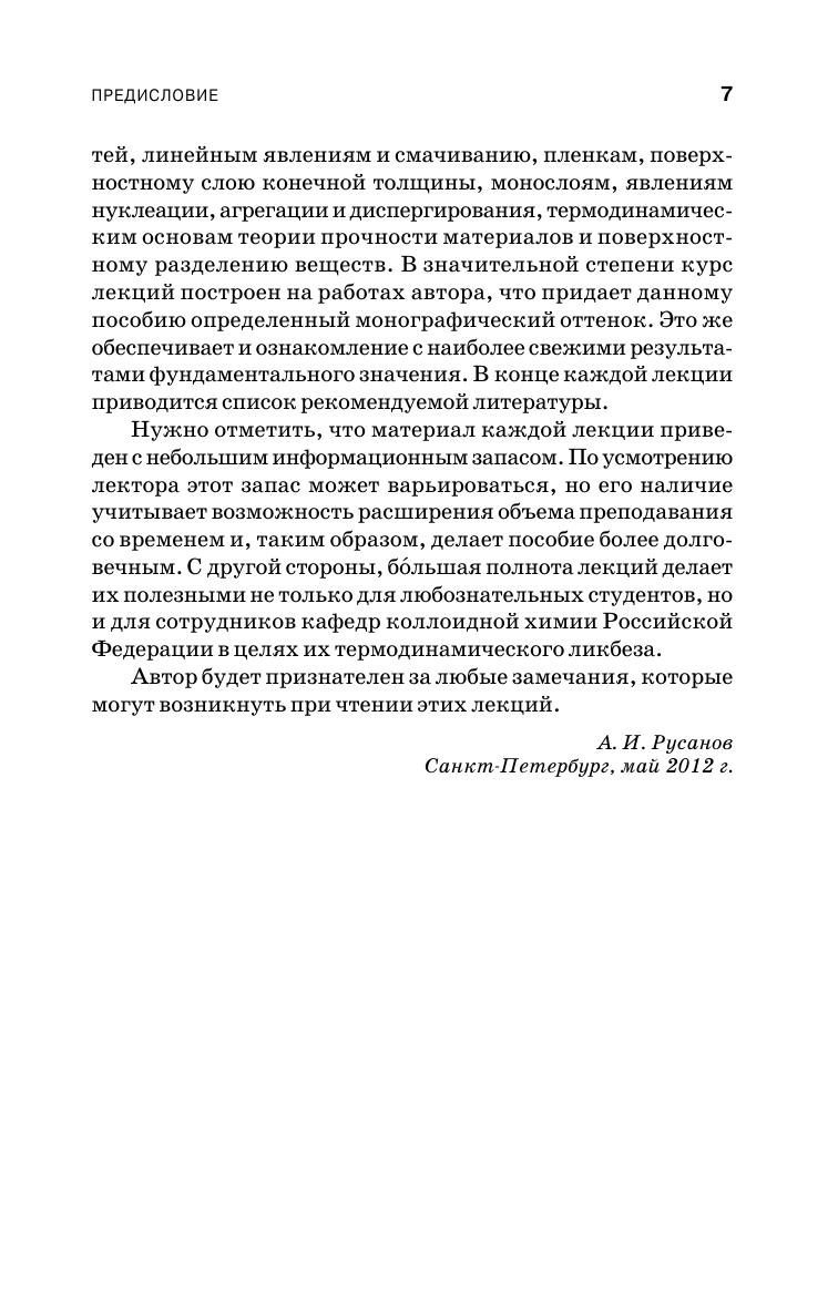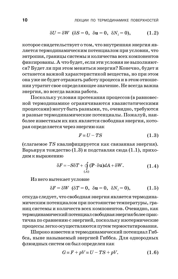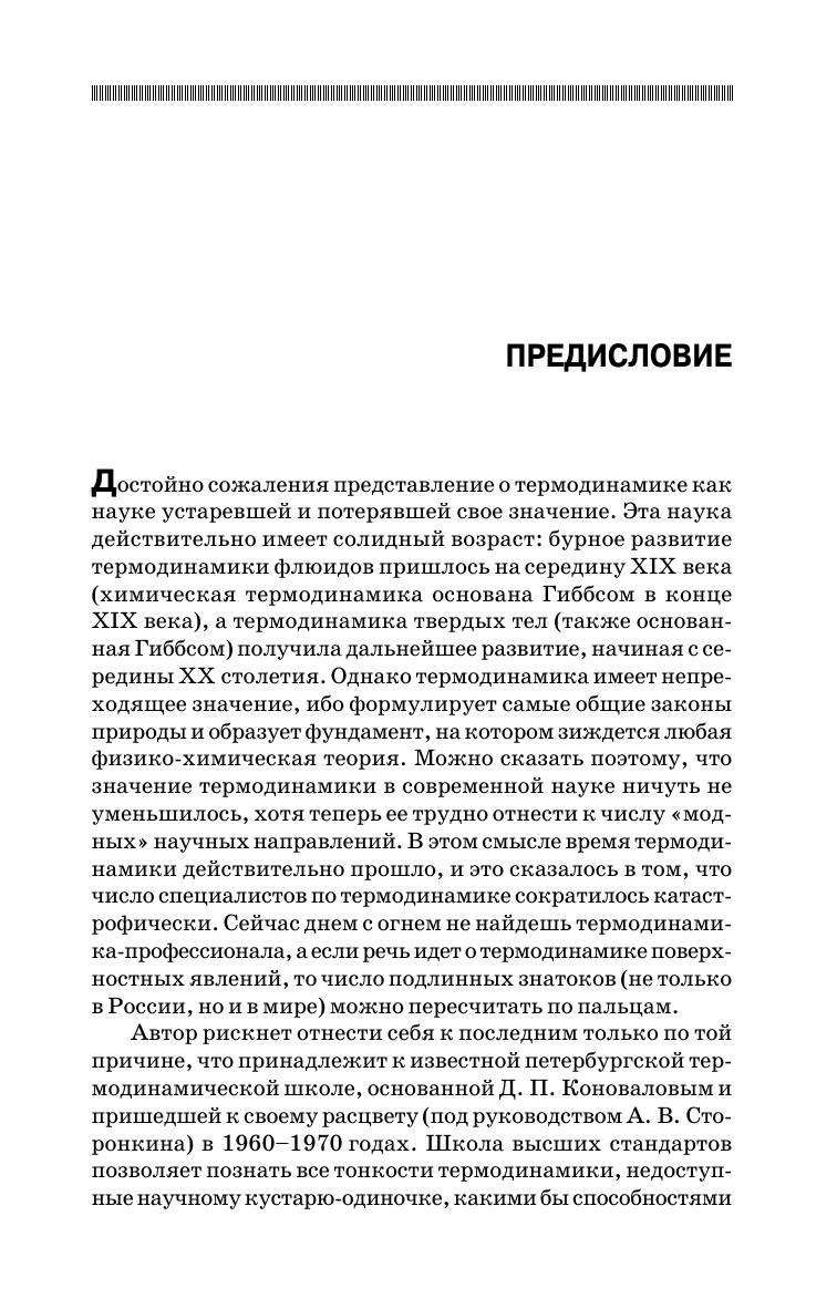 Книга представляет собой лекционное учебное пособие по равновесной термодинамике поверхностей для слушателей, уже знакомых с химической термодинамикой. Включает 12 лекций по основным направлениям термодинамики поверхностей. Их тематика посвящена поверхностному натяжению, фундаментальным термодинамическим уравнениям для плоских и искривленных поверхностей, линейным явлениям и смачиванию, пленкам, модели поверхностного слоя конечной толщины, мономолекулярным слоям, явлениям нуклеации, агрегации и диспергирования, термодинамическим основам теории прочности материалов и поверхностному разделению веществ. Значительная часть материала основана на работах автора и знакомит с достижениями науки последнего времени. Издание рассчитано на студентов и аспирантов физических и химических специальностей классических университетов и химико-технологических вузов, получающими подготовку в области поверхностных явлений, и может быть полезным широкому кругу специалистов, интересующимся современным состоянием науки в этой области.