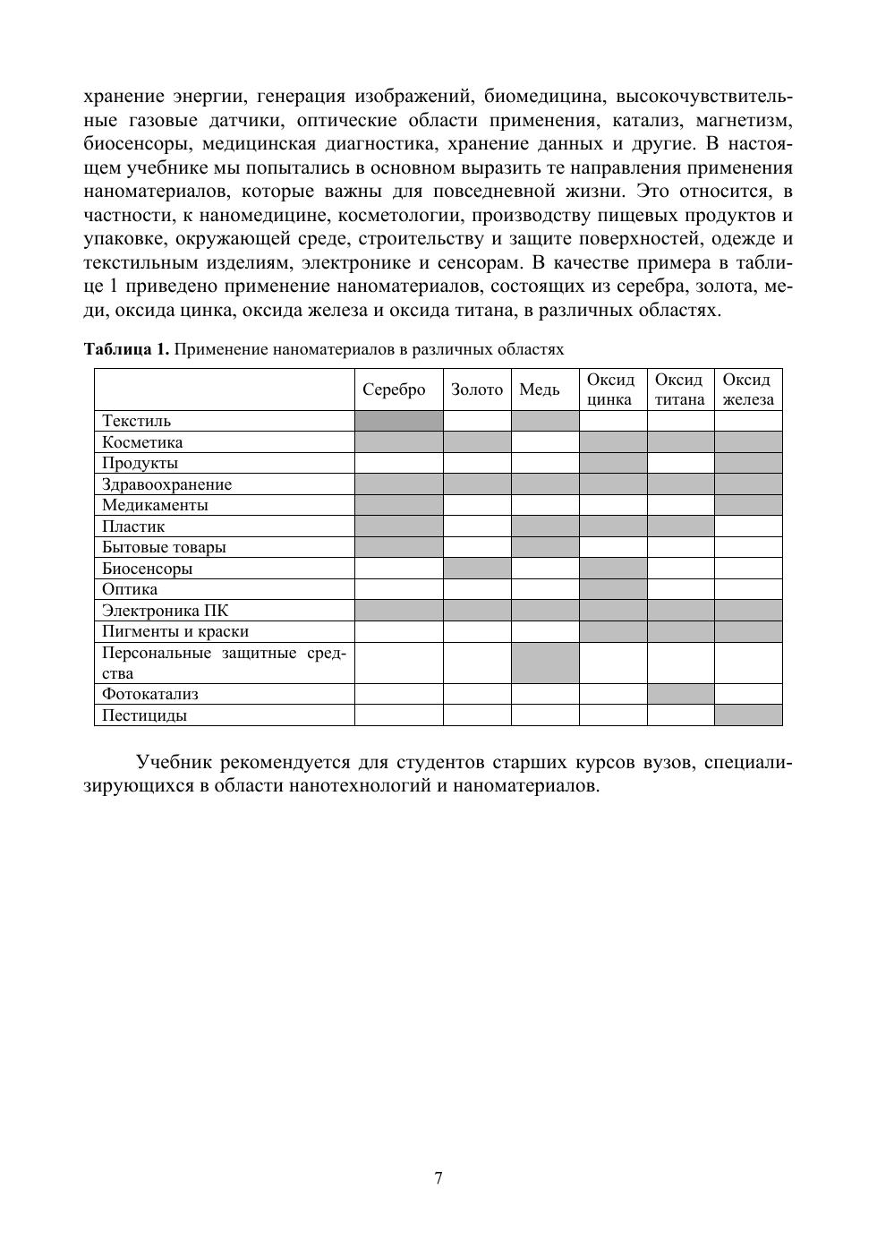 Цель учебника — дать углубленное изложение главных направлений применения наноматериалов в повседневной жизни. В учебнике отражено использование наноматериалов в медицине, косметологии, производстве пищевых продуктов и упаковке, окружающей среде, для строительства и защиты поверхностей, в одежде и текстильных изделиях, а также в качестве умной электроники и сенсоров. Учебник содержит необходимый набор тестовых контрольных мероприятий и глоссарий, что окажет существенную помощь в освоении дисциплины.