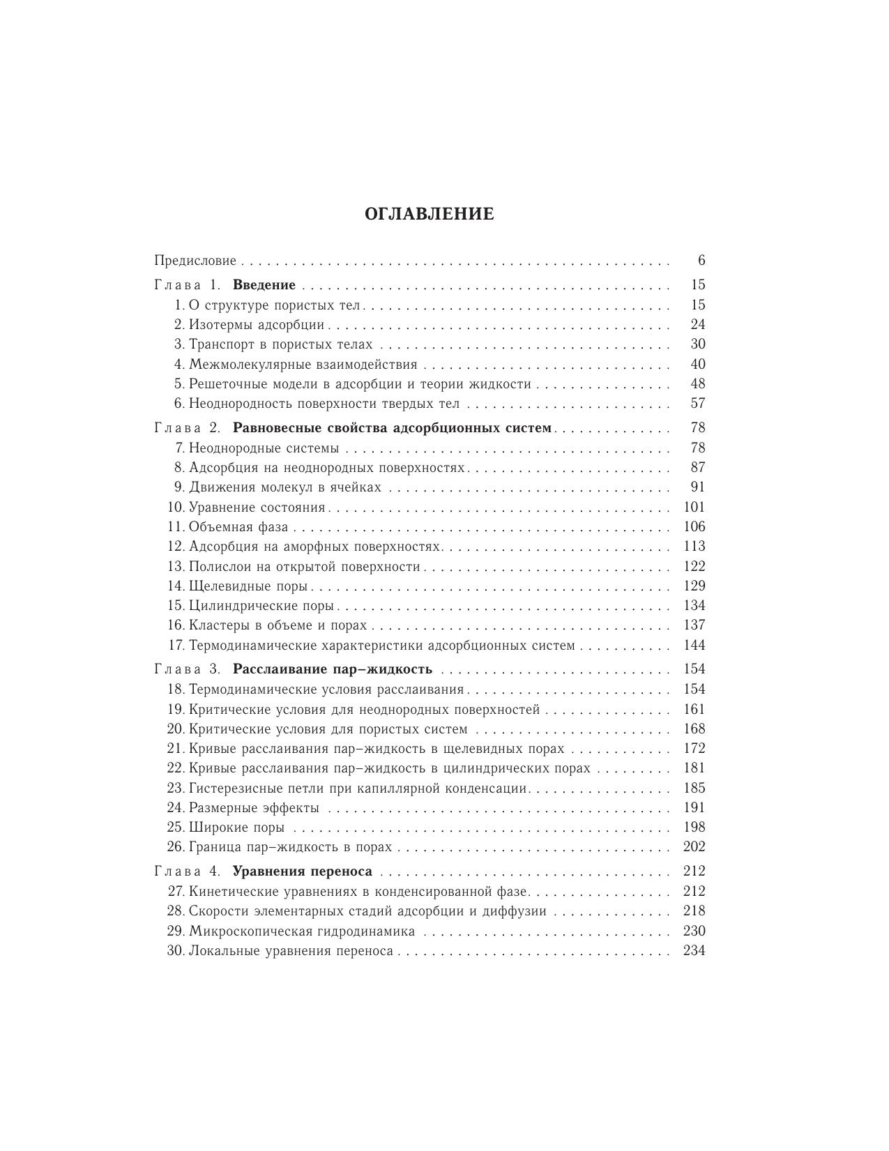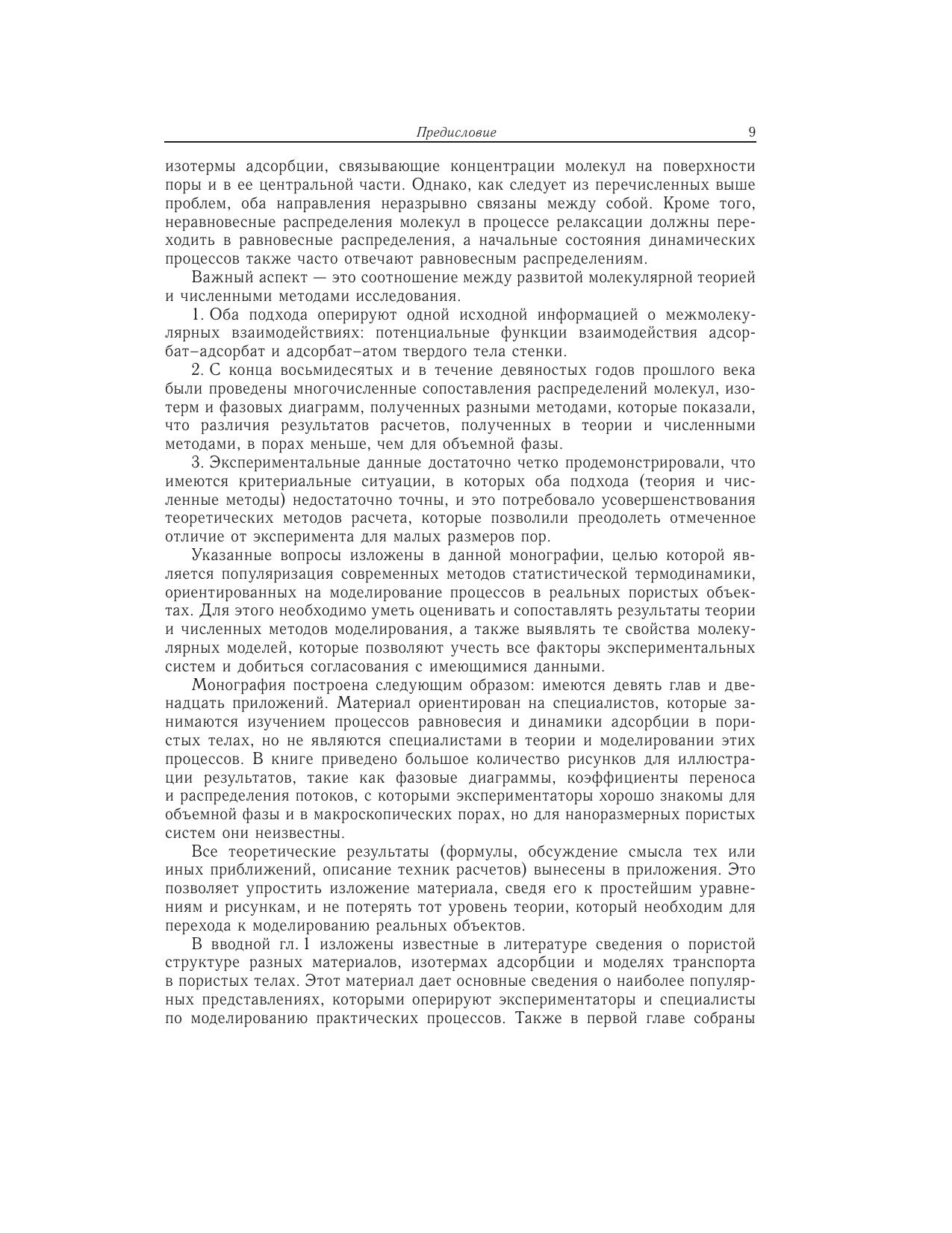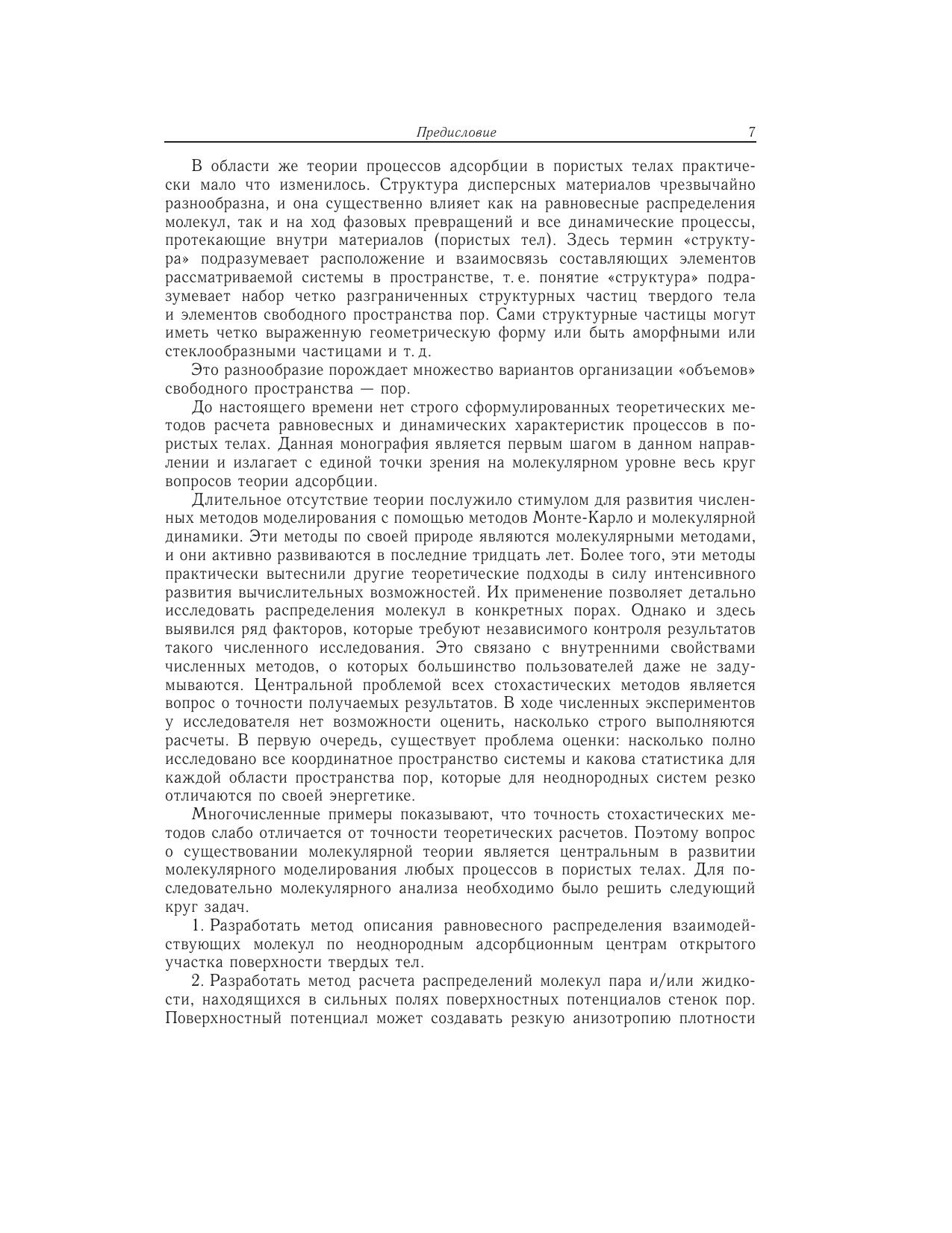 Процессы в пористых телах составляют основу многих традиционных и современных технологий: каталитических, сорбционных, мембранных, электрохимических, хроматографических, очистки и разделения жидких и газовых смесей, капиллярной конденсации и десорбции, многофазной фильтрации и напыления, смачивания, пропитки и сушки широкого круга дисперсных систем, как синтезированных, так и природных, включая процессы переноса веществ в различных грунтах и т.д. Монография является первым шагом в изложении с единой точки зрения всего круга вопросов по расчету равновесных и динамических характеристик процессов адсорбции в пористых телах на молекулярном уровне. Впервые излагаются два новых направлениястатистической термодинамики: теория расслаивания молекул в сложных микронеоднородных системах и микроскопическая гидродинамика. Материал ориентирован на специалистов, которые занимаются процессами равновесия и динамики адсорбции в пористых телах, но не являются специалистами в теории и моделировании этих процессов. Изложение материала построено так, чтобы читатель мог последовательно войти в курс проблем, для чего приведено большое количество иллюстраций: фазовые диаграммы, коэффициенты переноса и распределения потоков, которые хорошо знакомы экспериментаторам в случае объемной фазы и в макроскопических порах, но для наноразмерных пористых систем неизвестны. Монография имеет междисциплинарный характер. Она полезна широкому кругу специалистов в области физической химии, занимающихся вопросами статистической термодинамики, физики поверхностных явлений и фазовых переходов, кинетической теории конденсированных фаз и гидродинамики, а также студентам и аспирантам соответствующих специальностей.