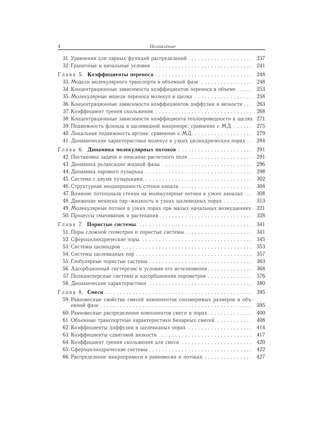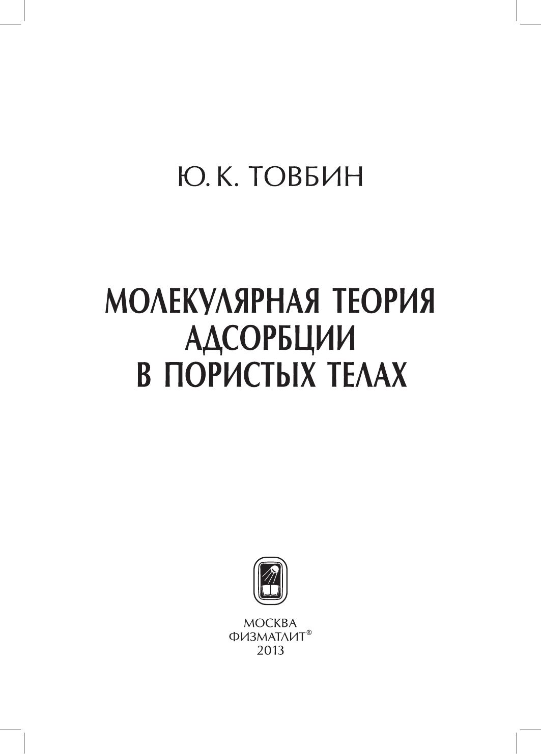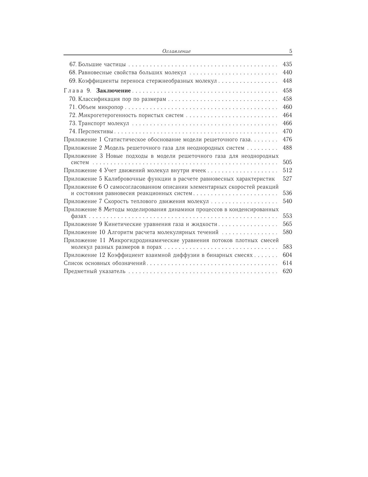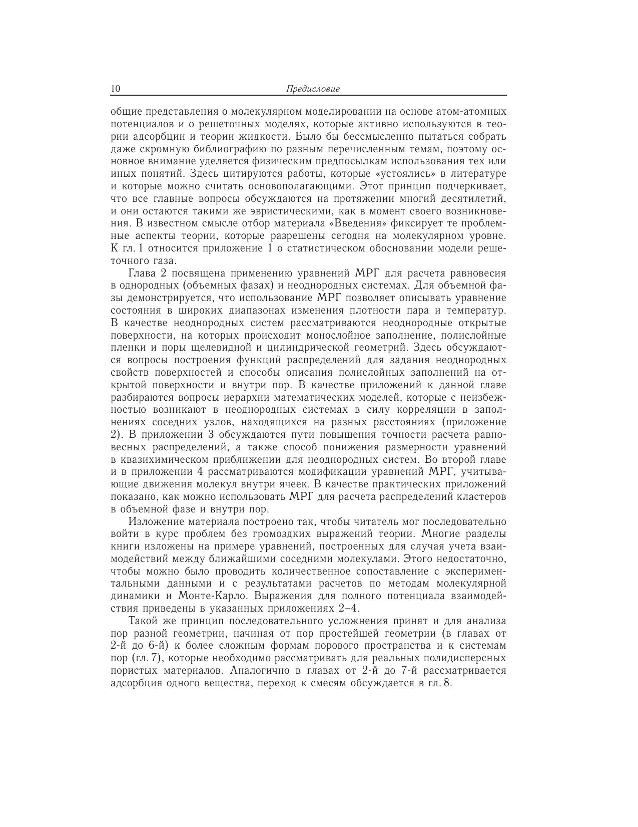 Процессы в пористых телах составляют основу многих традиционных и современных технологий: каталитических, сорбционных, мембранных, электрохимических, хроматографических, очистки и разделения жидких и газовых смесей, капиллярной конденсации и десорбции, многофазной фильтрации и напыления, смачивания, пропитки и сушки широкого круга дисперсных систем, как синтезированных, так и природных, включая процессы переноса веществ в различных грунтах и т.д. Монография является первым шагом в изложении с единой точки зрения всего круга вопросов по расчету равновесных и динамических характеристик процессов адсорбции в пористых телах на молекулярном уровне. Впервые излагаются два новых направлениястатистической термодинамики: теория расслаивания молекул в сложных микронеоднородных системах и микроскопическая гидродинамика. Материал ориентирован на специалистов, которые занимаются процессами равновесия и динамики адсорбции в пористых телах, но не являются специалистами в теории и моделировании этих процессов. Изложение материала построено так, чтобы читатель мог последовательно войти в курс проблем, для чего приведено большое количество иллюстраций: фазовые диаграммы, коэффициенты переноса и распределения потоков, которые хорошо знакомы экспериментаторам в случае объемной фазы и в макроскопических порах, но для наноразмерных пористых систем неизвестны. Монография имеет междисциплинарный характер. Она полезна широкому кругу специалистов в области физической химии, занимающихся вопросами статистической термодинамики, физики поверхностных явлений и фазовых переходов, кинетической теории конденсированных фаз и гидродинамики, а также студентам и аспирантам соответствующих специальностей.