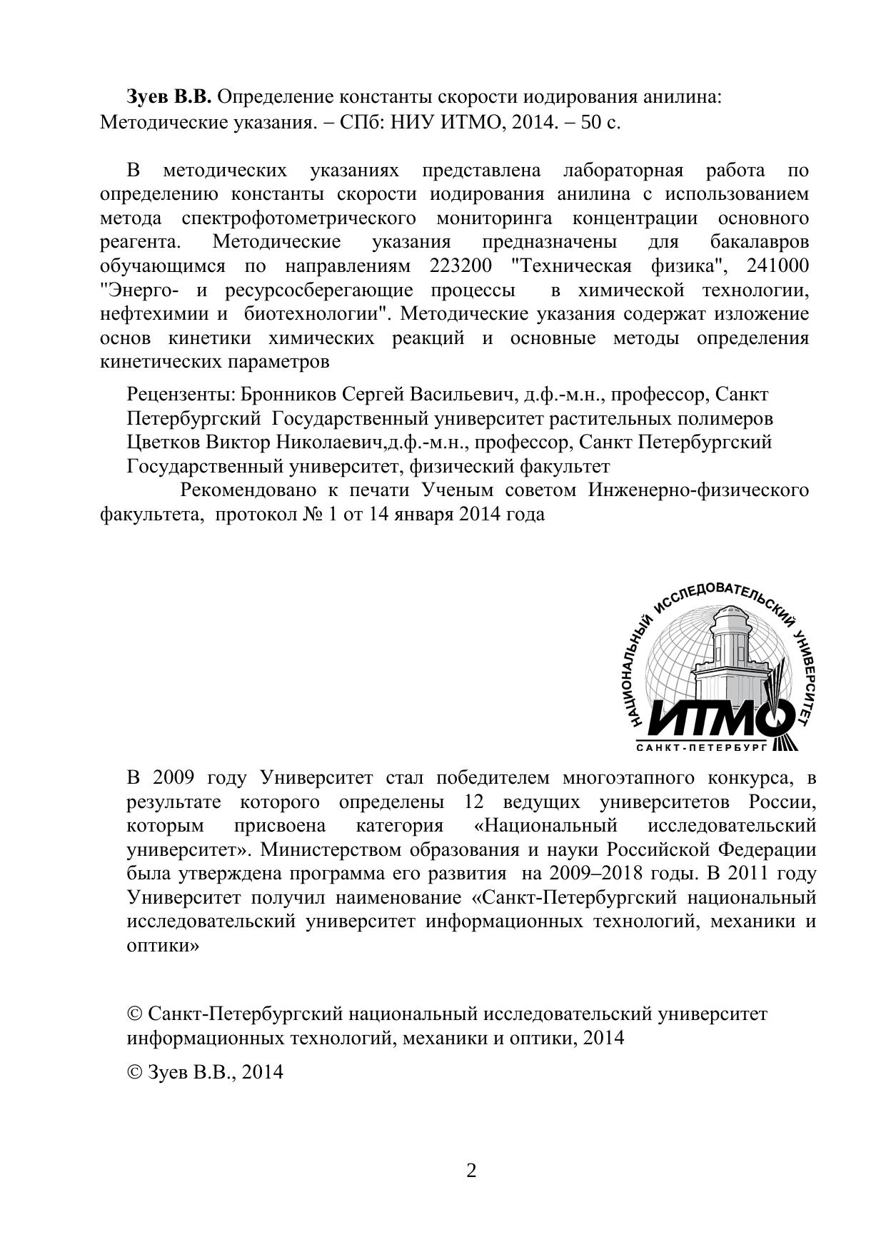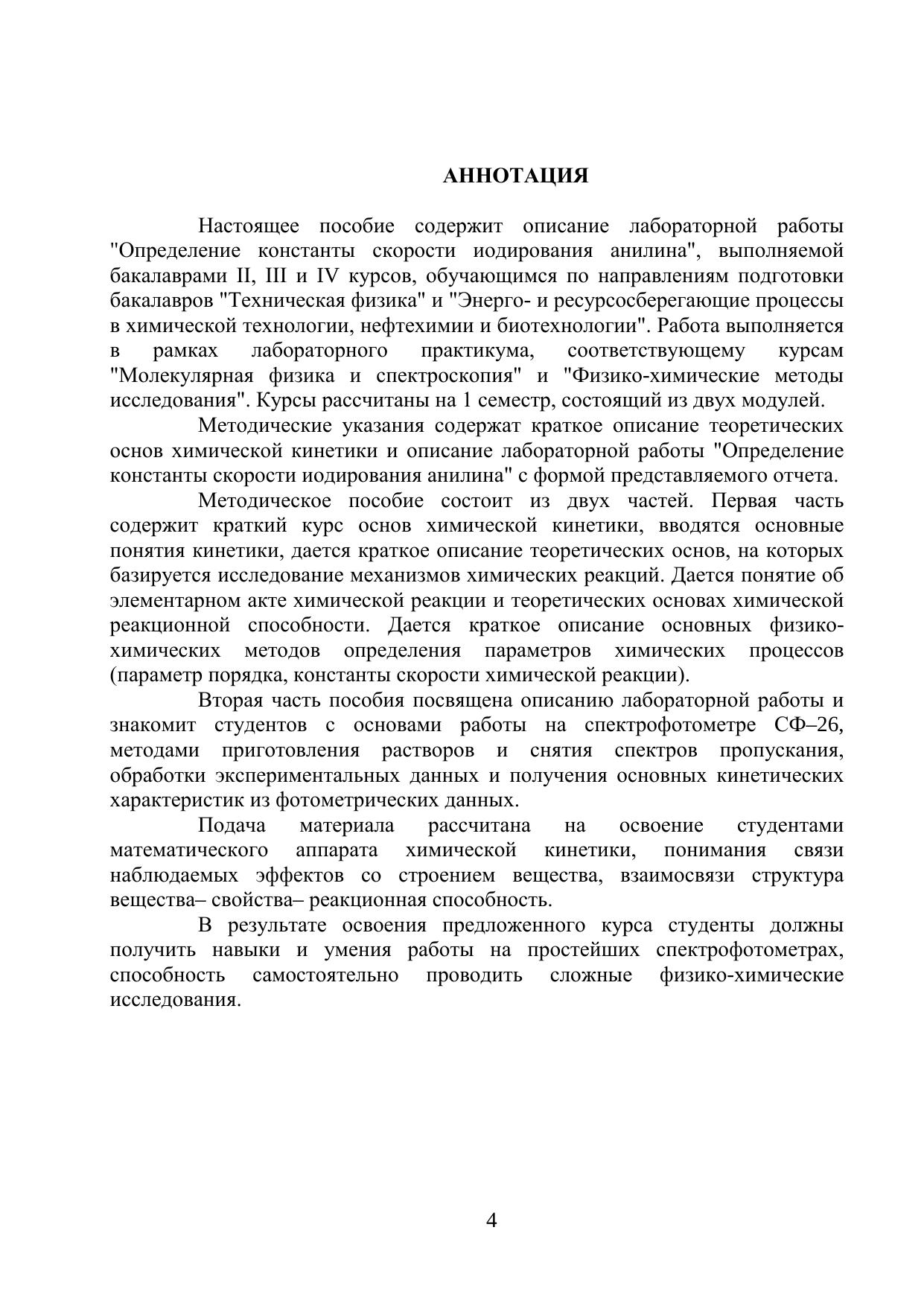В методических указаниях представлена лабораторная работа по определению константы скорости иодирования анилина с использованием метода спектрофотометрического мониторинга концентрации основного реагента. Методические указания предназначены для бакалавров обучающимся по направлениям 223200 "Техническая физика", 241000 "Энерго- и ресурсосберегающие процессы в химической технологии, нефтехимии и биотехнологии". Методические указания содержат изложениеоснов кинетики химических реакций и основные методы определения кинетических параметров.