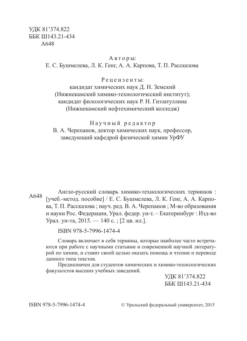 Словарь включает в себя термины, которые наиболее часто встречаются при работе с научными статьями и современной научной литерату-рой по химии, и ставит своей целью оказать помощь в чтении и переводе данного типа текстов. Предназначен для студентов химических и химико-технологических факультетов высших учебных заведений.