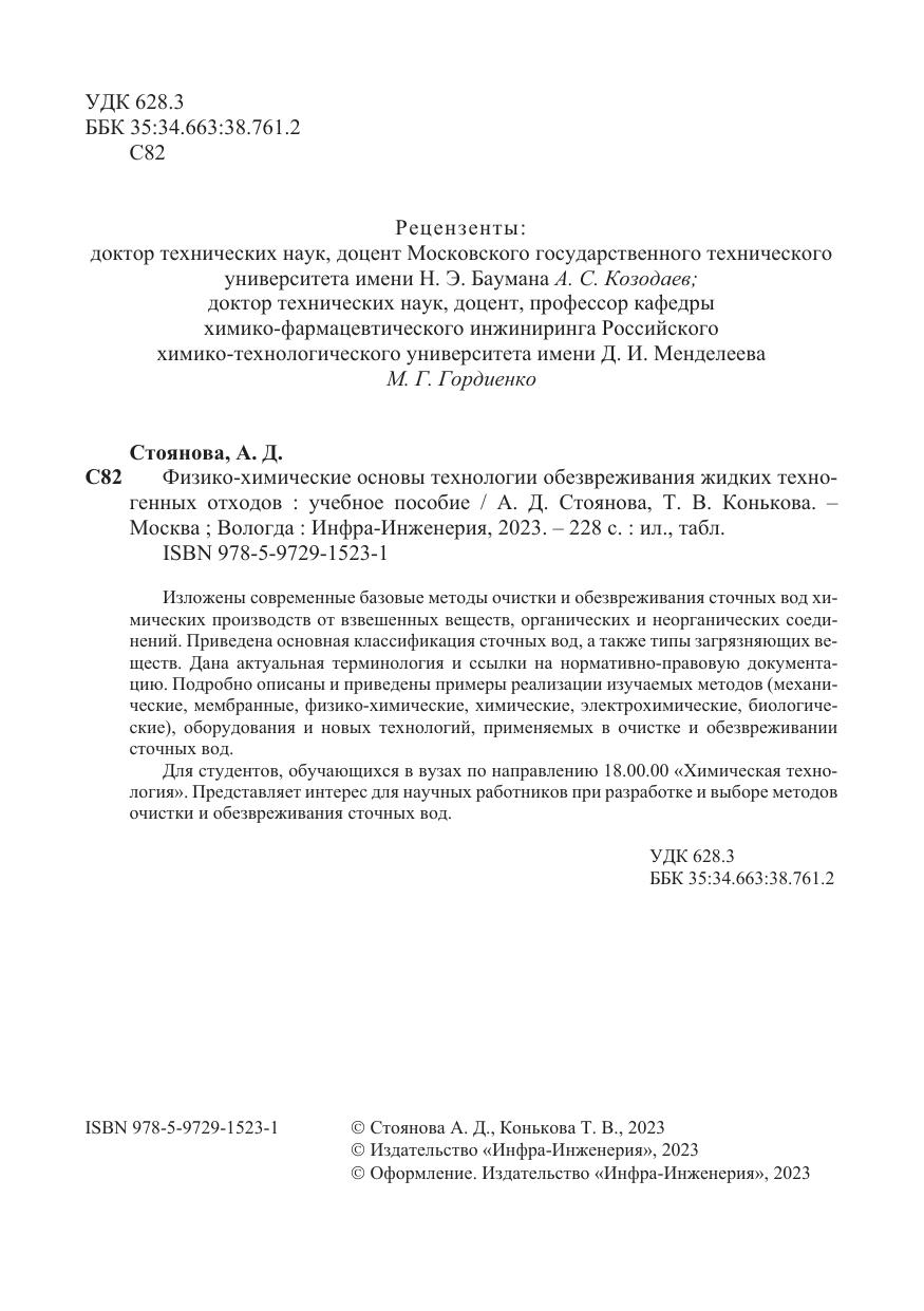 Изложены современные базовые методы очистки и обезвреживания сточных вод химических производств от взвешенных веществ, органических и неорганических соединений. Приведена основная классификация сточных вод, а также типы загрязняющих веществ. Дана актуальная терминология и ссылки на нормативно-правовую документацию. Подробно описаны и приведены примеры реализации изучаемых методов (механические, мембранные, физико-химические, химические, электрохимические, биологические), оборудования и новых технологий, применяемых в очистке и обезвреживании сточных вод.