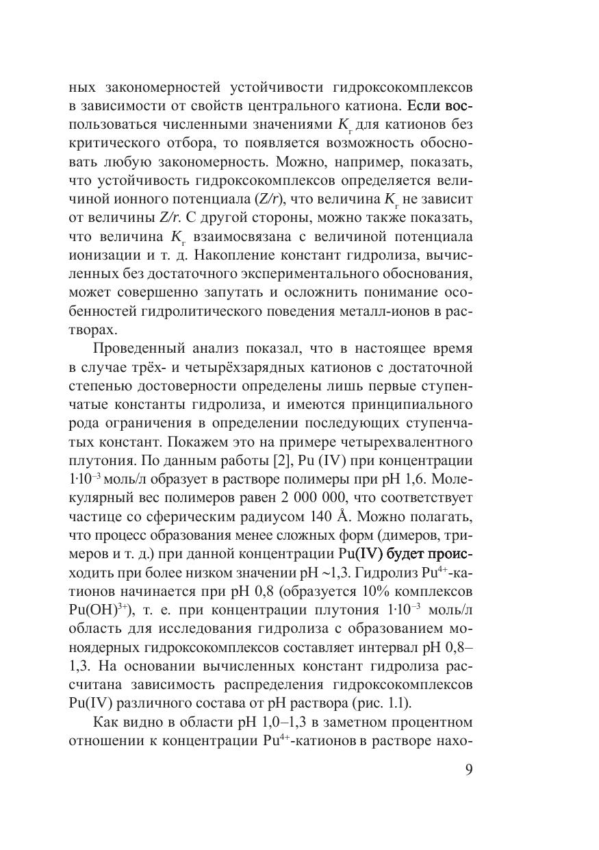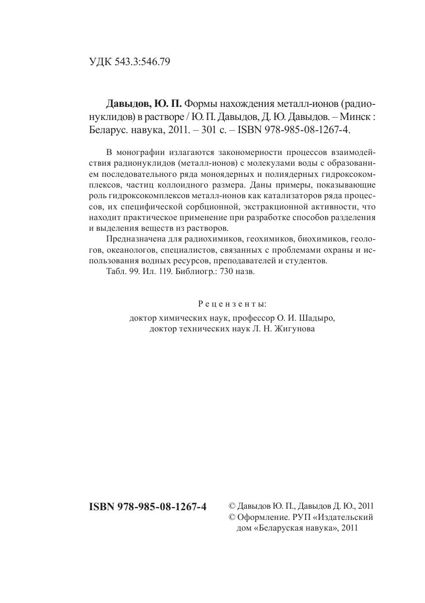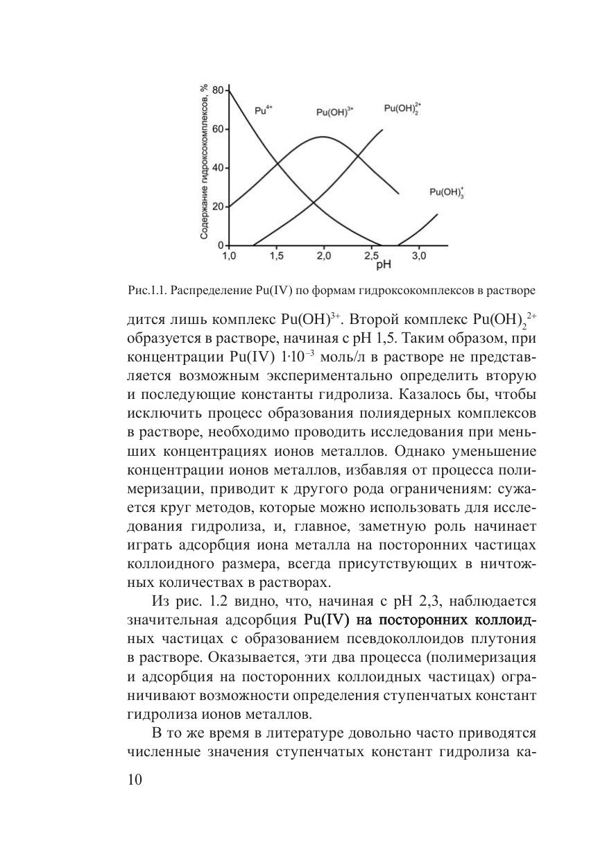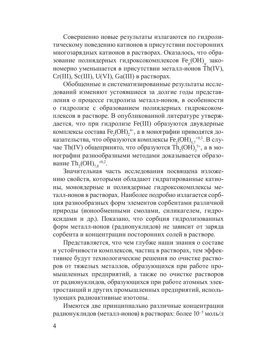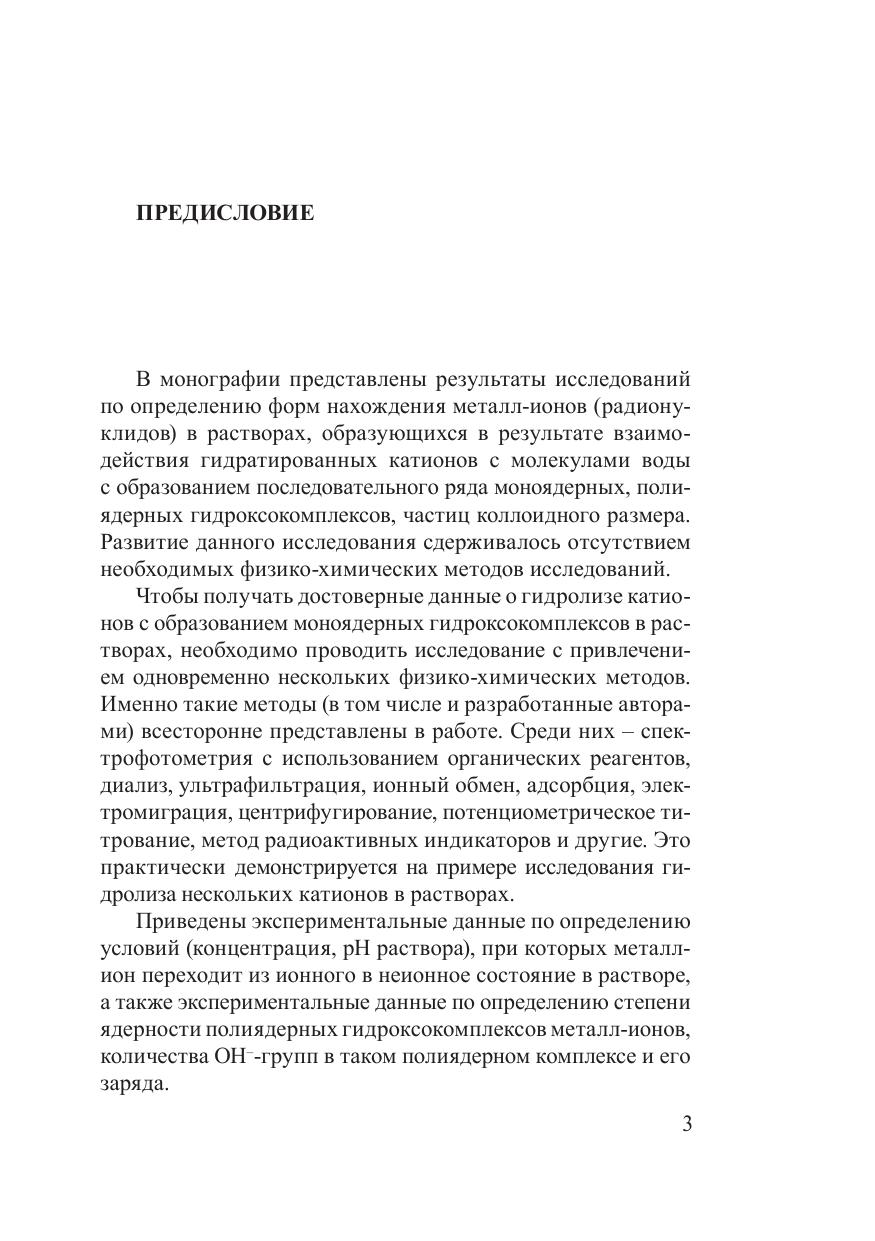 В монографии излагаются закономерности процессов взаимодействия радионуклидов (металл-ионов) с молекулами воды с образованием последовательного ряда моноядерных и полиядерных гидроксокомплексов, частиц коллоидного размера. Даны примеры, показывающие роль гидроксокомплексов металл-ионов как катализаторов ряда процессов, их специфической сорбционной, экстракционной активности, что находит практическое применение при разработке способов разделения и выделения веществ из растворов. Предназначена для радиохимиков, геохимиков, биохимиков, геологов, океанологов, специалистов, связанных с проблемами охраны и исползования водных ресурсов, преподавателей и студентов.