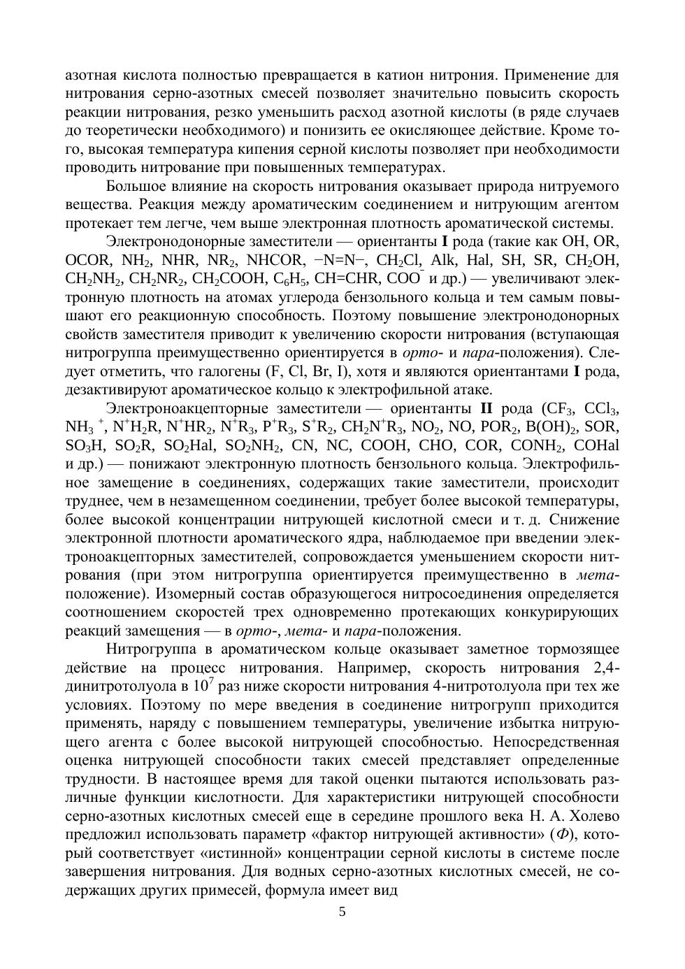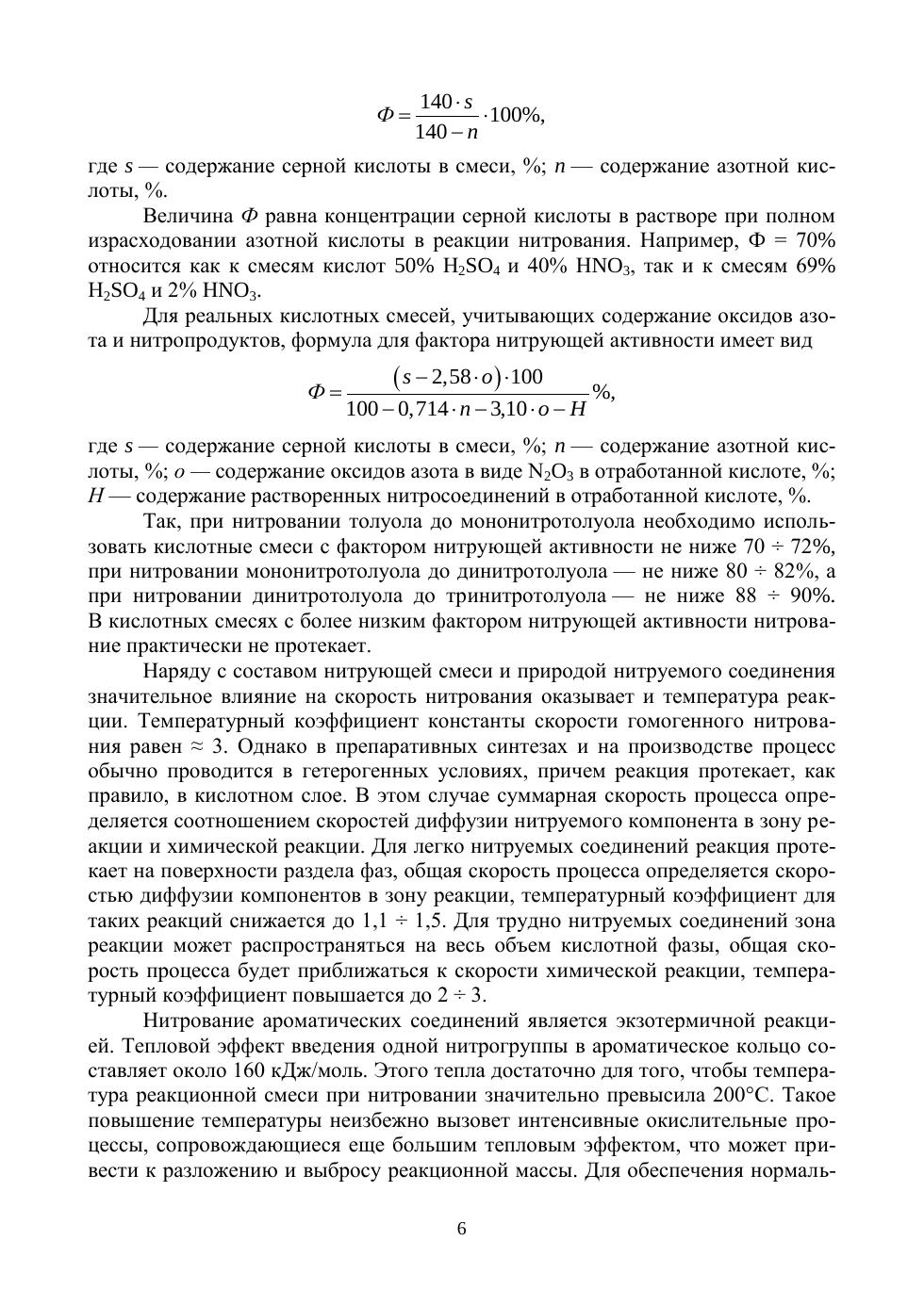 В данном учебном пособии представлено нитрование ароматических углеводородов на примере толуола серно-азотными кислотными смесями. Обсуждается макрокинетика реакций нитрования и дается общая характеристика гетерофазного процесса нитрования в ароматическом ряду. Показаны возможные способы очистки и некоторые методы анализа продуктов нитрования. Приведены физические и термохимические свойства исходных, промежуточных и конечных веществ. Приводятся методики нитрования толуола, а также сульфитной очистки, определения температуры затвердевания и изомерного состава тринитропроизводного. Учебное пособие предназначено для студентов 4–6 курсов технических вузов и университетов, обучающихся по специальности «Химическая технология энергонасыщенных материалов и изделий». Учебное пособие может быть полезно научным сотрудникам, аспирантам и инженерам, специализирующихся в области нитрования органических веществ и создания технологий, а также студентам при выполнении курсовых, дипломных проектов и работ, а также при подготовке к сдаче зачетов и экзаменов.