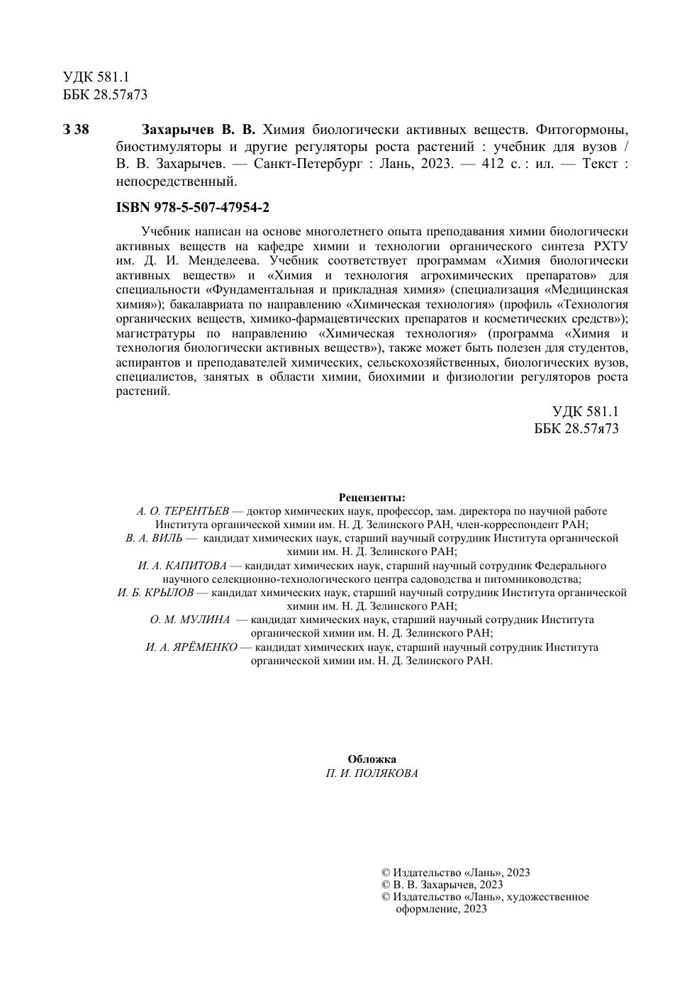 Учебник написан на основе многолетнего опыта преподавания химии биологически активных веществ на кафедре химии и технологии органического синтеза РХТУ им. Д. И. Менделеева. Учебник соответствует программам «Химия биологически активных веществ» и «Химия и технология агрохимических препаратов» для специальности «Фундаментальная и прикладная химия» (специализация «Медицинская химия»), бакалавриата по направлению «Химическая технология» (профиль «Технология органических веществ, химико-фармацевтических препаратов и косметических средств»), магистратуры по направлению «Химическая технология» (программа «Химия и технология биологически активных веществ»), также может быть полезен для студентов, аспирантов и преподавателей химических, сельскохозяйственных, биологических вузов, специалистов, занятых в области химии, биохимии и физиологии регуляторов роста растений.