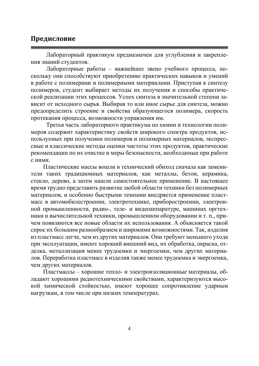 Лабораторный практикум представляет собой руководство для выполнения лабораторных работ. В нем приведены сведения по очистке и анализу мономеров и вспомогательных веществ для синтеза полимеров, а также методы испытания и идентификации полимерных материалов.Практикум предназначен для студентов колледжей и техникумов, обучающихся по специальности «Технология производства и переработки пластических масс и эластомеров», а также может быть полезен инженерным работникам, специализирующимся в области получения полимеров и полимерных материалов, переработки полимеров.