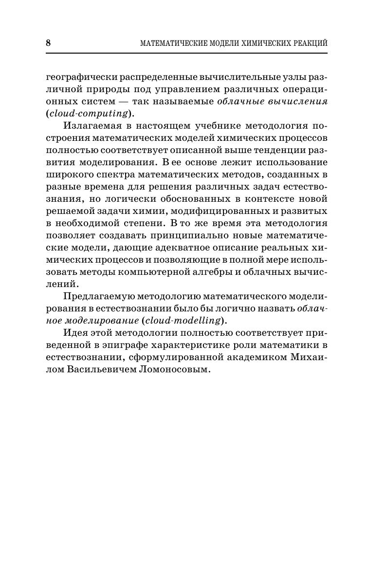 В учебнике рассматриваются общие методы и конкретные методики моделирования и математического исследования физико-химических и биохимических реакций. В основе методов лежит использование опыта применения синергетики, теории самоорганизации и современной теории сложных систем в задачах биологии, математики и химии. Предлагаемая система методов моделирования соответствует современным технологиям высокопроизводительных вычислений, относящимся к так называемым облачным вычислениям (cloud-computing). По нашему мнению эту систему знаний логично назвать облачное моделирование (cloud-modelling). Учебник содержит полезные рекомендации по продуктивному применению математических методов в химии и биохимии, в ходе совместной работы математиков, химиков и биологов. Особенностью такой работы является сочетание вероятностных и детерминированных методов. В силу этого биологам, математикам и химикам придется расширять свой научный потенциал. Один из путей такого расширения показан в настоящей книге.