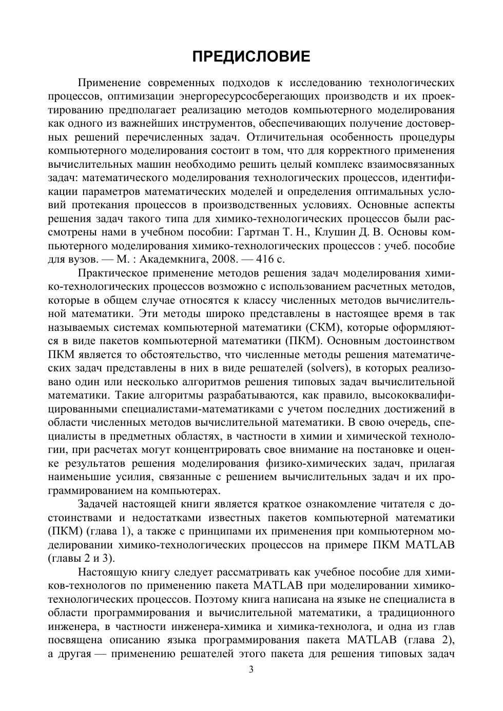 Книга предназначена для изучения методов применения пакетов компьютерной математики, в частности пакета MATLAB, для технологических расчетов, математического моделирования и оптимизации при проектировании и управлении химико-технологическими процессами. Рекомендуется в качестве учебного пособия студентам и магистрам, обучающимся по направлениям подготовки и специальностям, входящим в УГСН «Химия», «Химические технологии», а также может быть полезна аспирантам, инженерам-химикам-технологам, занимающимся расчетами и расчетными исследованиями технологических процессов.