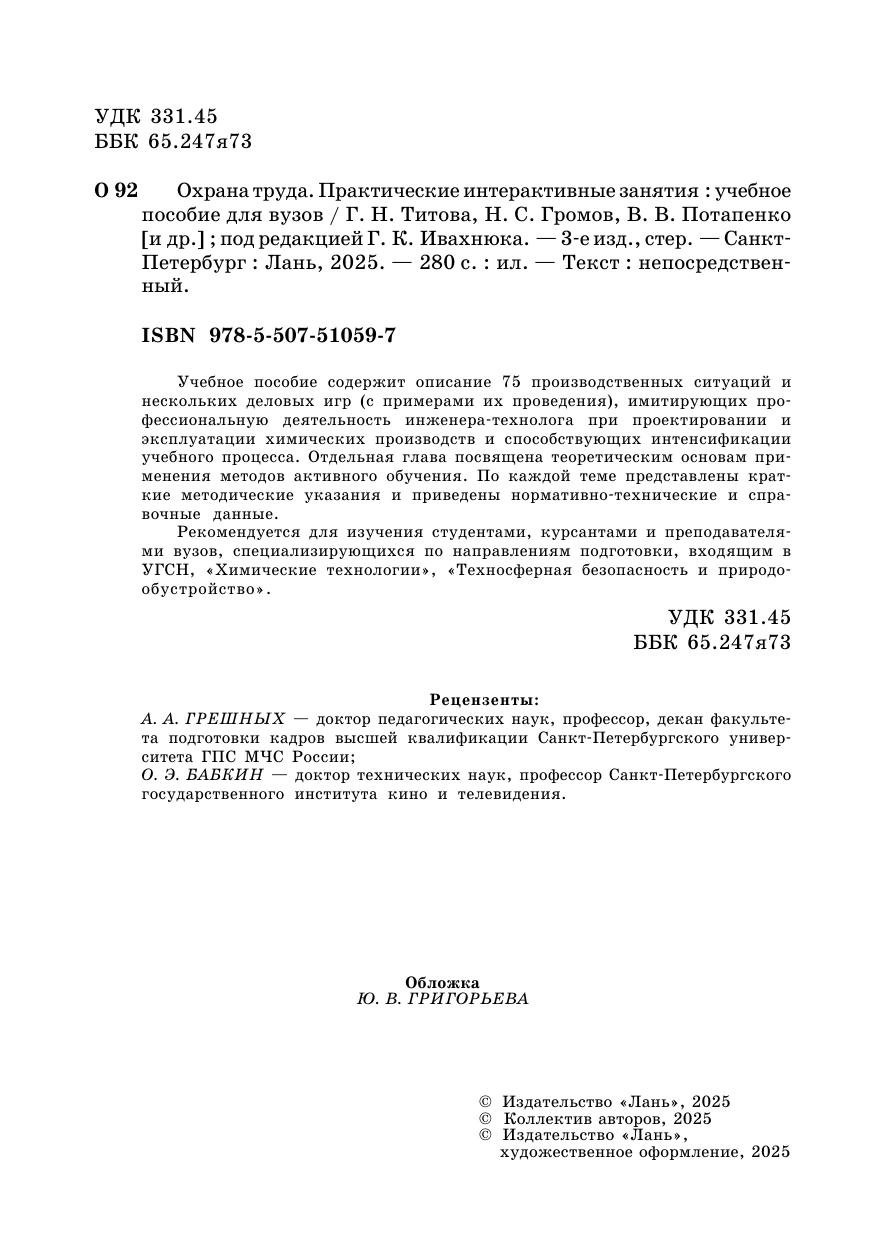 Пособие содержит описание 75 производственных ситуаций и нескольких деловых игр (с примерами их проведения), имитирующих профессиональную деятельность инженера-технолога при проектировании и эксплуатации химических производств и способствующих интенсификации учебного процесса. Отдельная глава посвящена теоретическим основам применения методов активного обучения. По каждой теме представлены краткие методические указания и приведены нормативно-технические и справочные данные. Рекомендуется для изучения студентами, курсантами и преподавателями вузов, специализирующихся по направлениям подготовки, входящим в УГСН «Химические технологии», «Техносферная безопасность и природообустройство».