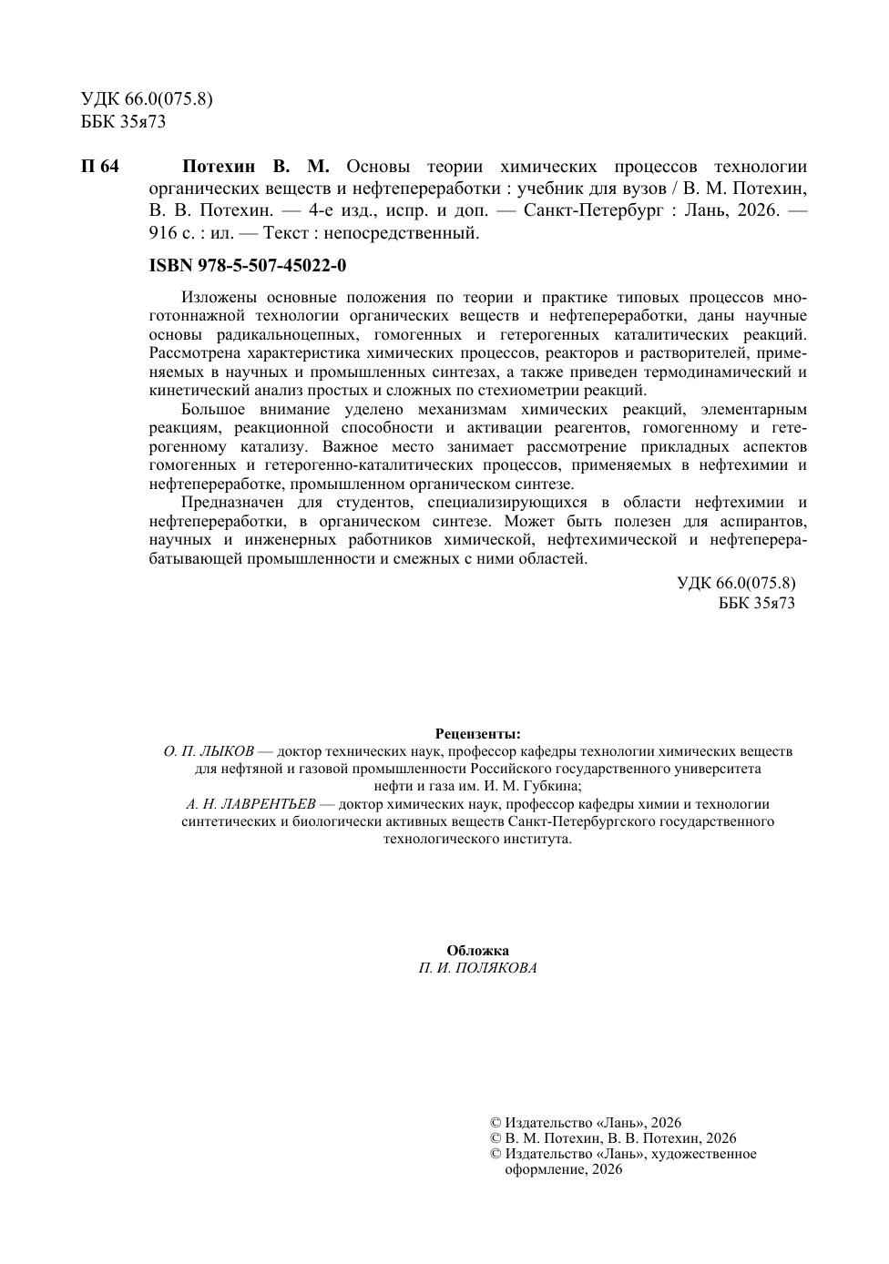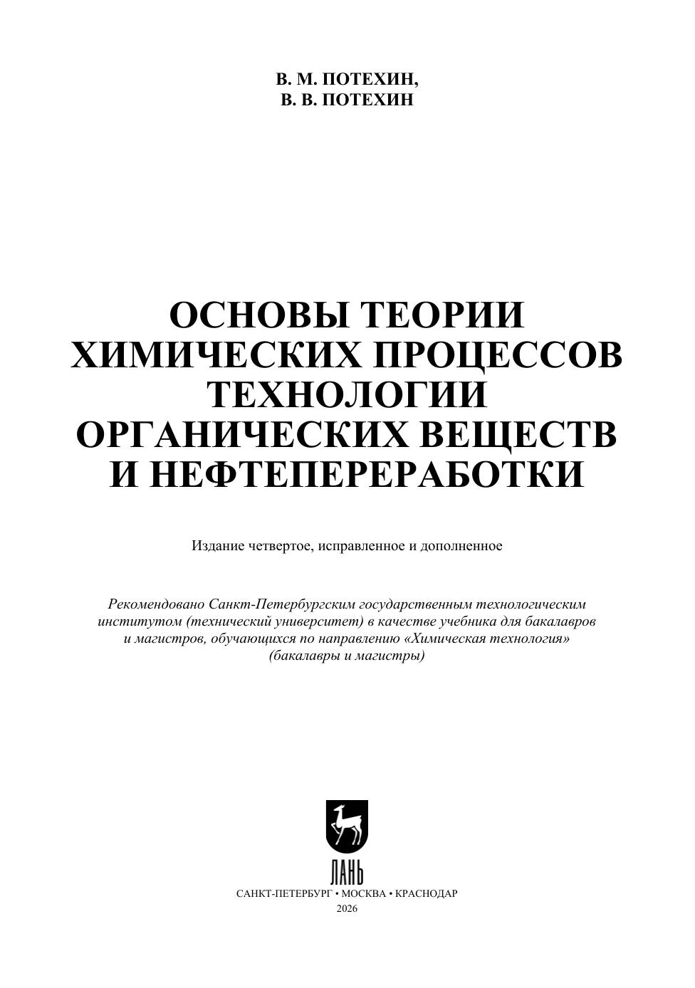 Изложены основные положения по теории и практике типовых процессов многотоннажной технологии органических веществ и нефтепереработки, даны научные основы радикальноцепных, гомогенных и гетерогенных каталитических реакций. Рассмотрена характеристика химических процессов, реакторов и растворителей, применяемых в научных и промышленных синтезах, а также приведен термодинамический и кинетический анализ простых и сложных по стехиометрии реакций. Большое внимание уделено механизмам химических реакций, элементарным реакциям, реакционной способности и активации реагентов, гомогенному и гетерогенному катализу. Важное место занимает рассмотрение прикладных аспектов гомогенных и гетерогенно-каталитических процессов, применяемых в нефтехимии и нефтепереработке, промышленном органическом синтезе. Предназначен для студентов, специализирующихся в области нефтехимии и нефтепереработки, в органическом синтезе. Может быть полезен для аспирантов, научных и инженерных работников химической, нефтехимической и нефтеперерабатывающей промышленности и смежных с ними областей.