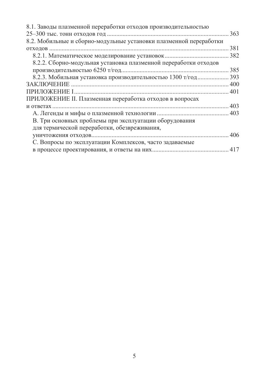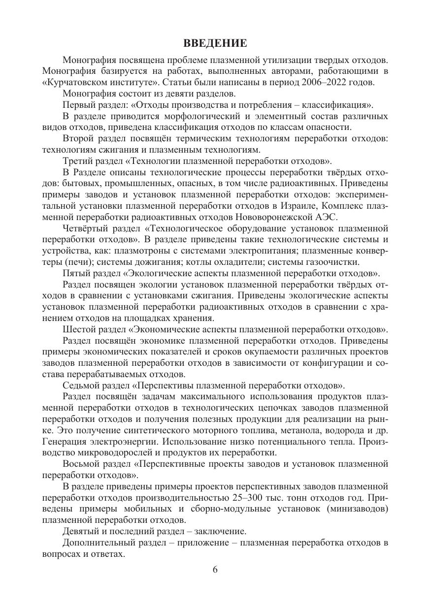 Приводится морфологический и элементный состав различных видов отходов, приведена классификация отходов по классам опасности. Описаны технологические процессы переработки твёрдых отходов: бытовых, промышленных, опасных, в том числе радиоактивных. Приведены примеры заводов и установок плазменной переработки отходов. Описаны экологические аспекты установок плазменной переработки радиоактивных отходов в сравнении с хранением отходов на площадках хранения. Даны примеры экономических показателей и сроков окупаемости различных проектов заводов плазменной переработки отходов в зависимости от конфигурации и состава перерабатываемых отходов.