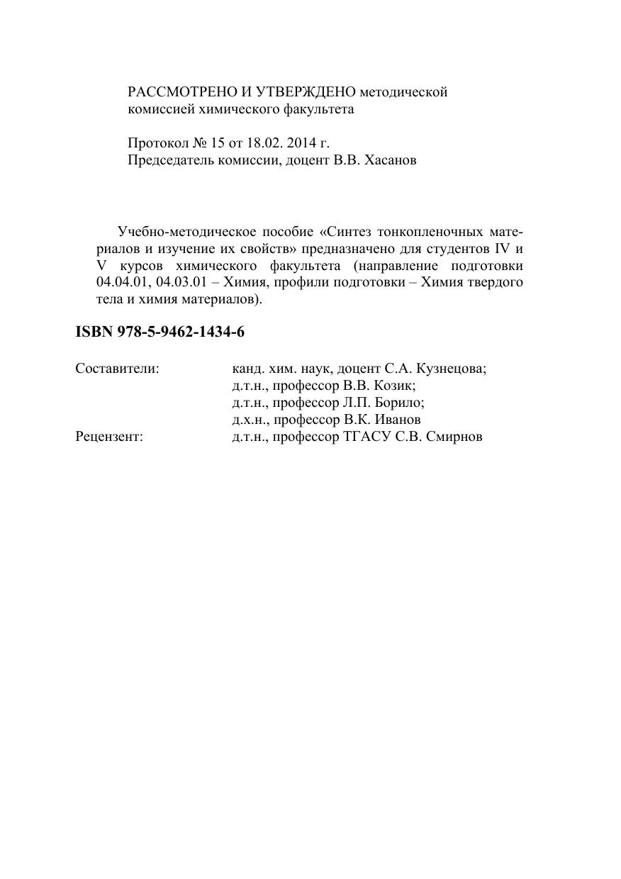 Учебно-методическое пособие «Синтез тонкопленочных материалов и изучение их свойств» предназначено для студентов IV и V курсов химического факультета (направление подготовки 04.04.01, 04.03.01 ? Химия, профили подготовки – Химия твердого тела и химия материалов).