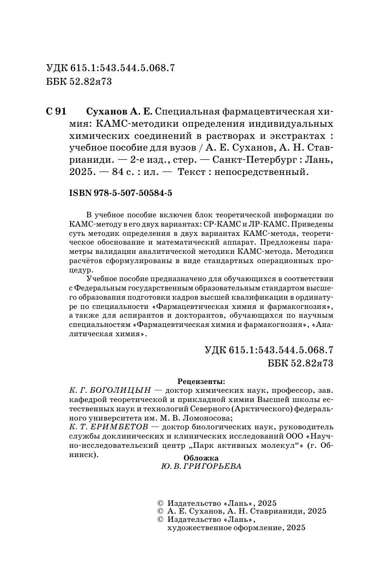 В учебное пособие включен блок теоретической информации по КАМС-методу в его двух вариантах: СР-КАМС и ЛР-КАМС. Приведены суть методик определения в двух вариантах КАМС-метода, теоретическое обоснование и математический аппарат. Предложены параметры валидации аналитической методики КАМС-метода. Методики расчётов сформулированы в виде стандартных операционных процедур. Учебное пособие предназначено для обучающихся в соответствии с Федеральным государственным образовательным стандартом высшего образования подготовки кадров высшей квалификации в ординатуре по специальности «Фармацевтическая химия и фармакогнозия», а также для аспирантов и докторантов, обучающихся по научным специальностям «Фармацевтическая химия и фармакогнозия», «Аналитическая химия».