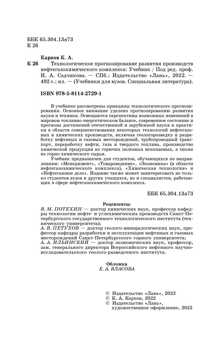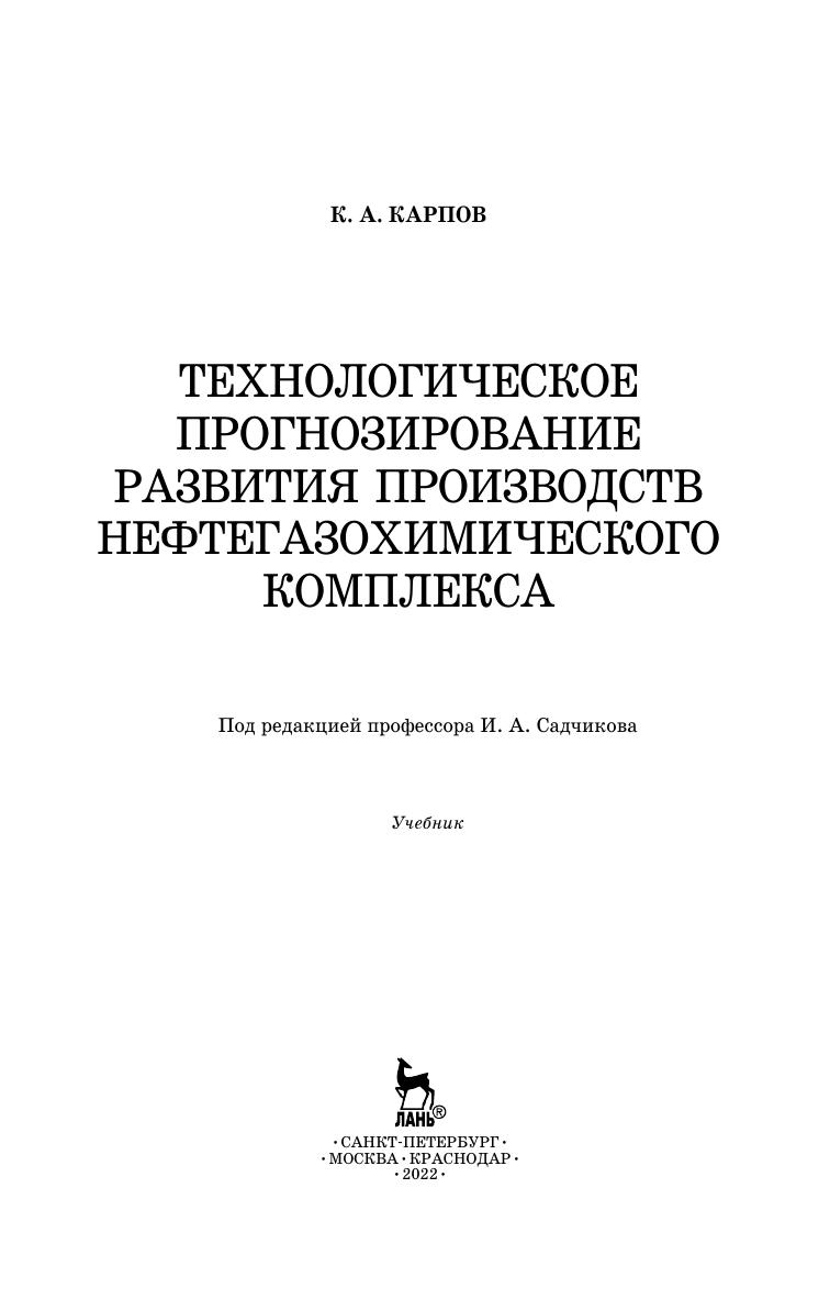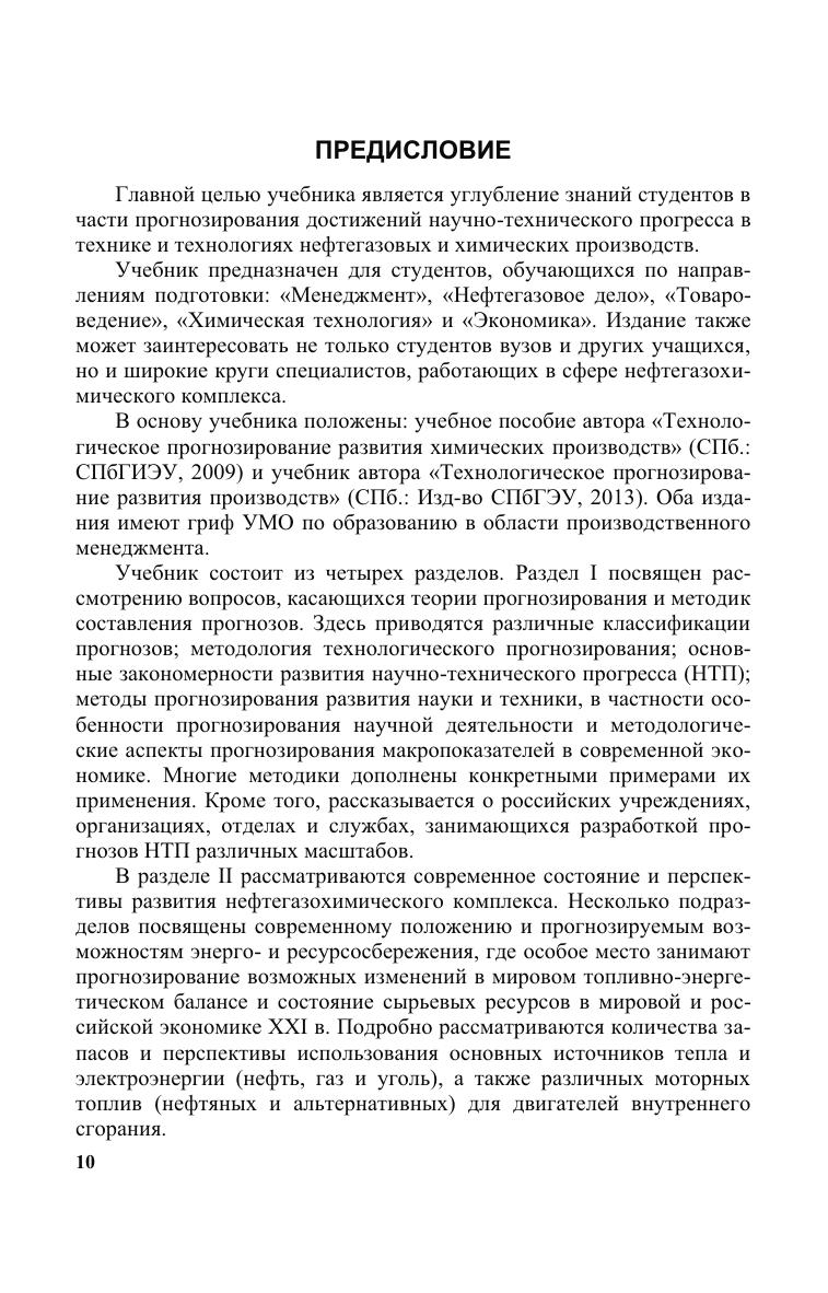 В учебнике рассмотрены принципы технологического прогнозирования. Основное внимание уделено прогнозированию развития науки и техники. Освещаются перспективы возможных изменений в мировом топливно-энергетическом балансе, современное состояние и прогнозы достижений отечественной и зарубежной науки и практики в области совершенствования некоторых технологий нефтегазовых и химических производств, включая геологоразведку и разработку нефтяных и газовых месторождений, трубопроводный транспорт, переработку нефти, газа и твердого топлива, производство химической продукции из горючих полезных ископаемых, а также из горно-химического сырья. Учебник предназначен для студентов, обучающихся по направлениям: «Менеджмент», «Экономика» (в области нефтегазохимического комплекса), «Химическая технология» и «Нефтегазовое дело». Издание также может заинтересовать не только студентов вузов и других учащихся, но и специалистов, работающих в сфере нефтегазохимического комплекса.