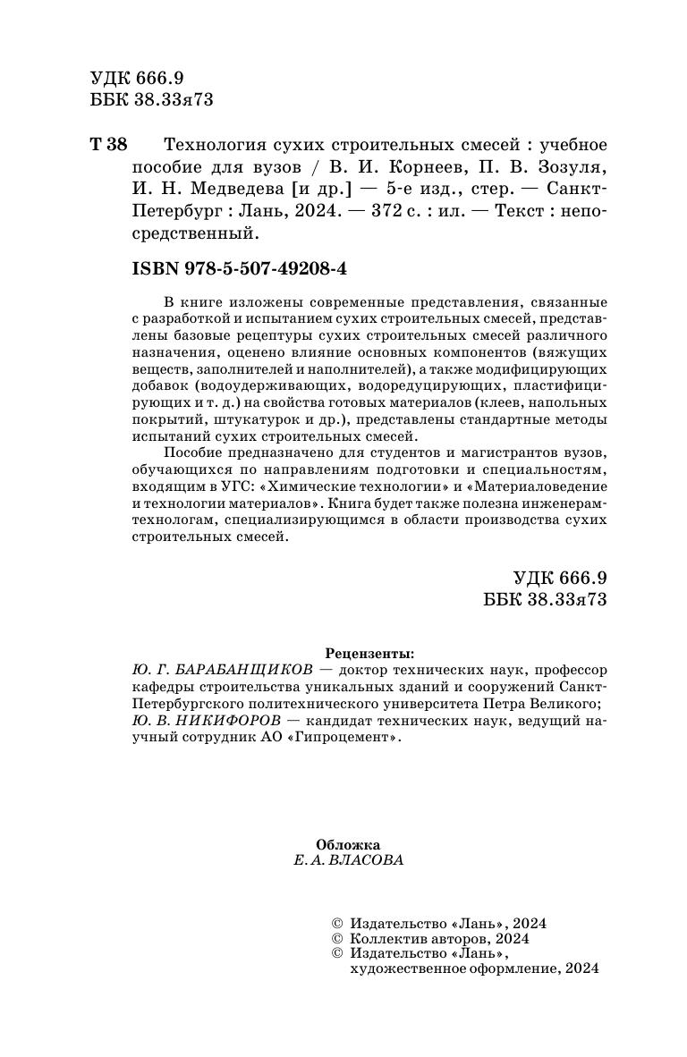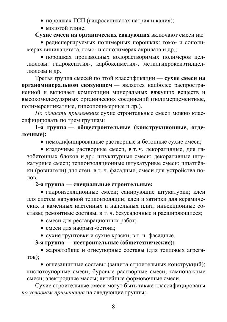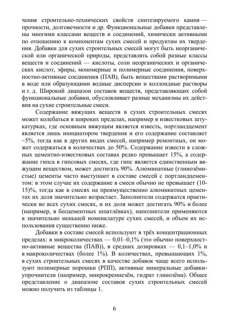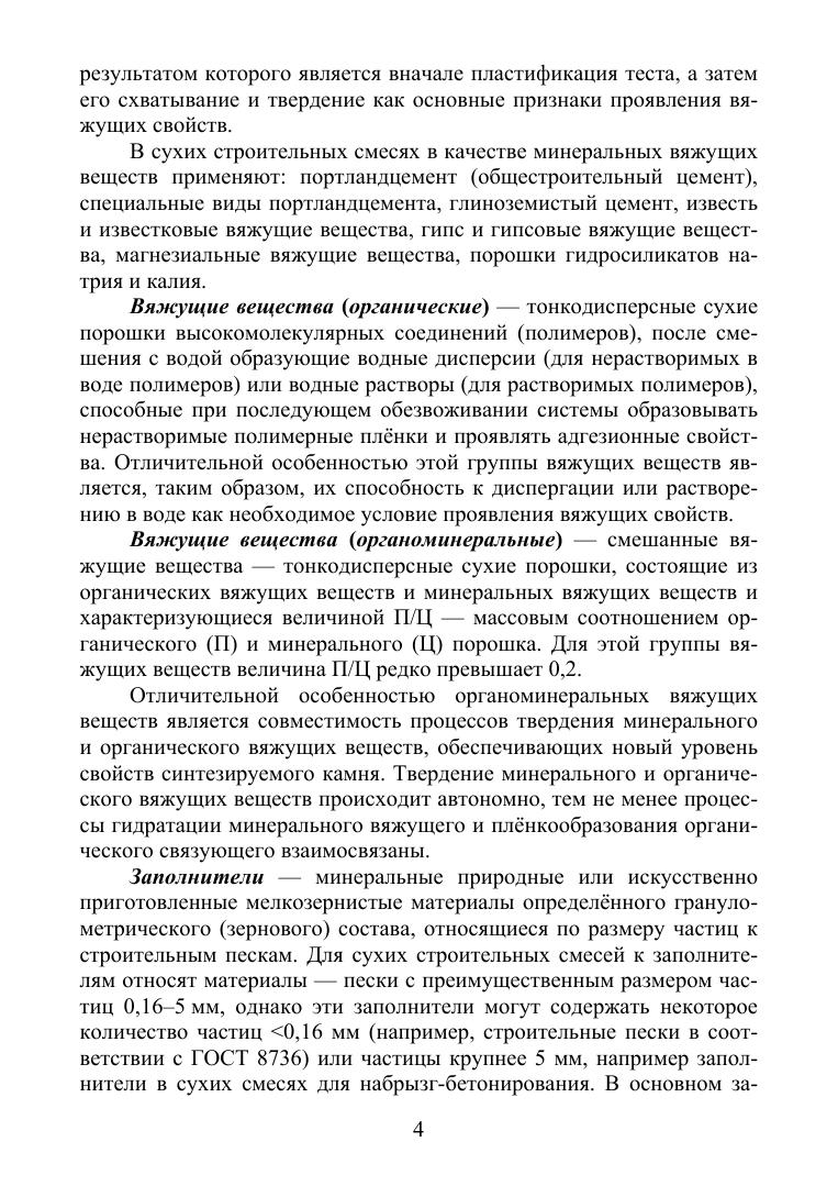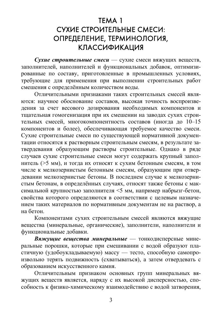 В книге изложены современные представления, связанные с разработкой и испытанием сухих строительных смесей, представлены базовые рецептуры сухих строительных смесей различного назначения, оценено влияние основных компонентов (вяжущих веществ, заполнителей и наполнителей), а также модифицирующих добавок (водоудерживающих, водоредуцирующих, пластифицирующих и т. д.) на свойства готовых материалов (клеев, напольных покрытий, штукатурок и др.), представлены стандартные методы испытаний сухих строительных смесей. Книга будет полезна студентам, инженерам-технологам, специализирующимся в области производства сухих строительных смесей.