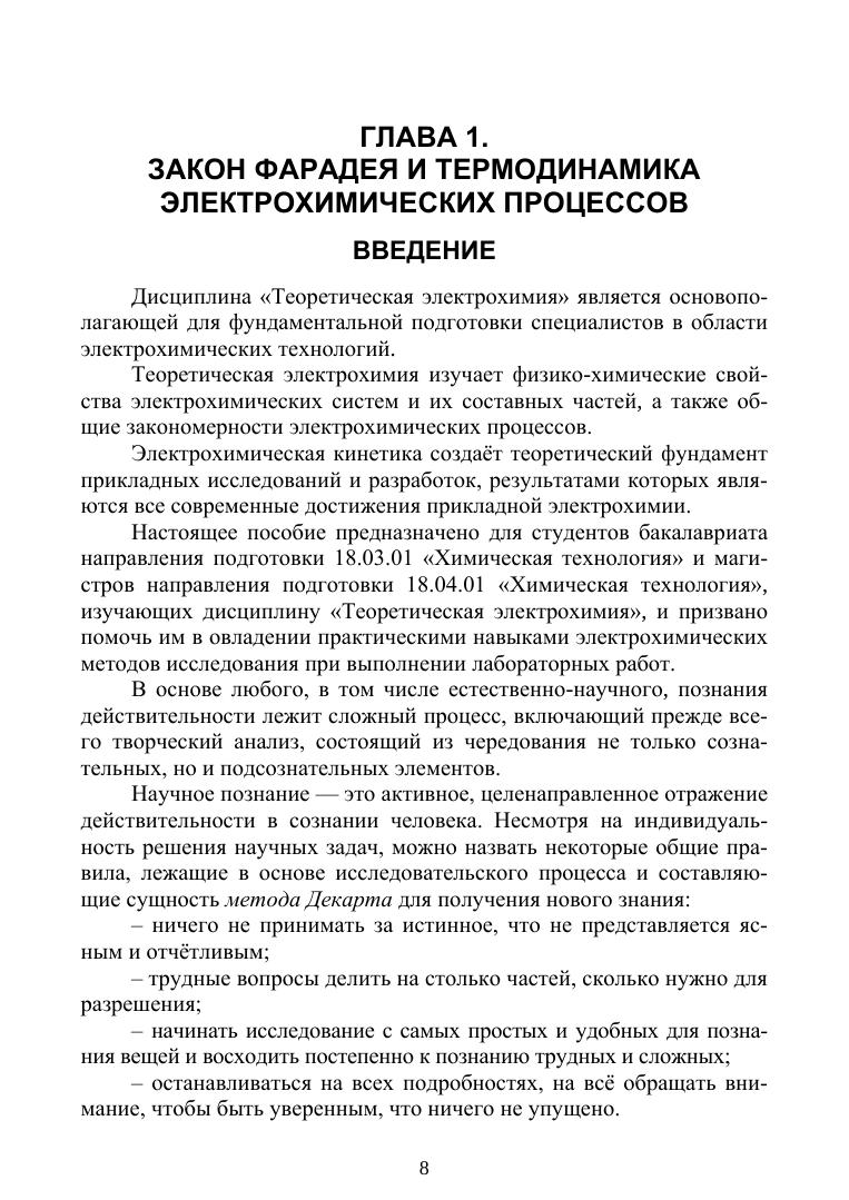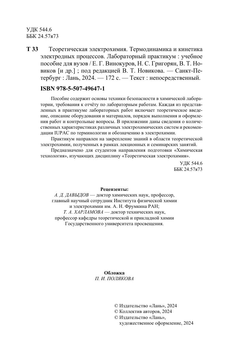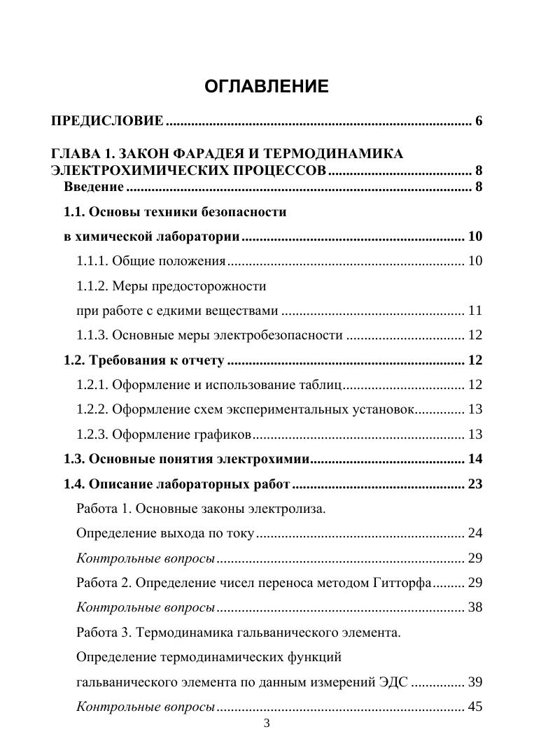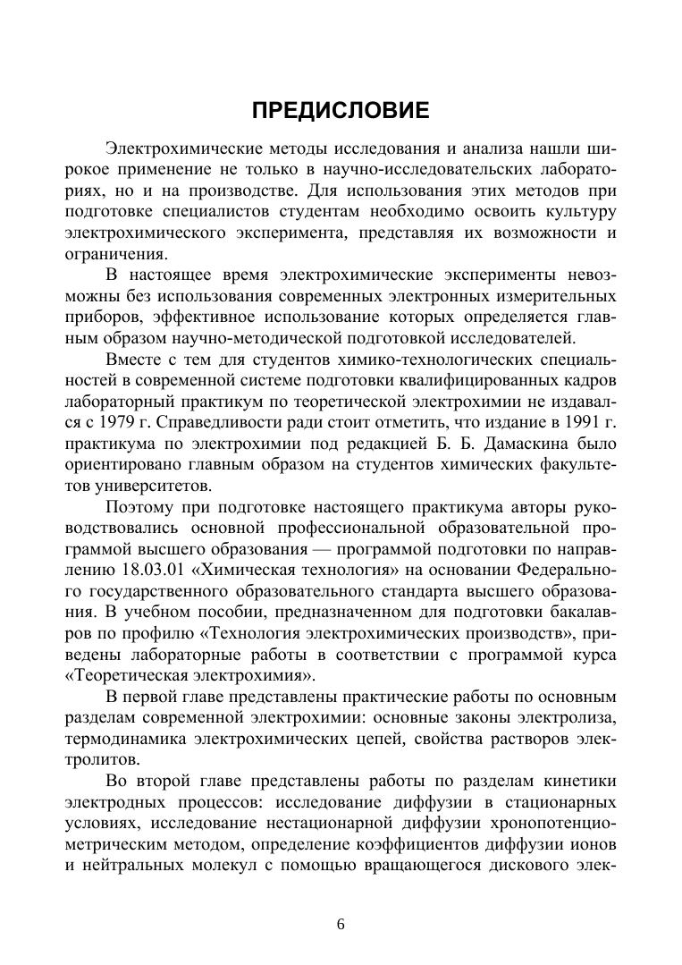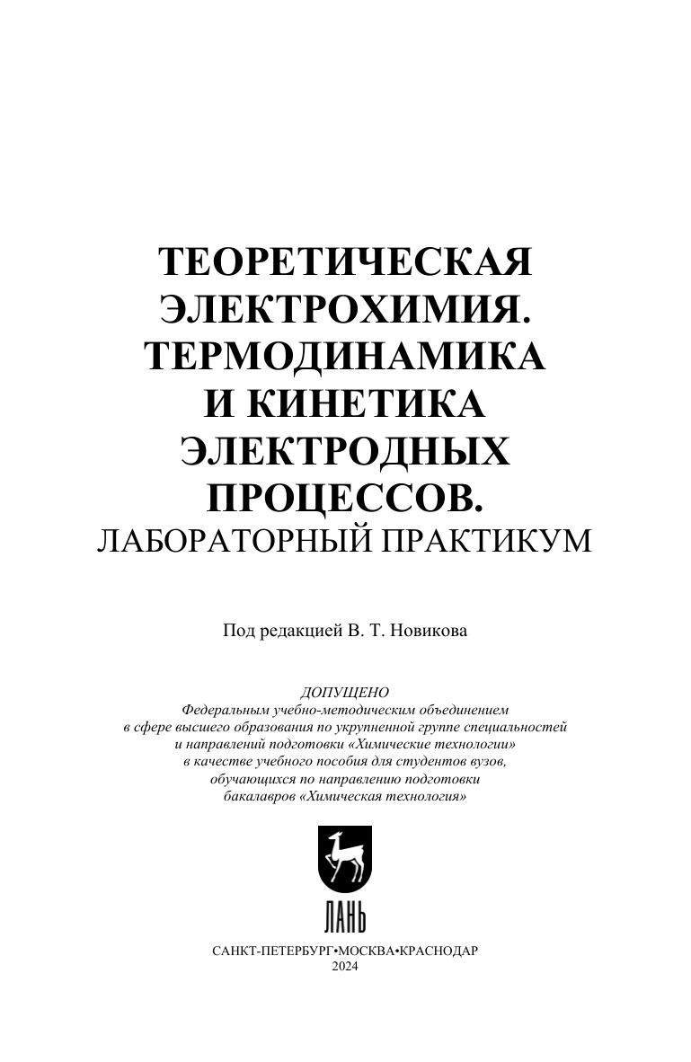 Пособие содержит основы техники безопасности в химической лаборатории, требования к отчёту по лабораторным работам. Каждая из представленных в практикуме лабораторных работ включает теоретическое введение, описание оборудования и материалов, порядок выполнения и оформления работ и контрольные вопросы. В приложении даны сведения о количественных характеристиках различных электрохимических систем и рекомендации IUPAC по терминологии и обозначению в электрохимии. Практикум направлен на закрепление знаний в области теоретической электрохимии, полученных в рамках лекционных и семинарских занятий. Предназначено для студентов направления подготовки «Химическая технология», изучающих дисциплину «Теоретическая электрохимия».