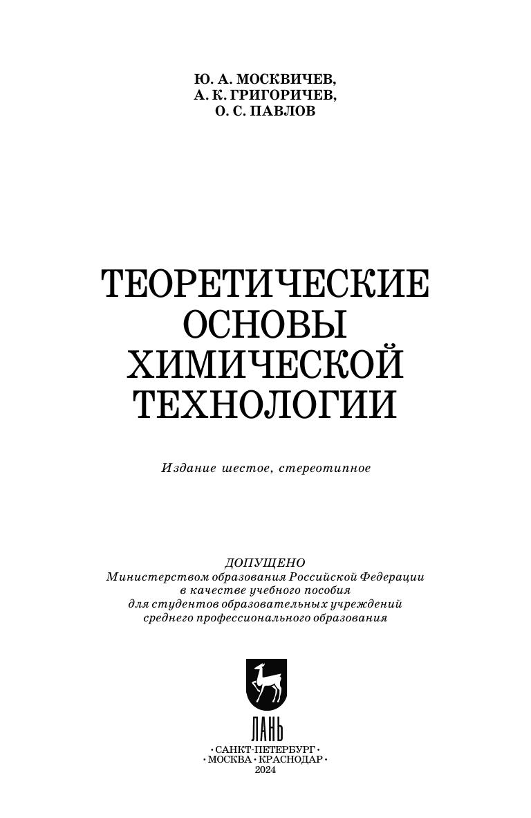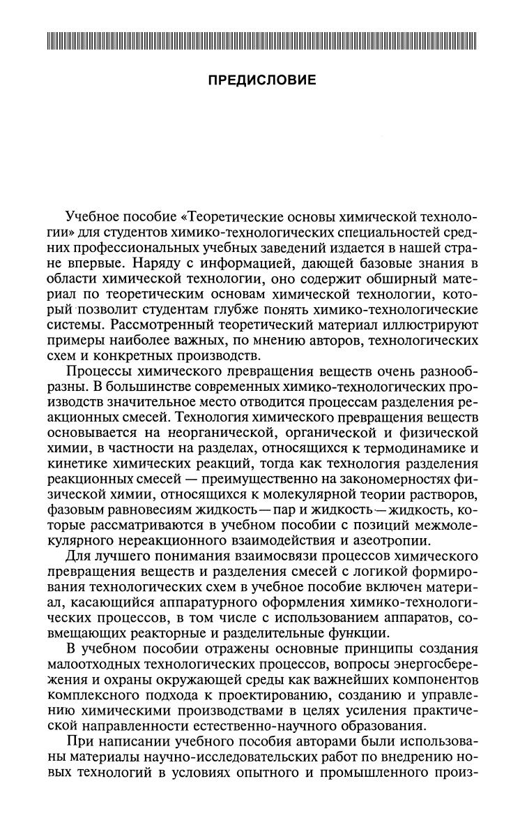 Рассмотрены теоретические основы химической технологии. Приведены примеры наиболее важных технологических схем применительно к конкретному производству. Большое внимание уделено изложению теоретических основ процессов химического превращения веществ и взаимосвязанных с ними процессов разделения реакционных смесей как неотъемлемых составляющих современного химического производства. Соответствует современным требованиям Федерального государственного образовательного стандарта среднего профессионального образования и профессиональным квалификационным требованиям. Для студентов средних профессиональных учебных заведений.