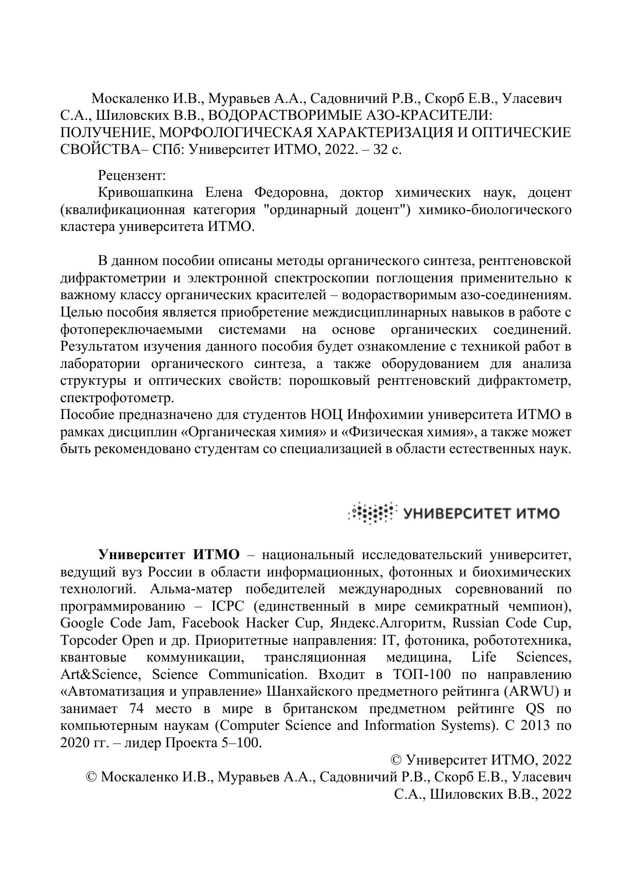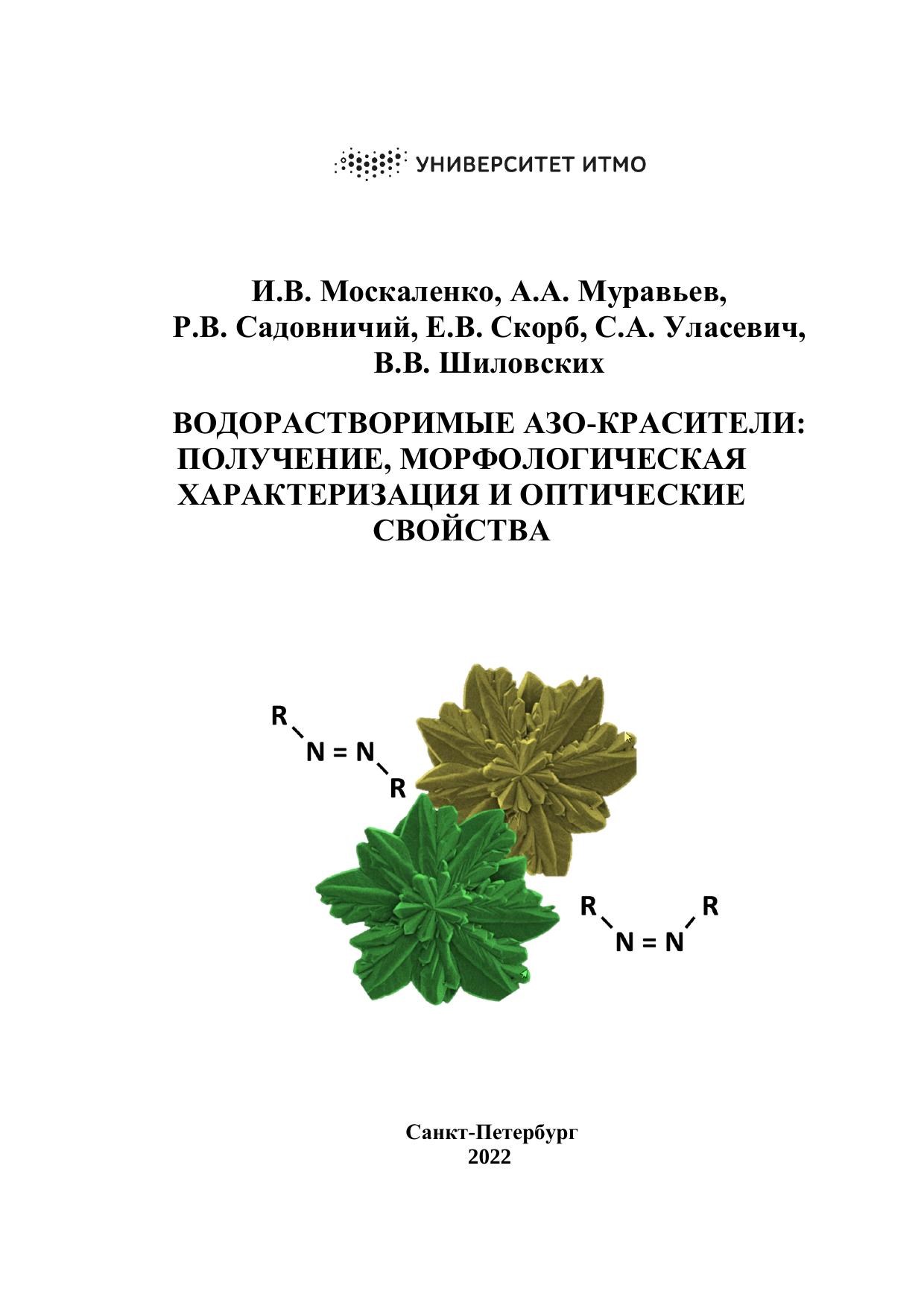 В данном пособии описаны методы органического синтеза, рентгеновской дифрактометрии и электронной спектроскопии поглощения применительно к важному классу органических красителей – водорастворимым азо-соединениям. Целью пособия является приобретение междисциплинарных навыков в работе с фотопереключаемыми системами на основе органических соединений. Результатом изучения данного пособия будет ознакомление с техникой работ в лаборатории органического синтеза, а также оборудованием для анализа структуры и оптических свойств: порошковый рентгеновский дифрактометр, спектрофотометр. Пособие предназначено для студентов НОЦ Инфохимии университета ИТМО в рамках дисциплин «Органическая химия» и «Физическая химия», а также может быть рекомендовано студентам со специализацией в области естественных наук.