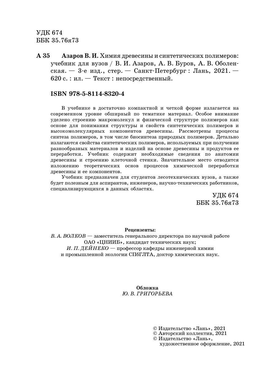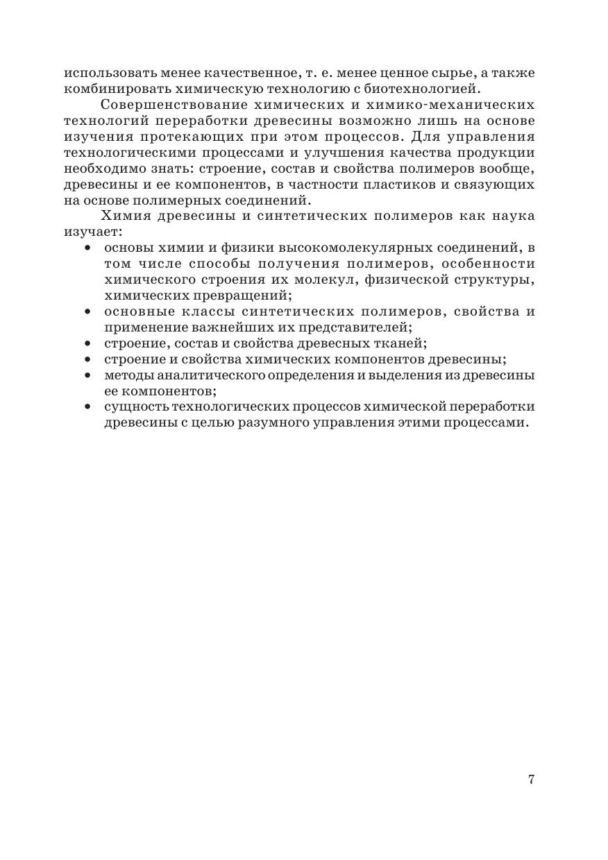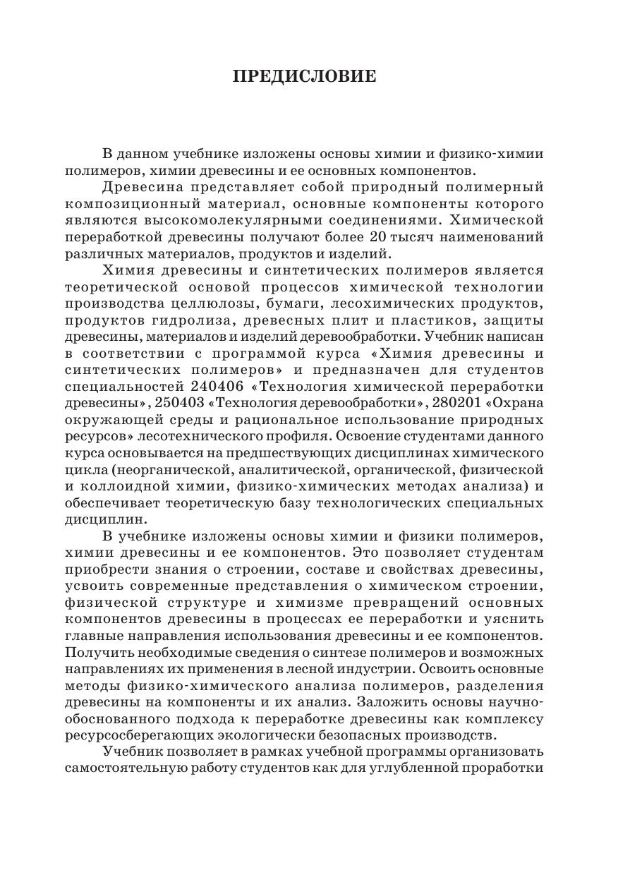 В учебнике в достаточно компактной и четкой форме излагается на современном уровне обширный по тематике материал. Особое внимание уделено строению макромолекул и физической структуре полимеров как основе для понимания структуры и свойств синтетических полимеров и высокомолекулярных компонентов древесины. Рассмотрены процессы синтеза полимеров, в том числе биосинтеза природных полимеров. Детально излагаются свойства синтетических полимеров, используемых при получении разнообразных материалов и изделий на основе древесины и продуктов ее переработки. Учебник содержит необходимые сведения по анатомии древесины и строению клеточной стенки. Значительное место отводится изложению теоретических основ процессов химической переработки древесины и ее компонентов.