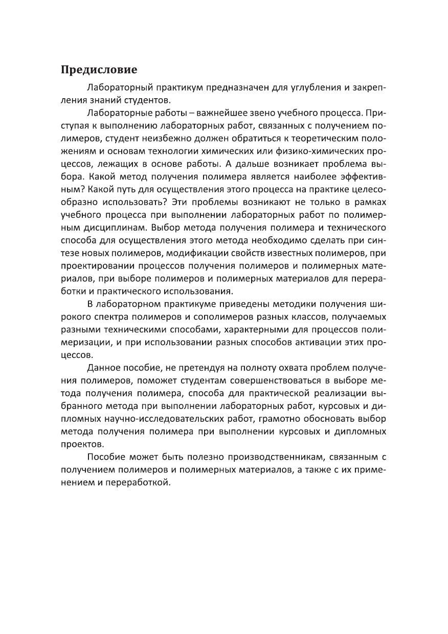 Учебное пособие представляет собой руководство для выполнения лабора-торных работ. В нем содержится информация, необходимая для выбора методов получения полимеров и способа их практической реализации, а также приведены основные методики получения полимеров методом полимеризации.