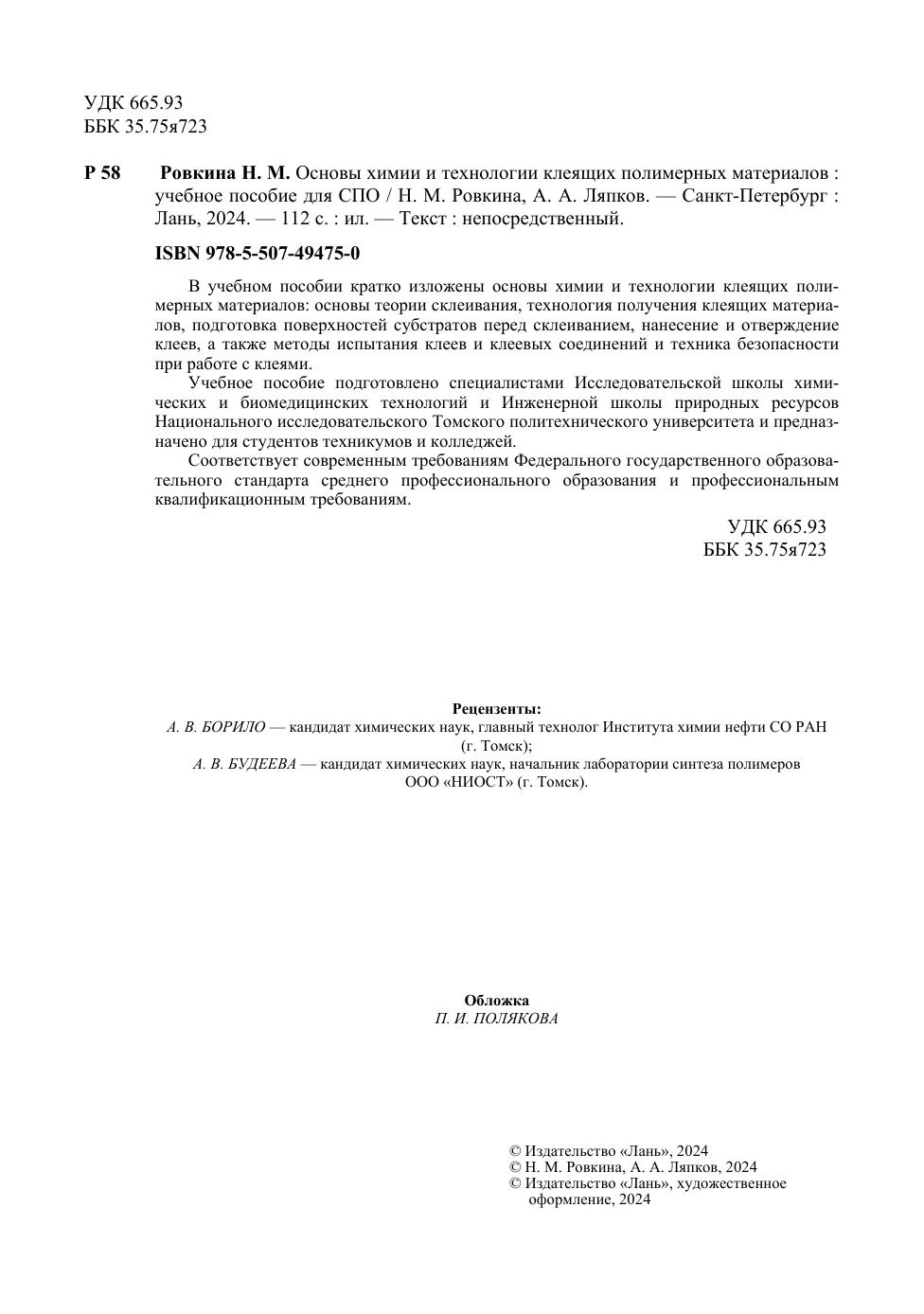 В учебном пособии кратко изложены основы химии и технологии клеящих полимерных материалов: основы теории склеивания, технология получения клеящих материалов, подготовка поверхностей субстратов перед склеиванием, нанесение и отверждение клеев, а также методы испытания клеев и клеевых соединений и техника безопасности при работе с клеями. Учебное пособие подготовлено специалистами Исследовательской школы химических и биомедицинских технологий и Инженерной школы природных ресурсов Национального исследовательского Томского политехнического университета и предназначено для студентов техникумов и колледжей. Соответствует современным требованиям Федерального государственного образовательного стандарта среднего профессионального образования и профессиональным квалификационным требованиям.