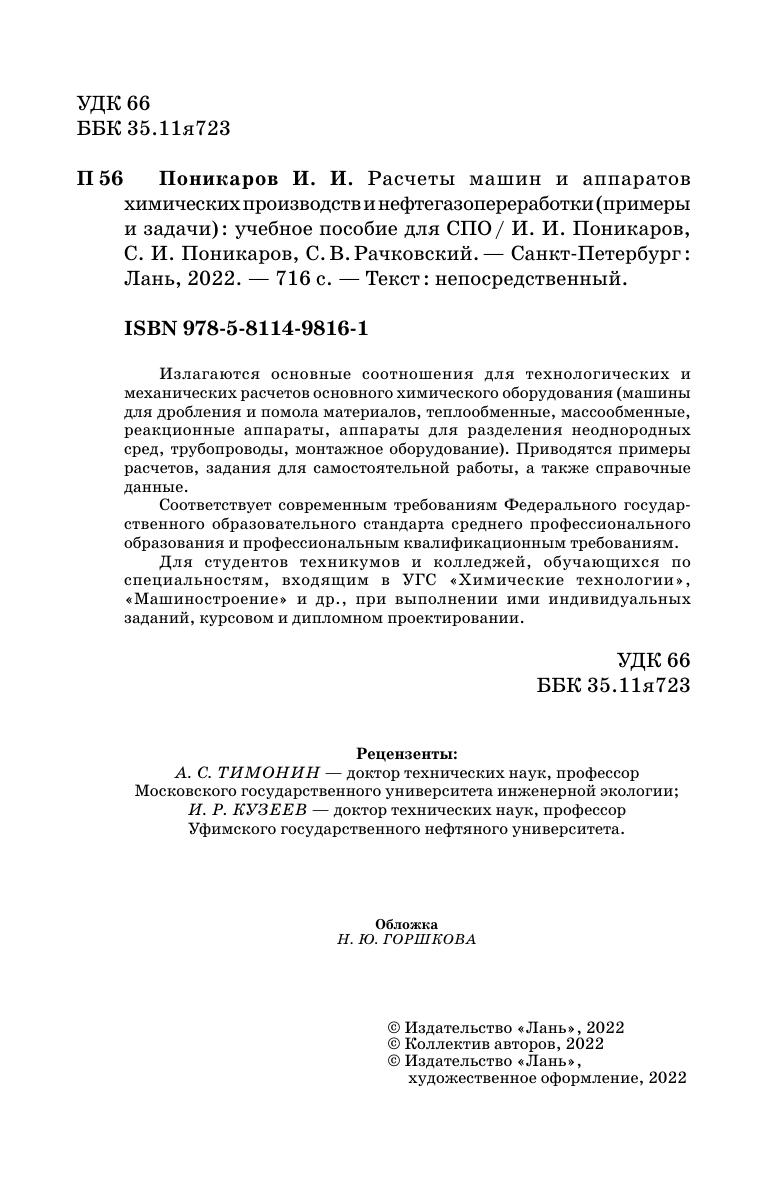 Излагаются основные соотношения для технологических и механических расчетов основного химического оборудования (машины для дробления и помола материалов, теплообменные, массообменные, реакционные аппараты, аппараты для разделения неоднородных сред, трубопроводы, монтажное оборудование). Приводятся примеры расчетов, задания для самостоятельной работы, а также справочные данные. Соответствует современным требованиям Федерального государственного образовательного стандарта среднего профессионального образования и профессиональным квалификационным требованиям. Для студентов техникумов и колледжей, обучающихся по специальностям, входящим в УГС «Химические технологии», «Машиностроение» и др. при выполнении ими индивидуальных заданий, курсовом и дипломном проектировании.