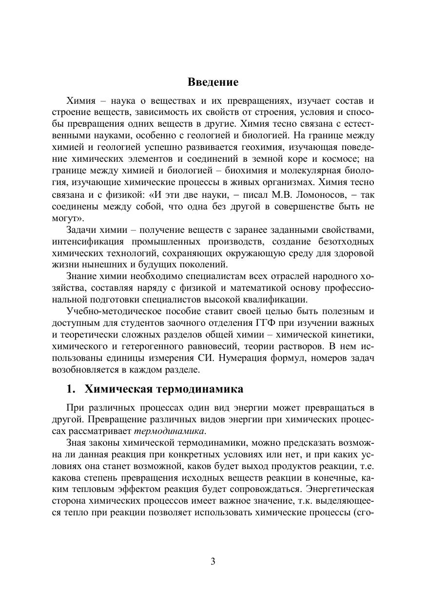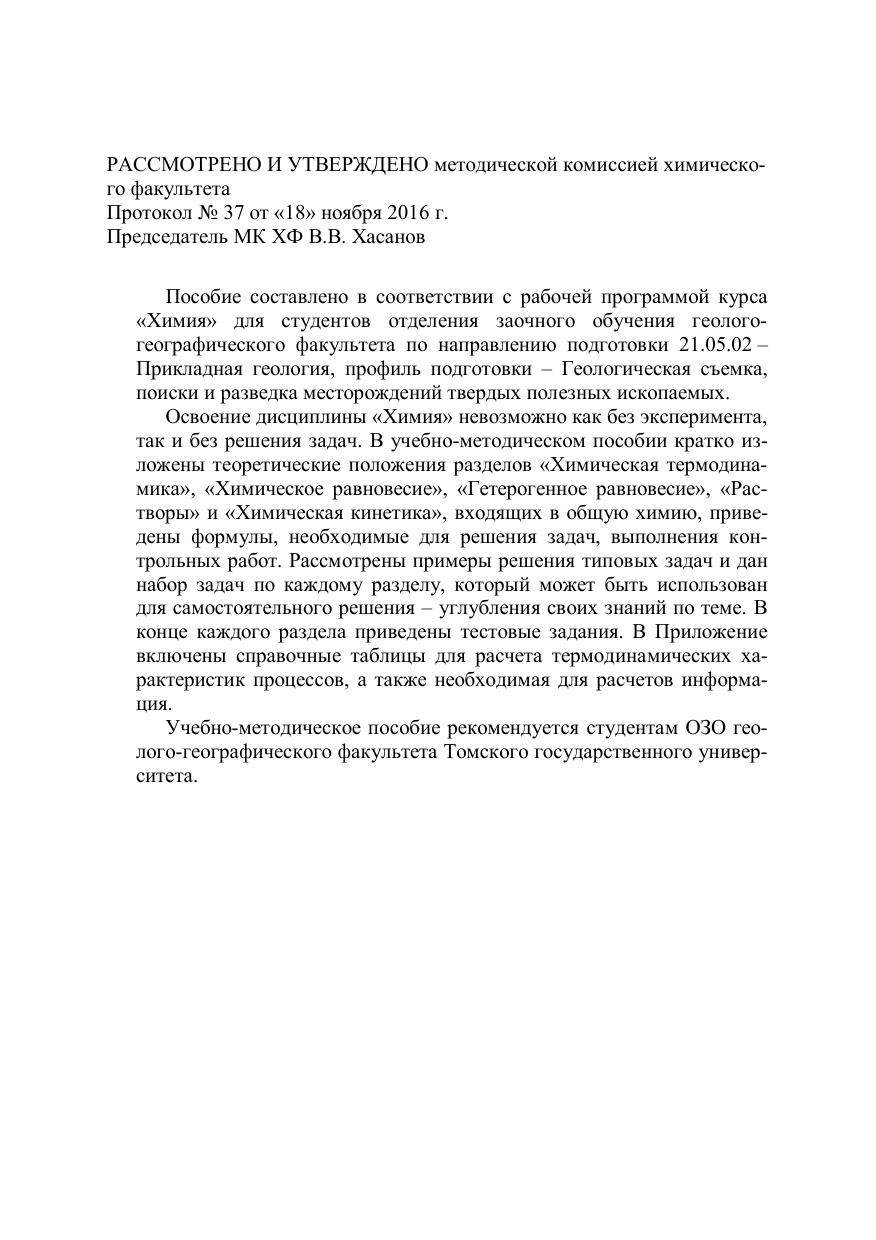 Пособие составлено в соответствии с рабочей программой курса «Химия» для студентов отделения заочного обучения геолого-географического факультета по направлению подготовки 21.05.02 – Прикладная геология, профиль подготовки – Геологическая съемка, поиски и разведка месторождений твердых полезных ископаемых. Освоение дисциплины «Химия» невозможно как без эксперимента, так и без решения задач. В учебно-методическом пособии кратко изложены теоретические положения разделов «Химическая термодинамика», «Химическое равновесие», «Гетерогенное равновесие», «Растворы» и «Химическая кинетика», входящих в общую химию, приведены формулы, необходимые для решения задач, выполнения контрольных работ. Рассмотрены примеры решения типовых задач и дан набор задач по каждому разделу, который может быть использован для самостоятельного решения – углубления своих знаний по теме. В конце каждого раздела приведены тестовые задания. В Приложение включены справочные таблицы для расчета термодинамических характеристик процессов, а также необходимая для расчетов информация. Учебно-методическое пособие рекомендуется студентам ОЗО геолого-географического факультета Томского государственного университета.