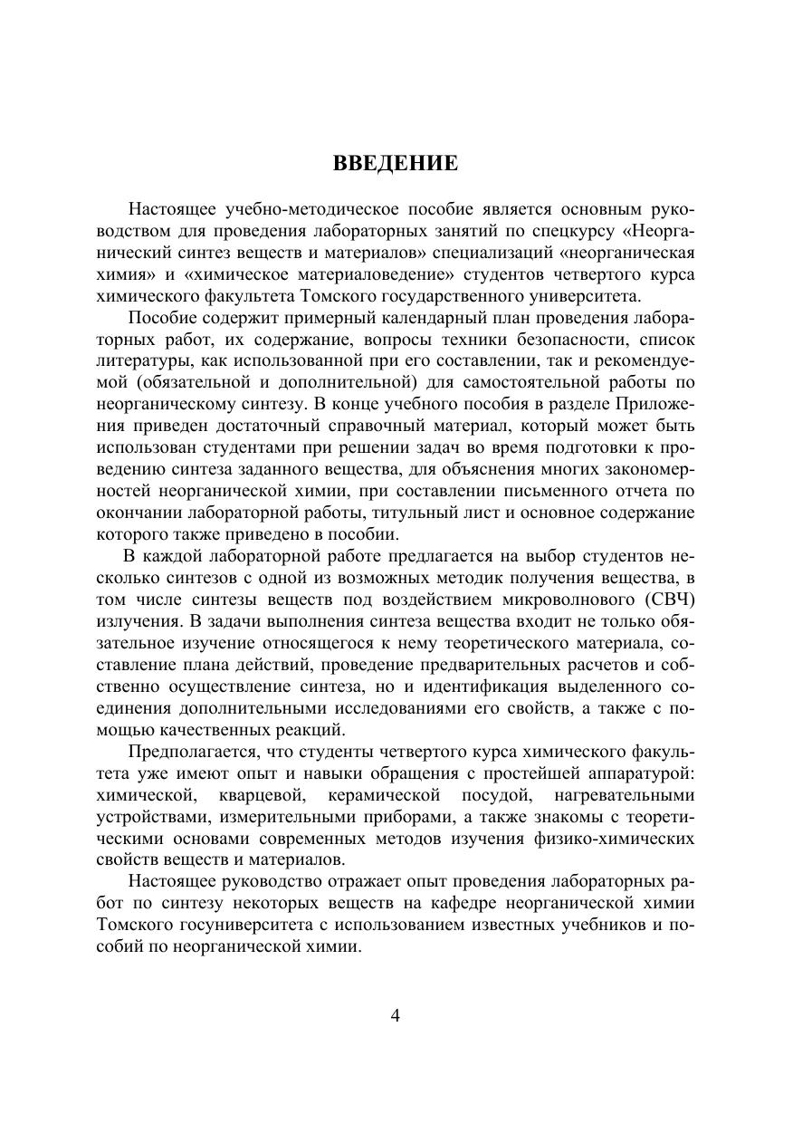 Учебно-методическое пособие является основным руководством для проведения лабораторных занятий по спецкурсу «Неорганический синтез веществ и материалов» специализаций «неорганическая химия» и «химическое материаловедение» студентов четвертого курса химического факультета НИ ТГУ. Пособие содержит примерный календарный план проведения лабораторных работ, их содержание, вопросы техники безопасности, список использованной и рекомендуемой для самостоятельной работы литературы. В каждой лабораторной работе предлагается на выбор студентов несколько синтезов с одной из возможных методик получения вещества. В разделе Приложение в виде таблиц приведен достаточный для проведения синтеза справочный материал. Учебно-методическое пособие отражает опыт проведения лабораторных работ по синтезу некоторых веществ на кафедре неорганической химии Томского госуниверситета и предназначено для студентов химических специальностей университетов.