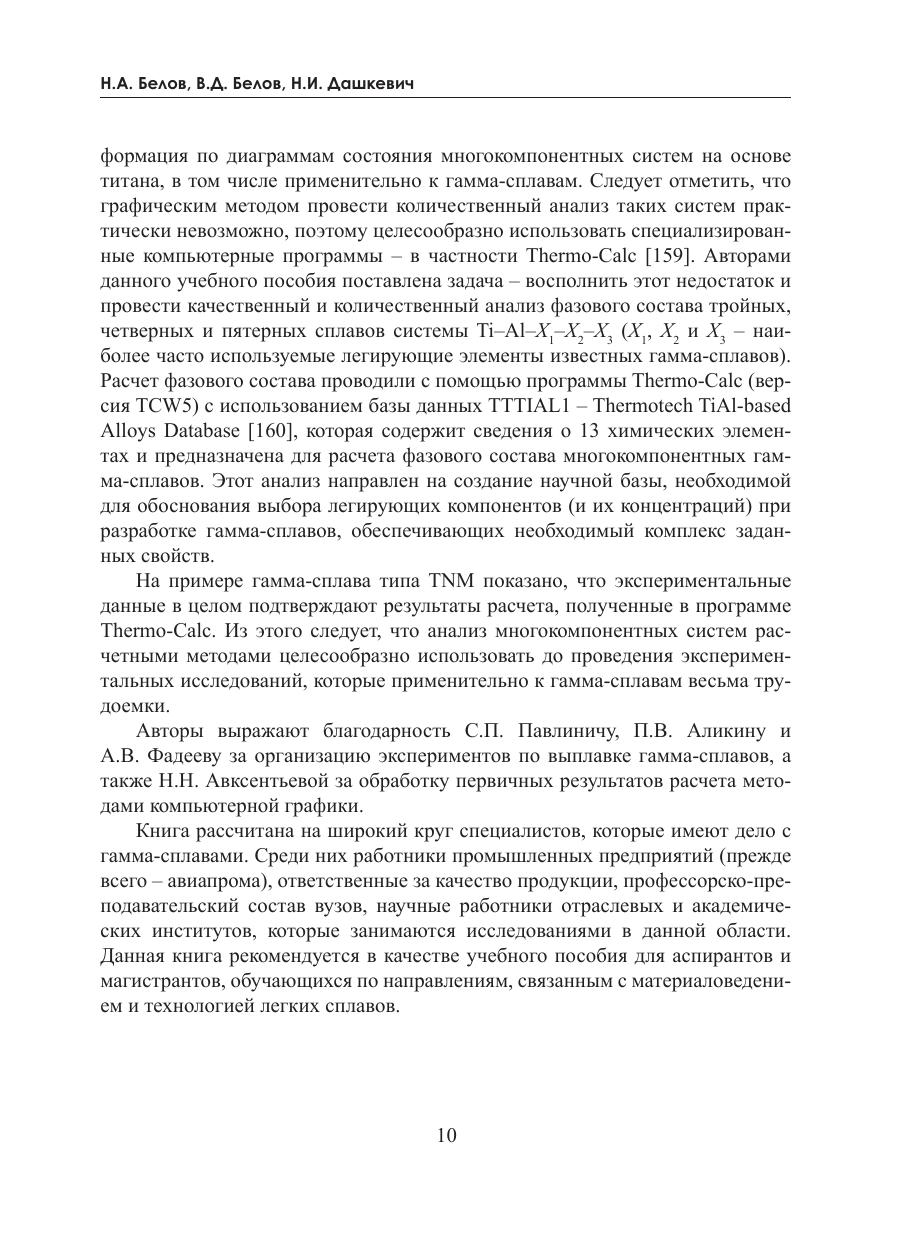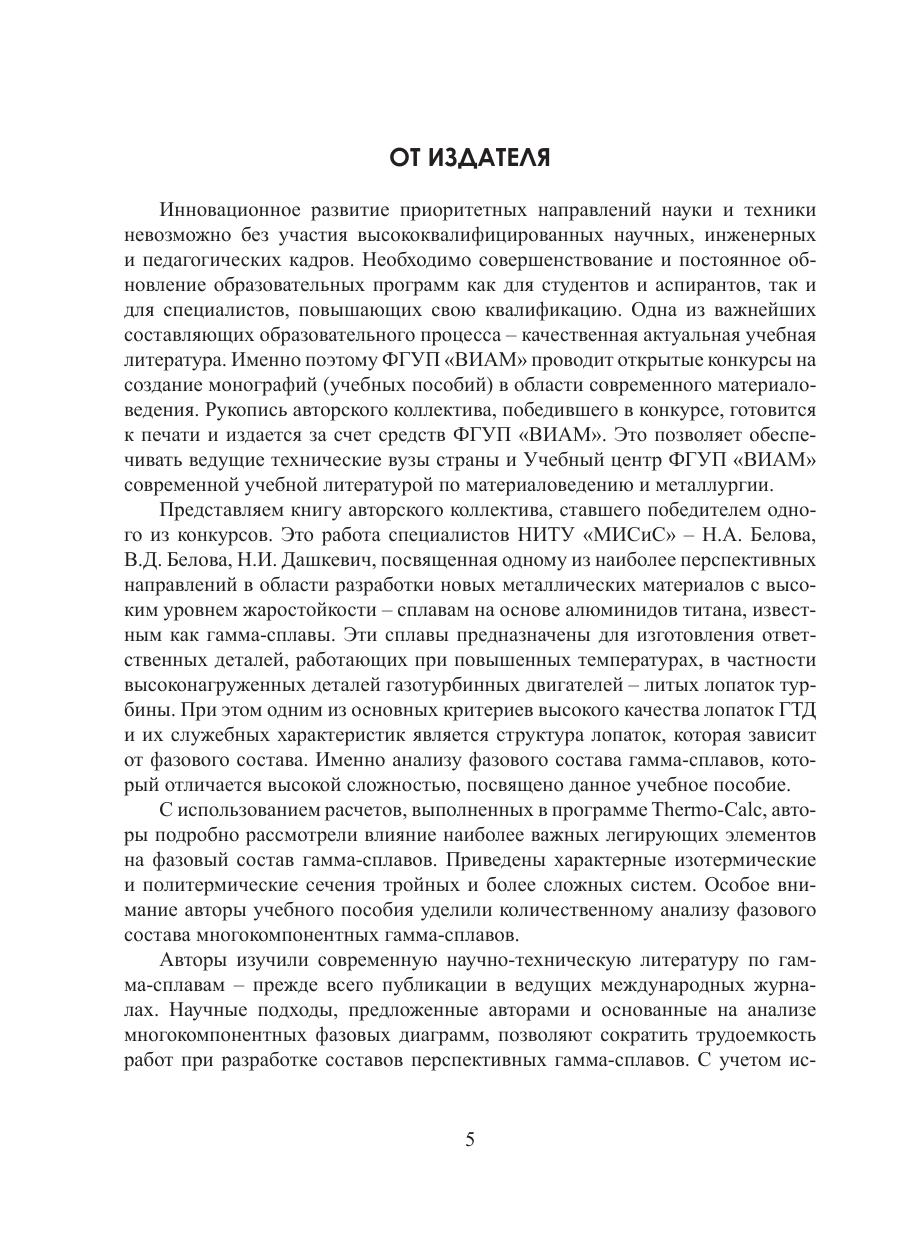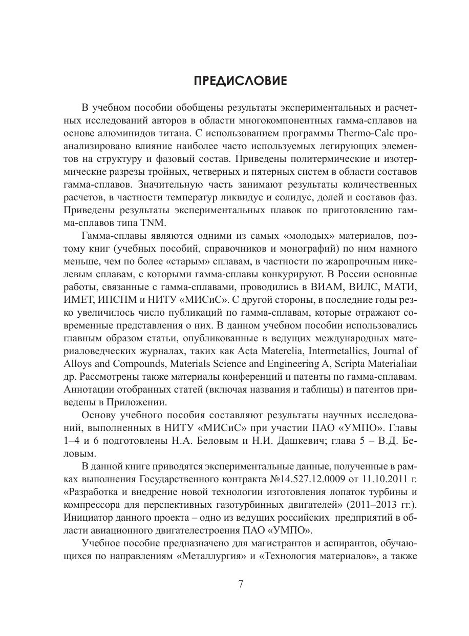 Книга рассчитана на широкий круг специалистов, которые используют для работы гамма-сплавы, а также может быть полезна аспирантам и магистрантам, обучающимся по материаловедческим специальностям, прежде всего в области легких сплавов, при выполнении диссертационных и квалификационных работ, связанных с гамма-сплавами.