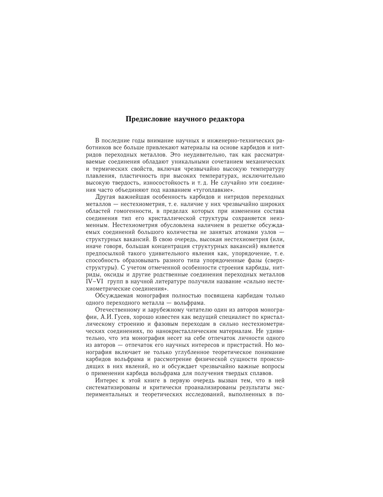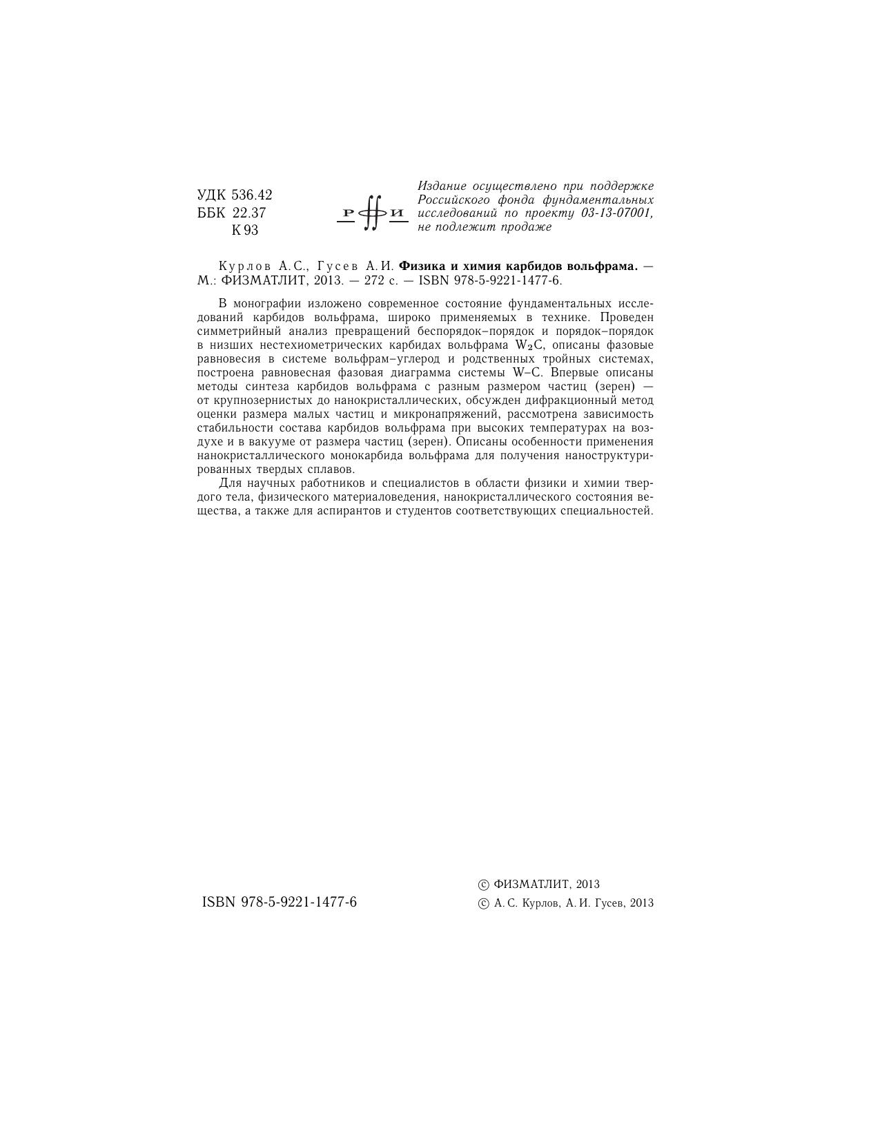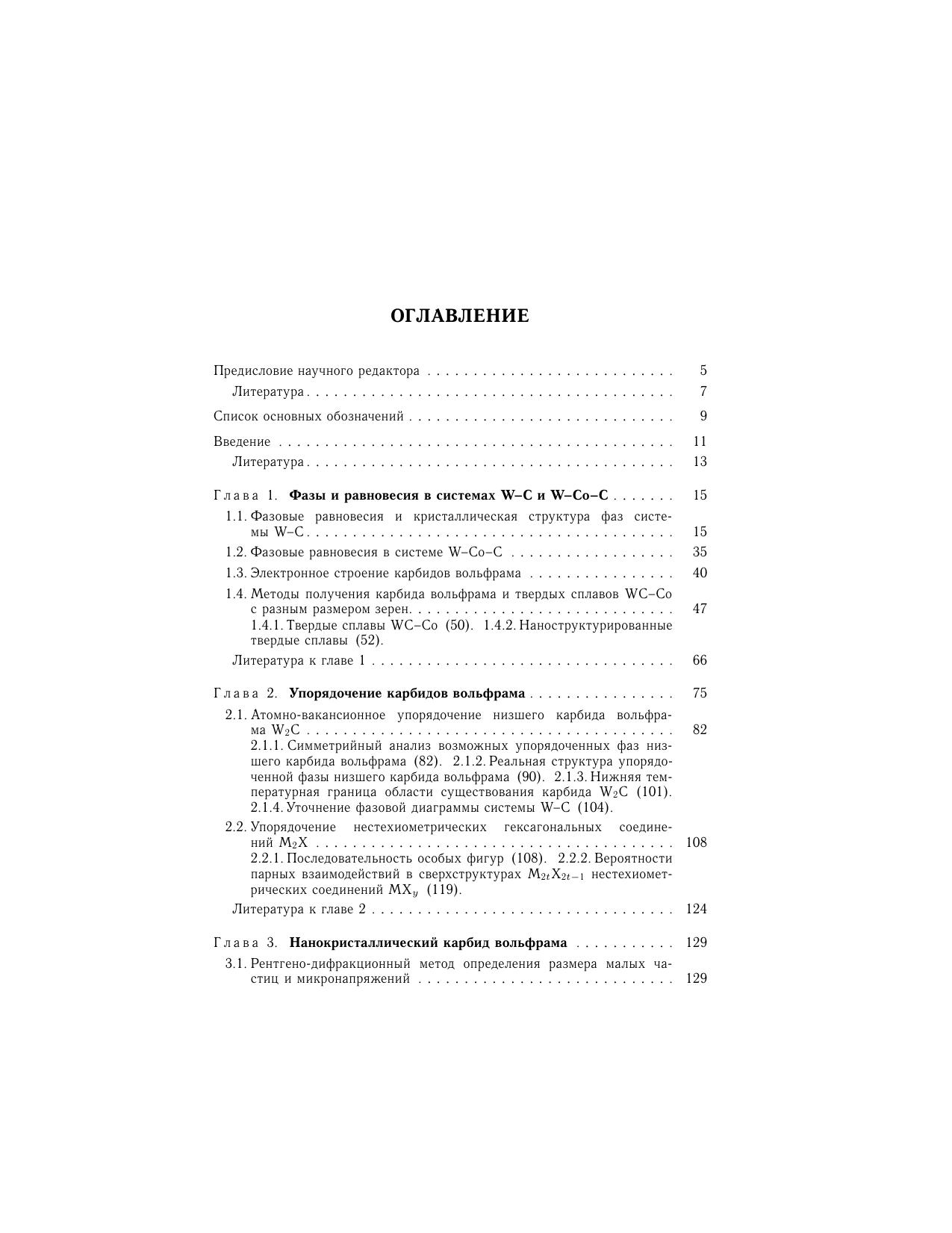В монографии изложено современное состояние фундаментальных исследований карбидов вольфрама, широко применяемых в технике. Проведен симметрийный анализ превращений беспорядок–порядок и порядок–порядок в низших нестехиометрических карбидах вольфрама W 2 C, описаны фазовые равновесия в системе вольфрам–углерод и родственных тройных системах, построена равновесная фазовая диаграмма системы W–C. Впервые описаны методы синтеза карбидов вольфрама с разным размером частиц (зерен) — от крупнозернистых до нанокристаллических, обсужден дифракционный метод оценки размера малых частиц и микронапряжений, рассмотрена зависимость стабильности состава карбидов вольфрама при высоких температурах на воздухе и в вакууме от размера частиц (зерен). Описаны особенности применения нанокристаллического монокарбида вольфрама для получения наноструктурированных твердых сплавов. Для научных работников и специалистов в области физики и химии твердого тела, физического материаловедения, нанокристаллического состояния вещества, а также для аспирантов и студентов соответствующих специальностей.