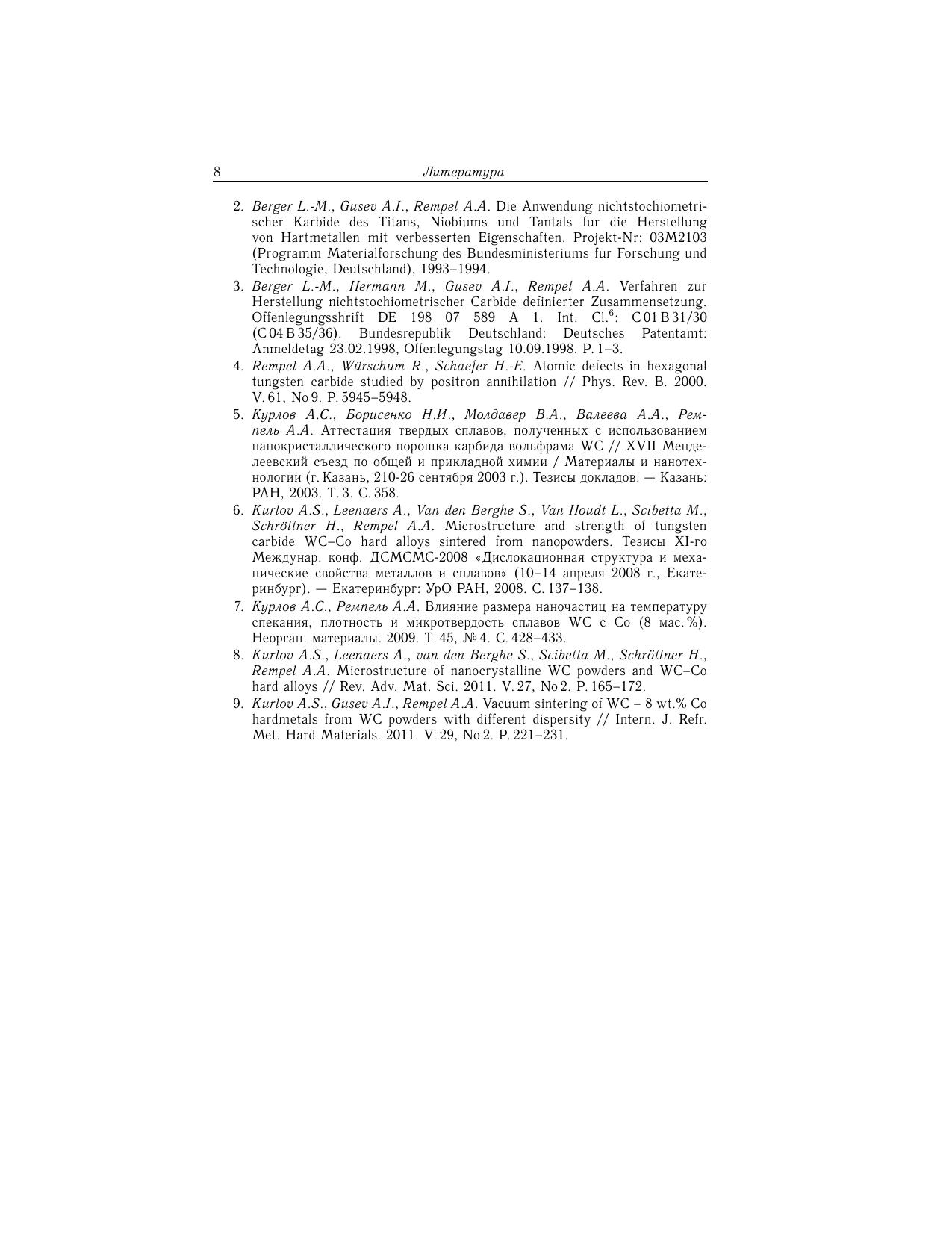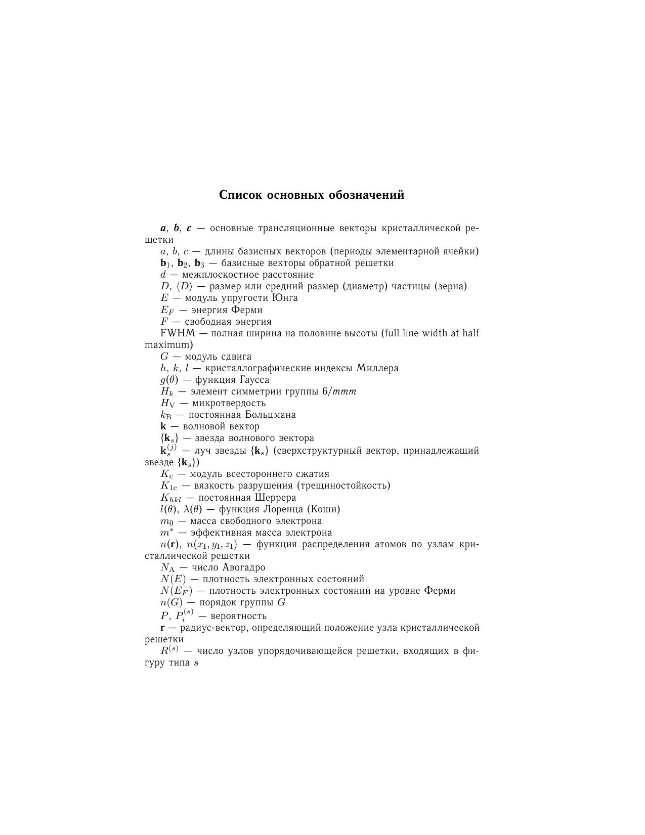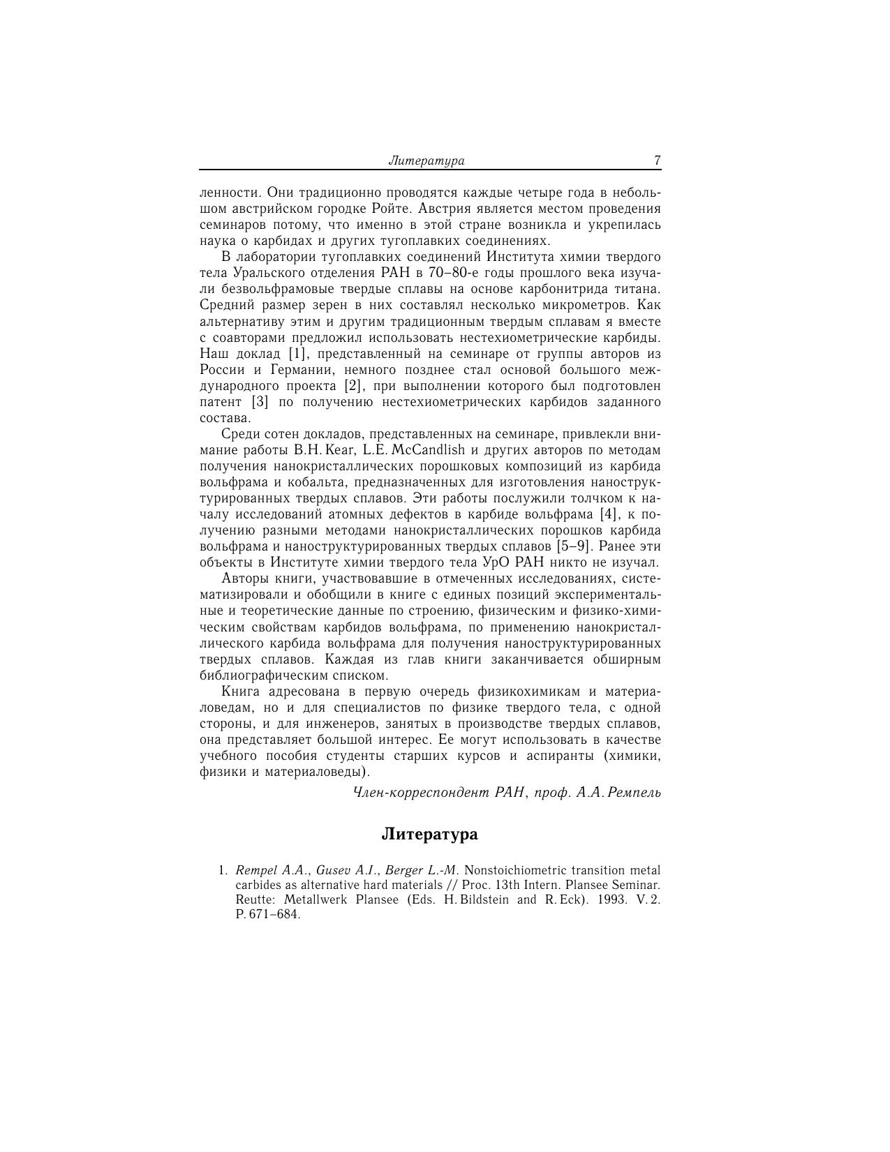 В монографии изложено современное состояние фундаментальных исследований карбидов вольфрама, широко применяемых в технике. Проведен симметрийный анализ превращений беспорядок–порядок и порядок–порядок в низших нестехиометрических карбидах вольфрама W 2 C, описаны фазовые равновесия в системе вольфрам–углерод и родственных тройных системах, построена равновесная фазовая диаграмма системы W–C. Впервые описаны методы синтеза карбидов вольфрама с разным размером частиц (зерен) — от крупнозернистых до нанокристаллических, обсужден дифракционный метод оценки размера малых частиц и микронапряжений, рассмотрена зависимость стабильности состава карбидов вольфрама при высоких температурах на воздухе и в вакууме от размера частиц (зерен). Описаны особенности применения нанокристаллического монокарбида вольфрама для получения наноструктурированных твердых сплавов. Для научных работников и специалистов в области физики и химии твердого тела, физического материаловедения, нанокристаллического состояния вещества, а также для аспирантов и студентов соответствующих специальностей.