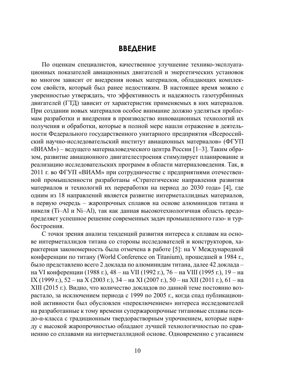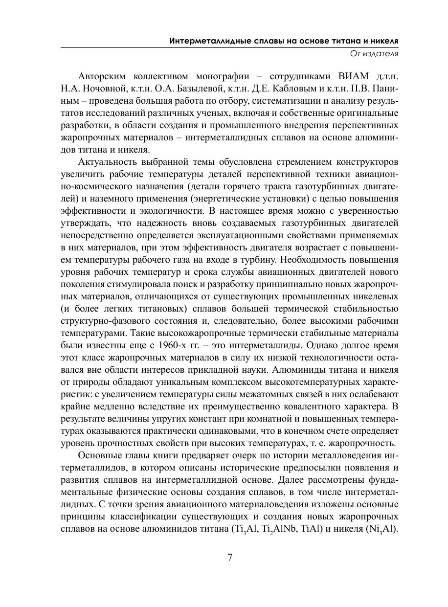энергетических установок. Приведены исторические аспекты появления и развития сплавов на интерметаллидной основе. С точки зрения авиационного материаловедения изложены основные принципы классификации существующих и создания новых жаропрочных сплавов на основе алюминидов титана и никеля. Рассмотрены актуальные вопросы освоения технологий производства полуфабрикатов и изделий из интерметаллидных сплавов. Отдельное внимание уделено опыту ВИАМ: приведены результаты оригинальных исследований авторов монографии с коллегами в области разработки и апробации интерметаллидных сплавов на основе TiAl и Ni3Al в сопоставлении с результатами зарубежных исследователей.