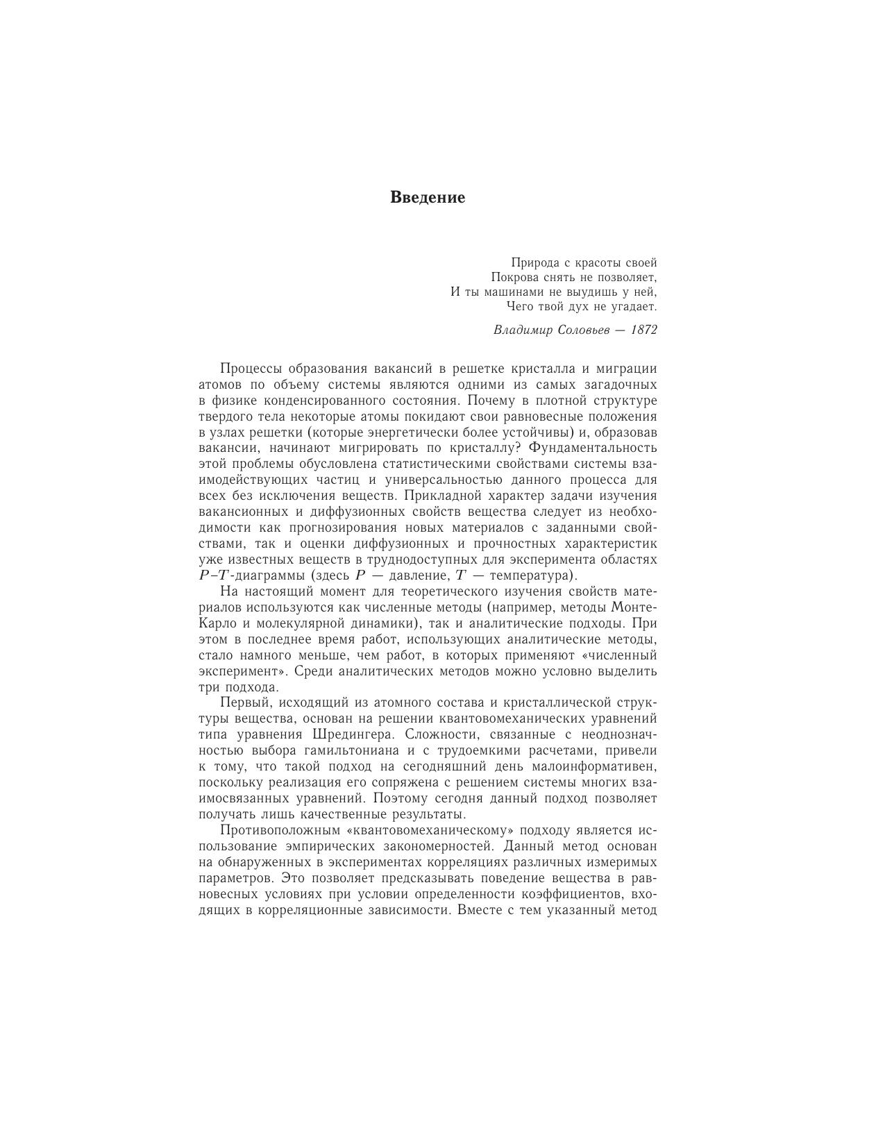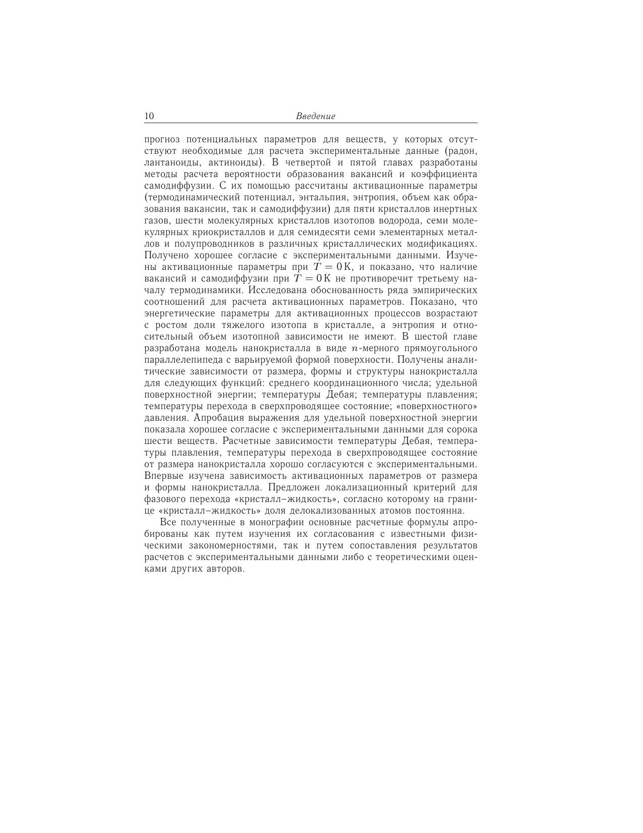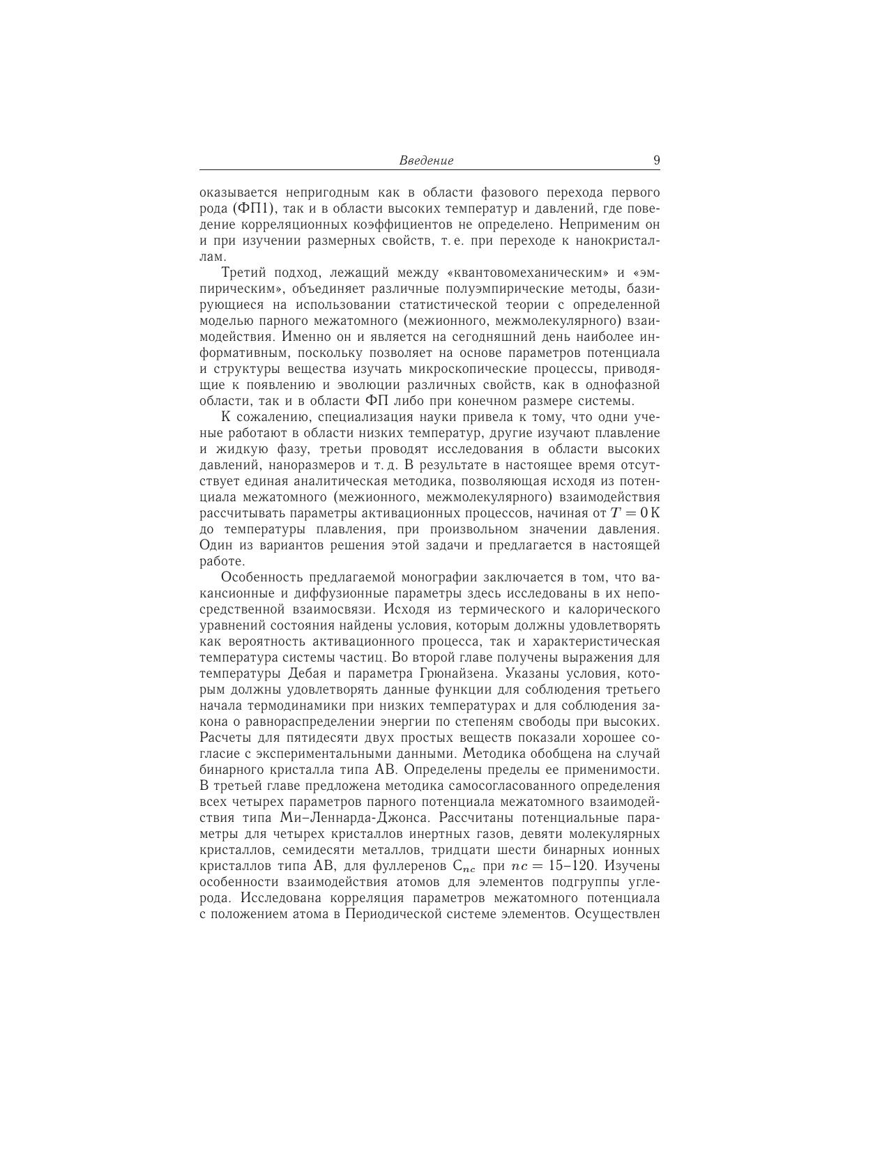 Монография посвящена изучению теплофизических свойств вещества, в частности параметров межатомного (или межмолекулярного) взаимодействия, параметров образования вакансий и самодиффузии в кристаллах. Излагаются современные методы расчета, а также оригинальные аналитические методики, разработанные автором. Впервые все параметры активационных процессов изучены, начиная от Т = 0 K и заканчивая температурой перехода в жидкую фазу. Параметры как потенциала взаимодействия, так и активационных процессов рассчитаны для всех элементов Периодической таблицы, ряда молекулярных квантовых криокристаллов, фуллеритов с различной массой фуллерена и бинарных кристаллов. Оценено изменение активационных параметров при вариации изотопного состава кристалла. Впервые эволюция параметров активационных процессов изучена как при уменьшении размера, так и при деформации формы нанокристаллов с различной структурой. Для научных работников, специализирующихся в области теплофизики и материаловедения.